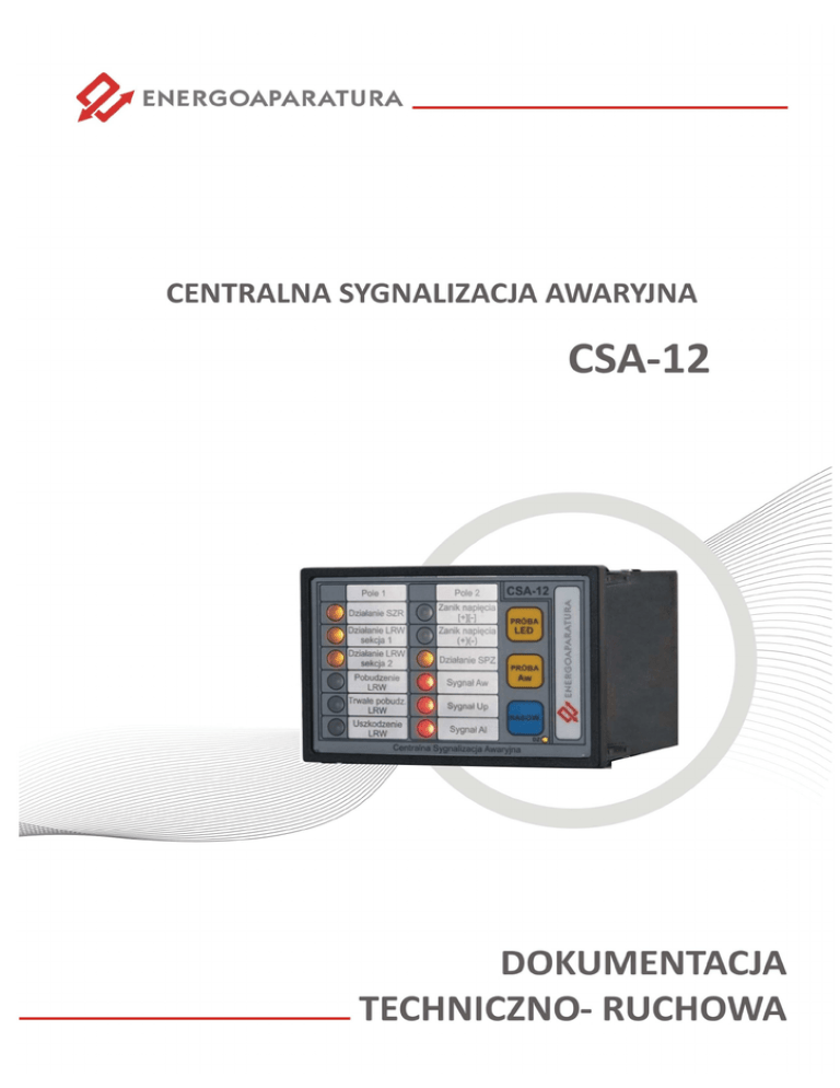 1. ZASTOSOWANIE Urządzenie CSA-12 służy do optycznej i akustycznej sygnalizacji zadziałania zabezpieczeń, oraz sygnalizowanie awarii i zakłóceń w pracy urządzeń elektroenergetycznych. Sygnalizacja zapewnia personelowi precyzyjną i szybką informację na temat pojawiających się zagrożeń. Urządzenie spełnia funkcje rejestratora zdarzeń. Dane z dziennika zdarzeń mogą być przekazywane do systemu nadzoru za pomocą łączy światłowodowych, RS232 lub RS485 2. BUDOWA Urządzenie wykonane jest w obudowie aluminiowej przystosowanej do montażu zatablicowego. Wymiary urządzenia przedstawiono na rys.1, 2 . Rys 1. Rysunek wymiarowy- widok urządzenia od frontu CSA-12 PRÓBA LED PRÓBA Aw KASOW. DZ Centralna Sygnalizacja Awaryjna Rys. 1 Widok urządzenia od frontu DTR-CSA12_03.2016 2 U02 IEC 870-5-103 ENAP RXD TXD A B GND TXD RXD USB U04 U08 U12 U16 U20 U24 Rys 2. Rysunek wymiarowy- widok urządzenia od strony wyprowadzeń Urządzenie składa się z kart: wejściowej WES-1; 7 wejść dwustanowych izolowanych (adres U24), wejściowej WES-1; 7 wejść dwustanowych izolowanych (adres U20), wejściowej WES-1; 7 wejść dwustanowych izolowanych (adres U16), wyjściowej WYS-1; 7 niezależnych przekaźników powielających (adres U12), wyjściowej WYS-1; 7 niezależnych przekaźników powielających (adres U08)- opcja, logika sygnalizacji LOS-1 (adres U02), zasilacza 220VDC/AC na 12VDC typ. ZAS-1 (adres U04), karty frontowej z diodami LED, WY12LED-1, Karty i listwy zaciskowe widoczne są z tyłu urządzenia CSA-12 zgodnie z rys.2. DTR-CSA12_03.2016 3 Znaczenie poszczególnych pinów opisano w poniższej tabeli 1. PIN adres U16 1 Wejście 1 (220 DC/AC) Wejście 8 Wejście 15 (220 DC/AC) (220 DC/AC) Wyjście 1 Wejście 2 (220 DC/AC) Wejście 9 Wejście 16 (220 DC/AC) (220 DC/AC) Wyjście 2 Wyjście 9 Wejście 3 (220 DC/AC) Wejście 10 Wejście 17 (220 DC/AC) (220 DC/AC) Wyjście 3 Wyjście 10 Wyjście 4 Wyjście 11 Wyjście 5 Wyjście 12 2 3 4 5 6 7 8 9 10 11 12 13 14 Wejście 4 (220 DC/AC) Wejście 5 (220 DC/AC) adres U20 adres U24 adres U08 adres U12 Kasowanie akustyki (220 DC/AC) Próba Wejście 12 akustyki (220 DC/AC) (220 DC/AC) Wejście 11 (220 DC/AC) Wyjście 8 adres U04 +220 AC/DC -220 AC/DC Wejście 6 (220 DC/AC) Wejście 13 Próba LED (220 DC/AC) (220 DC/AC) Wyjście 6 Wyjście 13 Wejście 7 (220 DC/AC) Wejście 14 Kasowanie (220 DC/AC) (220 DC/AC) Wyjście 7 Wyjście 14 Wyjście "sprawny" Tab.1 Opis wyprowadzeń kart Zasilanie urządzenia wykonane jest jedną przetwornicą na napięcie 220V AC/DC. Karty wejść wyposażone są w siedem niezależnych izolowanych torów, do których doprowadza się zakłócenia. Wyjścia powielające są programowalne – tzn. programowo przyporządkowuje się sygnał do dowolnego powielenia od 1-7. Dodatkowo wyprowadzone są wejścia sterujące. 2.1. DIODY SYGNALIZACYJNE I POLA OPISOWE Diody sygnalizacyjne 8[mm] są diodami RGB. Wybór koloru dokonywany jest programowo. Obok każdej diody jest pole opisowe o wymiarach [30x11]. Nad każdą grupą 6 sygnałów LED można umieścić opis zbiorczy o wymiarach [30x9]. 2.5. REJESTRATOR ZDARZEŃ Pamięć urządzenia CSA-12 umożliwia zapisanie do 100 zdarzeń. Urządzenie wyposażone jest w 2 porty komunikacyjne. port USB/RS232/RS485 – protokół firmowy EN-1 (standard) port światłowodowy ST – komunikacja z systemem nadzoru IEC 870-5-103 (opcja) DTR-CSA12_03.2016 4 3. MONTAŻ Prawidłowy montaż wymaga wycięcia otworu 139x91. Obudowa wyposażona jest w uchwyty umożliwiające mocowanie zatablicowe. Rys 5. Otwór montażowy urządzenia CSA-12 DTR-CSA12_03.2016 5 4. ZASADA DZIAŁANIA Układ wejść i wyjść oraz układ zasilania w urządzeniu CSA-16 standardowo wykonany jest na napięcie 220V DC/AC. Wejściami dostarczona jest informacja o zakłóceniach. Każda sygnalizacja wyposażona jest w 16 diod RGB o średnicy 8[mm] sygnalizujące zakłócenie (kolor wybiera się programowo). Sygnały wejściowe torów zakłóceniowych mogą być podawane poprzez podanie napięcia lub jego brak. Zakłócenie może być programowo opóźnione do 25sek. Zakłócenie powoduje uruchomienie migowego światła o częstotliwości 2Hz. Uruchomiony sygnał dźwiękowy blokuje możliwość kasowania LED. Po skasowaniu akustyki można skasować sygnały optyczne. Jeżeli zakłócenie trwa nadal sygnał przechodzi w stan świecenia ciągłego. Jeżeli zakłócenie było przemijające to po skasowaniu sygnał optyczny jest wygaszony oczekując na ponowne zakłócenia. Każdy z torów zakłóceniowych może być przyporządkowany do dowolnego toru akustyki Aw, Up, Al. Każdy tor zakłóceniowy wyposażony jest w blokadę od nadmiaru napływających zdarzeń z uszkodzonego lub wzbudzonego wejścia. Blokada jest konfigurowana programowo. Dodatkowo można uruchomić sygnalizację od sygnału zanikającego. Sygnał, który zaniknie uruchamia światło migowe wolne o częstotliwości 0,5Hz oraz może uaktywnić sygnał Al. Sygnały migowe wolne kasowane są tym samym przyciskiem ‘’Kasowanie’’. Jeżeli sygnalizacja wyposażona jest w sygnały powielające zakłócenia, to przekaźniki powielające zamykają zestyki w momencie kiedy zakłócenie zostało uznane za zdarzenie to znaczy po czasie nastawionym przez użytkownika. Urządzenie wyposażone jest w łącze światłowodowe ST (opcja) umożliwiające podłączenie do systemu nadzoru po protokole IEC 870-5-103. Łącze można wykorzystać, jako łącze inżynierskie ustawiając na tym kanale protokół ENAP. Podstawowym kanałem komunikacyjnym jest łącze USB służące do zmiany nastaw i konfiguracji. DTR-CSA12_03.2016 6 DANE TECHNICZNE Dane ogólne Izolacja Komunikacja Wyjścia sterujące Wejścia sygnałowe Napięcie zasilające 5. Napięcie zasilające UN 1 x 220V DC / 230V AC Dopuszczalny zakres napięcia od 0,8xUN do 1,15xUN Pobór mocy < 10W Liczba wejść 21 Liczba diod LED 12 (żółto-czerwone 8mm) Izolacja optyczna Napięcie sygnałów wejściowych U