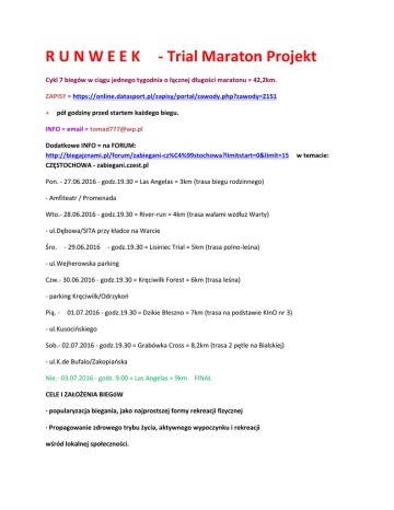 RUNWEEK - Trial Maraton Projekt Cykl 7 biegów w ciągu jednego tygodnia o łącznej długości maratonu = 42,2km. ZAPISY = https://online.datasport.pl/zapisy/portal/zawody.php?zawody=2151 + pół godziny przed startem każdego biegu. INFO = email = [email protected] Dodatkowe INFO = na FORUM: http://biegajznami.pl/forum/zabiegani-cz%C4%99stochowa?limitstart=0&limit=15 CZĘSTOCHOWA - zabiegani.czest.pl Pon. - 27.06.2016 - godz.19.30 = Las Angelas = 3km (trasa biegu rodzinnego) - Amfiteatr / Promenada Wto.- 28.06.2016 - godz.19.30 = River-run = 4km (trasa wałami wzdłuż Warty) - ul.Dębowa/SITA przy kładce na Warcie Śro. - 29.06.2016 - godz.19.30 = Lisiniec Trial = 5km (trasa polno-leśna) - ul.Wejherowska parking Czw.- 30.06.2016 - godz.19.30 = Kręciwilk Forest = 6km (trasa leśna) - parking Kręciwilk/Odrzykoń Pią. - 01.07.2016 - godz.19.30 = Dzikie Błeszno = 7km (trasa na podstawie KInO nr 3) - ul.Kusocińskiego Sob.- 02.07.2016 - godz.19.30 = Grabówka Cross = 8,2km (trasa 2 pętle na Bialskiej) - ul.K.de Bufalo/Zakopiańska Nie.- 03.07.2016 - godz. 9.00 = Las Angelas = 9km FINAŁ CELE I ZAŁOŻENIA BIEGóW · popularyzacja biegania, jako najprostszej formy rekreacji fizycznej · Propagowanie zdrowego trybu życia, aktywnego wypoczynku i rekreacji wśród lokalnej społeczności. w temacie: · przybliżenie oraz integracja uczestników ze środowiskiem KLA "Zabiegani Cz-wa" · rywalizacja sportowa TRASY BIEGóW • Nawierzchnia - przełaj=ścieżki i drogi polne i leśne oraz szutry (w 90%) WARUNKI UCZESTNICTWA Limit uczestników = 80-100 osób.??? • Impreza ma charakter otwarty. Prawo uczestnictwa mają osoby pełnoletnie oraz osoby w wieku 14-18 lat(r.1998-2002), jeśli mają pisemną zgodę opiekunów prawnych(rodziców). • Warunkiem dopuszczenia do biegu jest przedstawienie przez uczestnika zaświadczenia lekarskiego o braku przeciwwskazań do udziału w biegu lub złożenie podpisanego własnoręcznie oświadczenia o zdolności do udziału w biegu. • Każdy uczestnik startuje na własną odpowiedzialność (w przypadku zawodników odpowiedzialność rodziców lub prawnych opiekunów). niepełnoletnich na • Uczestnik musi dokonać osobistej rejestracji w biurze zawodów. • Opłata startowa - zależy od tego na ile wyceniasz pomysł i wysiłek organizatora ale minimum wzwyż (za każdy bieg) - ile kto wrzuci do skarbonki. :)) • Każdy uczestnik ma obowiązek przymocować numer startowy z przodu tak, dobrze widoczny podczas przekraczania mety. 1zł i aby był bardzo • Pobranie numeru startowego przez zawodnika jest równoznaczne z akceptacją regulaminu biegu. • Pomiar czasu - ręczny (chronometr Seiko) POSTANOWIENIA KOŃCOWE: • Bieg odbędzie się bez względu na pogodę. • Organizatorzy nie zapewniają opieki lekarskiej w trakcie trwania imprezy biegowej • Organizatorzy nie zapewniają szatni, natrysków i toalet w trakcie trwania imprezy. • Zawodnicy ubezpieczają się we własnym zakresie. Organizator nie ubezpiecza zawodników zawodów. na czas • Organizator nie ponosi odpowiedzialności materialnej za rzeczy zaginione w trakcie trwania zawodów. • Wszyscy zawodnicy proszeni są o niezaśmiecanie trasy biegu i szczególną troskę o środowisko naturalne. • Używać można jedynie oficjalnych numerów startowych. • Przy rejestracji każda osoba może podać przynależność klubową lub które chce reprezentować. miasto/dzielnicę, szkołe, • Uczestnik biegu wypełniając i podpisując kartę zgłoszeniową akceptuje warunki niniejszego regulaminu • Zawodnicy wyrażają zgodę na przetwarzanie ich danych osobowych dla potrzeb wewnętrznych organizatora imprezy oraz na nieodpłatne wykorzystanie ich wizerunku w materiałach informacyjnych i reklamowych.