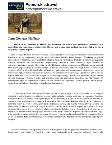 Pomorskie.travel http://pomorskie.travel Jean Georges Haffner Urodził się w Colmarze w Alzacji. Był lekarzem, ale dzisiaj jest pamiętany i czczony jako pomysłodawca sopockiego uzdrowiska. Biorąc pod uwagę jego zasługi, nie dziwi fakt, że bywa nazywany "ojcem Sopotu". Jean Georges Haffner przybył w okolice Gdańska przybył jako wojskowy lekarz w armii Napoleona Bonaparte, w jej niepowstrzymanym pochodzie przez kolejne kraje Europy. Wojskowy przydział umieścił go w Gdańsku, który Napoleon określał mianem "Gibraltaru Bałtyku" i uczynił na papierze wolnym miastem. W rzeczywistości napoleońscy urzędnicy łupili Miasto i jego ludność w najbezwzględniejszy sposób. Szczęśliwym dla Haffnera trafem gubernatorem Gdańska został generał Jean Rapp, jego ziomek i szkolny kolega. Z takimi stosunkami Haffner mógł wiele, a plany miał poważne. Oprócz lekarskiej praktyki był bowiem zwolennikiem i propagatorem higieny oraz wiary w zbawienny wpływ morskich kąpieli na zdrowie. Na polecenie swojego kolegi i protektora już w rok po zajęciu Gdańska przez Francuzów rozpoczął Haffner organizację kąpieliska w Brzeźnie. W ten sposób nic nie znacząca rybacka wioska nad morzem stała się pierwszym kurortem nad Bałtykiem. W zamierzeniu było to wprawdzie kąpielisko dla francuskich żołnierzy, szybko jednak, mocą mody, pojawili się naśladowcy kąpielowych zachowań Francuzów. Po rosyjskiej klęsce Napoleona Haffner nie wrócił do Francji. Został w Gdańsku, a na miejsce realizacji swoich życiowych planów wybrał małą rybacką wioskę nad samym morzem. Podobno zdecydował o tej lokalizacji kiedy ujrzał Sopot po raz pierwszy, uznając, że ma on doskonałe warunki by otworzyć tam kąpielisko, a z czasem doprowadzić do powstania kurortu. Ożenił się w Gdańsku z zamożną wdową, leczył ludzi, prowadził publiczną łaźnię, ale każdą wolną chwilę spędzał na planowaniu, a wkrótce realizacji zamysłów, który zawdzięczamy istnienie Sopotu jako miasta. Po jego gospodarskim okiem i przy poparciu władz, powstawały kolejne obiekty kąpiekowe i rekreacyjne w Sopocie, skupione wokół dzisiejszego Skweru Kuracyjnego. Moda na kąpiele zataczała szerokie kręgi, więc gości było coraz więcej. W ciągu paru lat senna rybacka osada przekształciła się w uzdrowisko, a 20-30 lat później była kurortem mogącym śmiało konkurować z renomowanymi ośrodkami tego typu w Europie. Doktor Haffner ma ładny pomnik w Parku Północnym w Sopocie, jego imię nosi także pobliska ulica. Pamiętano o nim także w Brzeźnie, które swój nadmorski park nazwało imieniem założyciela 1/2 Pomorskie.travel http://pomorskie.travel brzeźnieńskiego kąpieliska. Magdalena Piotrowska (m.piotrowska) 2/2 Powered by TCPDF (www.tcpdf.org)