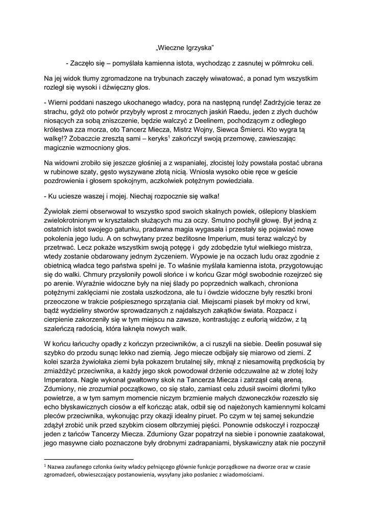 „Wieczne Igrzyska” - Zaczęło się – pomyślała kamienna istota, wychodząc z zasnutej w półmroku celi. Na jej widok tłumy zgromadzone na trybunach zaczęły wiwatować, a ponad tym wszystkim rozległ się wysoki i dźwięczny głos. - Wierni poddani naszego ukochanego władcy, pora na następną rundę! Zadrżyjcie teraz ze strachu, gdyż oto potwór przybyły wprost z mrocznych jaskiń Raedu, jeden z złych duchów niosących za sobą zniszczenie, będzie walczyć z Deelinem, pochodzącym z odległego królestwa zza morza, oto Tancerz Miecza, Mistrz Wojny, Siewca Śmierci. Kto wygra tą walkę!? Zobaczcie zresztą sami – keryks1 zakończył swoją przemowę, zawieszając magicznie wzmocniony głos. Na widowni zrobiło się jeszcze głośniej a z wspaniałej, złocistej loży powstała postać ubrana w rubinowe szaty, gęsto wyszywane złotą nicią. Wniosła wysoko obie ręce w geście pozdrowienia i głosem spokojnym, aczkolwiek potężnym powiedziała. - Ku uciesze waszej i mojej. Niechaj rozpocznie się walka! Żywiołak ziemi obserwował to wszystko spod swoich skalnych powiek, oślepiony blaskiem zwielokrotnionym w kryształach służących mu za oczy. Smutno pochylił głowę. Był jedną z ostatnich istot swojego gatunku, pradawna magia wygasała i przestały się pojawiać nowe pokolenia jego ludu. A on schwytany przez bezlitosne Imperium, musi teraz walczyć by przetrwać. Lecz pokaże wszystkim swoją potęgę i gdy zdobędzie tytuł wielkiego mistrza, wtedy zostanie obdarowany jednym życzeniem. Wypowie je na oczach ludu oraz zgodnie z obietnicą władca tego państwa spełni je. To właśnie myślała kamienna istota, przygotowując się do walki. Chmury przysłoniły powoli słońce i w końcu Gzar mógł swobodnie rozejrzeć się po arenie. Wyraźnie widoczne były na niej ślady po poprzednich walkach, chroniona potężnymi zaklęciami nie została uszkodzona, ale tu i ówdzie widoczne były resztki broni przeoczone w trakcie pośpiesznego sprzątania ciał. Miejscami piasek był mokry od krwi, bądź wydzieliny stworów sprowadzanych z najdalszych zakątków świata. Rozpacz i cierpienie zakorzeniły się w tym miejscu na zawsze, kontrastując z euforią widzów, z tą szaleńczą radością, która łaknęła nowych walk. W końcu łańcuchy opadły z kończyn przeciwników, a ci ruszyli na siebie. Deelin posuwał się szybko do przodu sunąc lekko nad ziemią. Jego miecze odbijały się miarowo od ziemi. Z kolei szarża żywiołaka ziemi była pokazem brutalnej siły, mknął z niesamowitą prędkością by zmiażdżyć przeciwnika, a każdy jego skok powodował drżenie odczuwalne aż w złotej loży Imperatora. Nagle wykonał gwałtowny skok na Tancerza Miecza i zatrząsł całą areną. Zdumiony, nie zrozumiał początkowo, co się stało, zamiast celu zdusił swoimi dłońmi tylko powietrze, a w tym samym momencie niczym brzmienie małych dzwoneczków rozeszło się echo błyskawicznych ciosów a elf kończąc atak, odbił się od najeżonych kamiennymi kolcami pleców przeciwnika, wykonując przy okazji idealny piruet. Po czym w tej samej sekundzie zdążył zrobić unik przed szybkim ciosem olbrzymiej pięści. Ponownie odskoczył i rozpoczął jeden z tańców Tancerzy Miecza. Zdumiony Gzar popatrzył na siebie i ponownie zaatakował, jego masywne ciało poznaczone były drobnymi zadrapaniami, błyskawiczny atak nie poczynił 1 Nazwa zaufanego członka świty władcy pełniącego głównie funkcje porządkowe na dworze oraz w czasie zgromadzeń, obwieszczający postanowienia, wysyłany jako posłaniec z wiadomościami. praktycznie żadnych szkód. Tym razem jednak walka toczyła się ostrożniej, potężna skalna istota była powolniejsza od smukłego wojownika, ale wystarczyłoby jej jedno trafienie. Na razie jednak niewiarygodna szybkość Mistrza Wojny, pozwalała na uniknięcie wszystkich ataków i wyprowadzanie kontr. Jednak dla twardej skóry żywiołaka ziemi znaczyły one tyle samo, co ukąszenia komara. Po chwili jednak sytuacja się zmieniła, inicjatywę przejął Mistrz Wojny, będąc w środku swojego śmiercionośnego Tańca, miejscami znikał nawet widzom z oczu, nie pozwalał na żadne działanie, zasypywał przeciwnika gradem ciosów, powoli kamienny pancerz zaczął się nadkruszać, a wiecznie ostre miecze kontynuowały swoje dzieło. Gzar nie zamierzał jednak przegrać, z całych sił uderzył w podłoże areny, wpierw wywołał mocny wstrząs, który odrobinę odrzucił wroga, samą falą uderzeniową. Przedarł się również swoją wolą przez pokłady piasku, by dotrzeć do uśpionej potęgi ziemi, potęgi, z której został zrodzony. Przywołał niesamowicie silne trzęsienie ziemi, przez które w promieniu wielu mil budynki się waliły, drzewa padały, ale arenę przebiegł jedynie lekki dreszcz. Magowie oceniwszy, że owy atak zagraża budowli, ograniczyli jego działanie na tym terenie. Widownia szalała, walka, chociaż nie krwawa była widowiskowa i rozbudziła ich emocje. Jednak już się skończyła, Deelin czekał tylko na błąd przeciwnika, a stanąwszy bezpiecznie na ziemi natychmiast go wykorzystał. Przemieścił się błyskawicznie i odrzucając jeden miecz, drugi wbił z całych sił w lukę, która się pojawiła pomiędzy kamiennymi płytami na plecach i przebiwszy miękką glinę, z jakiej składało się wnętrze przeciwnika, rozbił jego kryształowe serce. Natychmiast odskoczył, gdyż normalnie w wypadku śmierci magia rozsadzała ciało tych, którzy jej używali. Jednak teraz kamienna istota przypominająca człowieka upadła na kolana, a cała arena skąpała się w oślepiającym niebieskim blasku. - Potworze! Ty, który bawisz się życiem niewinnych istot i zmuszasz je do walki, bądź przeklęty! Mój gniew zasili tą ziemię i obdarzy życiem moich pobratymców. Pamiętaj jednak, jeżeli zabijesz bądź zniewolisz jednego z moich braci lub sióstr, dopełni się czar i ziemia pod twoim panowa