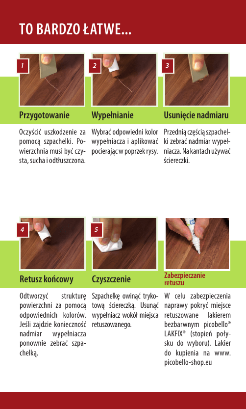TO BARDZO ŁATWE... 1 2 3 Przygotowanie Wypełnianie Usunięcie nadmiaru Oczyścić uszkodzenie za Wybrać odpowiedni kolor pomocą szpachelki. Po- wypełniacza i aplikować wierzchnia musi być czy- pocierając w poprzek rysy. sta, sucha i odtłuszczona. 4 Przednią częścią szpachelki zebrać nadmiar wypełniacza. Na kantach używać ściereczki. 5 Retusz końcowy Czyszczenie Zabezpieczanie retuszu Odtworzyć strukturę powierzchni za pomocą odpowiednich kolorów. Jeśli zajdzie konieczność nadmiar wypełniacza ponownie zebrać szpachelką. Szpachelkę owinąć trykotową ściereczką. Usunąć wypełniacz wokół miejsca retuszowanego. W celu zabezpieczenia naprawy pokryć miejsce retuszowane lakierem bezbarwnym picobello® LAKFIX® (stopień połysku do wyboru). Lakier do kupienia na www. picobello-shop.eu