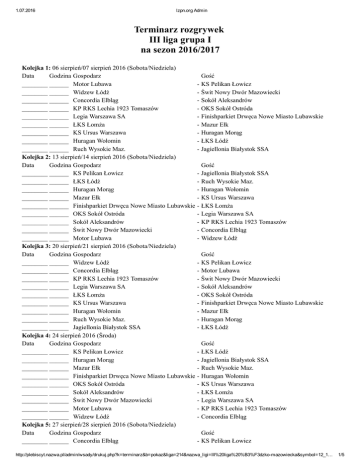 1.07.2016 lzpn.org Admin Terminarz rozgrywek III liga grupa I na sezon 2016/2017 Kolejka 1: 06 sierpień/07 sierpień 2016 (Sobota/Niedziela) Data Godzina Gospodarz ________ ______ Motor Lubawa ________ ______ Widzew Łódź ________ ______ Concordia Elbląg ________ ______ KP RKS Lechia 1923 Tomaszów ________ ______ Legia Warszawa SA ________ ______ ŁKS Łomża ________ ______ KS Ursus Warszawa ________ ______ Huragan Wołomin ________ ______ Ruch Wysokie Maz. Kolejka 2: 13 sierpień/14 sierpień 2016 (Sobota/Niedziela) Data Godzina Gospodarz ________ ______ KS Pelikan Łowicz ________ ______ ŁKS Łódź ________ ______ Huragan Morąg ________ ______ Mazur Ełk ________ ______ Finishparkiet Drwęca Nowe Miasto Lubawskie ________ ______ OKS Sokół Ostróda ________ ______ Sokół Aleksandrów ________ ______ Świt Nowy Dwór Mazowiecki ________ ______ Motor Lubawa Kolejka 3: 20 sierpień/21 sierpień 2016 (Sobota/Niedziela) Data Godzina Gospodarz ________ ______ Widzew Łódź ________ ______ Concordia Elbląg ________ ______ KP RKS Lechia 1923 Tomaszów ________ ______ Legia Warszawa SA ________ ______ ŁKS Łomża ________ ______ KS Ursus Warszawa ________ ______ Huragan Wołomin ________ ______ Ruch Wysokie Maz. ________ ______ Jagiellonia Białystok SSA Kolejka 4: 24 sierpień 2016 (Środa) Data Godzina Gospodarz ________ ______ KS Pelikan Łowicz ________ ______ Huragan Morąg ________ ______ Mazur Ełk ________ ______ Finishparkiet Drwęca Nowe Miasto Lubawskie ________ ______ OKS Sokół Ostróda ________ ______ Sokół Aleksandrów ________ ______ Świt Nowy Dwór Mazowiecki ________ ______ Motor Lubawa ________ ______ Widzew Łódź Kolejka 5: 27 sierpień/28 sierpień 2016 (Sobota/Niedziela) Data Godzina Gospodarz ________ ______ Concordia Elbląg Gość KS Pelikan Łowicz Świt Nowy Dwór Mazowiecki Sokół Aleksandrów OKS Sokół Ostróda Finishparkiet Drwęca Nowe Miasto Lubawskie Mazur Ełk Huragan Morąg ŁKS Łódź Jagiellonia Białystok SSA Gość Jagiellonia Białystok SSA Ruch Wysokie Maz. Huragan Wołomin KS Ursus Warszawa ŁKS Łomża Legia Warszawa SA KP RKS Lechia 1923 Tomaszów Concordia Elbląg Widzew Łódź Gość KS Pelikan Łowicz Motor Lubawa Świt Nowy Dwór Mazowiecki Sokół Aleksandrów OKS Sokół Ostróda Finishparkiet Drwęca Nowe Miasto Lubawskie Mazur Ełk Huragan Morąg ŁKS Łódź Gość ŁKS Łódź Jagiellonia Białystok SSA Ruch Wysokie Maz. Huragan Wołomin KS Ursus Warszawa ŁKS Łomża Legia Warszawa SA KP RKS Lechia 1923 Tomaszów Concordia Elbląg Gość KS Pelikan Łowicz http://plebiscyt.nazwa.pl/admin/wsady/drukuj.php?k=terminarz&b=pokaz&liga=214&nazwa_ligi=III%20liga%20%B3%F3dzkomazowiecka&symbol=12_1… 1/5 1.07.2016 lzpn.org Admin ________ ______ Widzew Łódź KP RKS Lechia 1923 Tomaszów ________ ______ Legia Warszawa SA Motor Lubawa ________ ______ ŁKS Łomża Świt Nowy Dwór Mazowiecki ________ ______ KS Ursus Warszawa Sokół Aleksandrów ________ ______ Huragan Wołomin OKS Sokół Ostróda ________ ______ Ruch Wysokie Maz. Finishparkiet Drwęca Nowe Miasto Lubawskie ________ ______ Jagiellonia Białystok SSA Mazur Ełk ________ ______ ŁKS Łódź Huragan Morąg Kolejka 6: 03 wrzesień/04 wrzesień 2016 (Sobota/Niedziela) Data Godzina Gospodarz Gość ________ ______ KS Pelikan Łowicz Huragan Morąg ________ ______ Mazur Ełk ŁKS Łódź ________ ______ Finishparkiet Drwęca Nowe Miasto Lubawskie Jagiellonia Białystok SSA ________ ______ OKS Sokół Ostróda Ruch Wysokie Maz. ________ ______ Sokół Aleksandrów Huragan Wołomin ________ ______ Świt Nowy Dwór Mazowiecki KS Ursus Warszawa ________ ______ Motor Lubawa ŁKS Łomża ________ ______ Legia Warszawa SA Widzew Łódź ________ ______ Concordia Elbląg KP RKS Lechia 1923 Tomaszów Kolejka 7: 10 wrzesień/11 wrzesień 2016 (Sobota/Niedziela) Data Godzina Gospodarz Gość ________ ______ KP RKS Lechia 1923 Tomaszów KS Pelikan Łowicz ________ ______ Legia Warszawa SA Concordia Elbląg ________ ______ ŁKS Łomża Widzew Łódź ________ ______ KS Ursus Warszawa Motor Lubawa ________ ______ Huragan Wołomin Świt Nowy Dwór Mazowiecki ________ ______ Ruch Wysokie Maz. Sokół Aleksandrów ________ ______ Jagiellonia Białystok SSA OKS Sokół Ostróda ________ ______ ŁKS Łódź Finishparkiet Drwęca Nowe Miasto Lubawskie ________ ______ Huragan Morąg Mazur Ełk Kolejka 8: 17 wrzesień/18 wrzesień 2016 (Sobota/Niedziela) Data Godzina Gospodarz Gość ________ ______ KS Pelikan Łowicz Mazur Ełk ________ ______ Finishparkiet Drwęca Nowe Miasto Lubawskie Huragan Morąg ________ ______ OKS Sokół Ostróda ŁKS Łódź ________ ______ Sokół Aleksandrów Jagiellonia Białystok SSA ________ ______ Świt Nowy Dwór Mazowiecki Ruch Wysokie Maz. ________ ______ Motor Lubawa Huragan Wołomin ________ ______ Widzew Łódź KS Ursus Warszawa ________ ______ Concordia Elbląg ŁKS Łomża ________ ______ KP RKS Lechia 1923 Tomaszów Legia Warszawa SA Kolejka 9: 24 wrzesień/25 wrzesień 2016 (Sobota/Niedziela) Data Godzina Gospodarz Gość ________ ______ Legia Warszawa SA KS Pelikan Łowicz ________ ______ ŁKS Łomża KP RKS Lechia 1923 Tomaszów ________ ______ KS Ursus Warszawa Concordia Elbląg ________ ______ Huragan Wołomin Widzew Łódź ________ ______ Ruch Wysokie Maz. Motor Lubawa ________ ______ Jagiellonia Białystok SSA Świt Nowy Dwór Mazowiecki ________ ______ ŁKS Łódź Sokół Aleksandrów ________ ______ Huragan Morąg OKS Sokół Ostróda ________ ______ Mazur Ełk Finishparkiet Drwęca Nowe Miasto Lubawskie Kolejka 10: 01 październik/02 październik 2016 (Sobota/Niedziela) http://plebiscyt.nazwa.pl/admin/wsady/drukuj.php?k=terminarz&b=pokaz&liga=214&nazwa_ligi=III%20liga%20%B3%F3dzkomazowiecka&symbol=12_1… 2/5 1.07.2016 lzpn.org Admin Data Godzina Gospodarz Gość ________ ______ KS Pelikan Łowicz Finishparkiet Drwęca Nowe Miasto Lubawskie ________ ______ OKS Sokół Ostróda Mazur Ełk ________ ______ Sokół Aleksandrów Huragan M