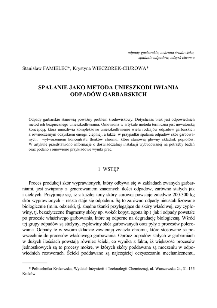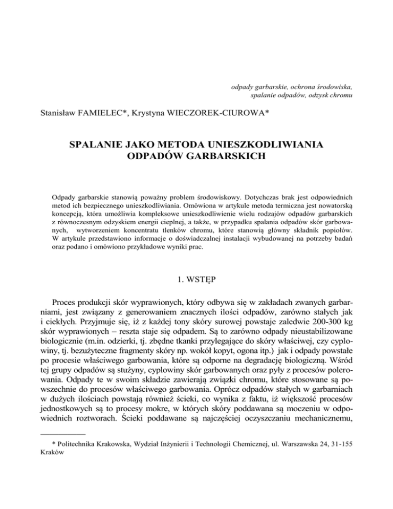 odpady garbarskie, ochrona środowiska, spalanie odpadów, odzysk chromu Stanisław FAMIELEC*, Krystyna WIECZOREK-CIUROWA* SPALANIE JAKO METODA UNIESZKODLIWIANIA ODPADÓW GARBARSKICH Odpady garbarskie stanowią poważny problem środowiskowy. Dotychczas brak jest odpowiednich metod ich bezpiecznego unieszkodliwiania. Omówiona w artykule metoda termiczna jest nowatorską koncepcją, która umożliwia kompleksowe unieszkodliwienie wielu rodzajów odpadów garbarskich z równoczesnym odzyskiem energii cieplnej, a także, w przypadku spalania odpadów skór garbowanych, wytworzeniem koncentratu tlenków chromu, które stanowią główny składnik popiołów. W artykule przedstawiono informacje o doświadczalnej instalacji wybudowanej na potrzeby badań oraz podano i omówiono przykładowe wyniki prac. 1. WSTĘP Proces produkcji skór wyprawionych, który odbywa się w zakładach zwanych garbarniami, jest związany z generowaniem znacznych ilości odpadów, zarówno stałych jak i ciekłych. Przyjmuje się, iż z każdej tony skóry surowej powstaje zaledwie 200-300 kg skór wyprawionych – reszta staje się odpadem. Są to zarówno odpady nieustabilizowane biologicznie (m.in. odzierki, tj. zbędne tkanki przylegające do skóry właściwej, czy cyplowiny, tj. bezużyteczne fragmenty skóry np. wokół kopyt, ogona itp.) jak i odpady powstałe po procesie właściwego garbowania, które są odporne na degradację biologiczną. Wśród tej grupy odpadów są stużyny, cyplowiny skór garbowanych oraz pyły z procesów polerowania. Odpady te w swoim składzie zawierają związki chromu, które stosowane są powszechnie do procesów właściwego garbowania. Oprócz odpadów stałych w garbarniach w dużych ilościach powstają również ścieki, co wynika z faktu, iż większość procesów jednostkowych są to procesy mokre, w których skóry poddawana są moczeniu w odpowiednich roztworach. Ścieki poddawane są najczęściej oczyszczaniu mechanicznemu, __________ * Politechnika Krakowska, Wydział Inżynierii i Technologii Chemicznej, ul. Warszawska 24, 31-155 Kraków 238 S. FAMIELEC, K. WIECZOREK-CIUROWA w trakcie którego powstają osady ściekowe, zawierające szereg substancji pochodzących z odczynników stosowanych w garbarstwie, m.in. związki chromu [1]. Schemat na rys. 1 przedstawia typowe ilości odpadów i ścieków powstających podczas obróbki skór. Rys. 1. Schemat bilansu masowego procesu garbowania skór [2] W ostatnich latach w Polsce produkuje się rocznie ok. 15 tys. Mg wyprawionych skór bydlęcych, co pozwala zakładać, iż stałych odpadów garbarskich powstaje ok. 25-40 tys. Mg w ciągu roku [3]. Unieszkodliwianie tych odpadów sprowadza się najczęściej do ich składowania, zwykle na przyzakładowych składowiskach. Inne metody, choć znane, są nieopłacalne ekonomicznie i w praktyce rzadko stosowane. 2. KONCEPCJA SYSTEMU DO TERMICZNEGO UNIESZKODLIWIANIA ODPADÓW GARBARSKICH Proces, który byłby alternatywą dla składowania odpadów powinien pozwalać na kompleksowe ich unieszkodliwianie (tj. obejmować wszystkie rodzaje odpadów garbarskich), powinien być bezpieczny dla środowiska, jak również umożliwiać osiąganie korzyści ma- Spalanie jako metoda unieszkodliwiania odpadów garbarskich 239 teriałowych czy też energetycznych. Opracowana przez pracowników Wydziału Inżynierii i Technologii Chemicznej Politechniki Krakowskiej koncepcja obejmuje spalenie odpadów garbarskich w piecu o odpowiedniej konstrukcji. Rozwiązanie to umożliwia odzysk ciepła oraz, w przypadku spalania odpadów garbowanych, pozyskanie w popiołach koncentratu chromowego (chrom z odpadów przechodzi jako tlenek chromu(III) do popiołów). Odpady garbarskie składają się głównie z materii organicznej, pozostałość mineralna po spaleniu wynosi ok. 10%. Badania laboratoryjne wykazały również, iż wartość opałowa odpadów jest stosunkowo duża, i w zależności od rodzajów odpadów wynosi 12-14 MJ/kg. Jedynie osady ściekowe charakteryzują się małą wartością opałową, nieprzekraczającą 1 MJ/kg. Problemem jest stosunkowo znaczna wilgotność odpadów, w przypadku niektórych grup (strużyny, odzierki) wynosząca ok. 50%. Dlatego też przed spaleniem odpadów powinny być one wysuszone. Właściwości fizykochemiczne odpadów garbarskich w aspekcie ich spalania przedstawiono w tabeli 1. Rozwiązaniem technologicznym umożliwiającym równoczesne suszenie i spalanie odpadów jest zastosowanie pieca tunelowego – odpady w pierwszej strefie pieca poddawane są suszeniu, następnie w kolejnej odgazowaniu, by w strefie o najwyższej temperaturze ulec spaleniu [4, 5]. Tabela 1. Właściwości fizykochemiczne odpadów garbarskich [6,7] Rodzaj odpadów Strużyny Osad ściekowy Pył Cyplowiny skór garbowanych Cyplowiny skór surowych Odzierki Całkowita zawartość substancji organicznej w suchej masie (% w/w) 87,5 65,5 87,4 Wilgotność (% w/w) Stała pozostałość po spaleniu (% w/w) Wartość opałowa w stanie roboczym (MJ/kg) 53,6 54,7 14,3 7,8 24,3 6,2 6,663 0,716 16,953 87,7 10,2 4,7 19,772 86,9 91,4 59,9 59,5 4,7 4,6 7,753 8,952 Rozwiązanie to zastosowano budując doświadczalną instalację do termicznego unieszkodliwiania odpadów garbarskich, która usytuowana została na terenie Krakowskich Zakładów Garbarskich S.A. na mocy obustronnego porozumienia z Politechniką Krakowską. Takie usytuowanie umożliwia bezpośredni dostęp do odpadów, jak również odzysk ciepła spalania poprzez podgrzewanie wody użytkowej dla potrzeb garbarni. Długość pieca tunelowego wynosi 7 m, jego przekrój: 60 na 60 cm. Odpady podawane są w specjalnych pojemnikach o perforowanym dnie (możliwa penetracja powietrza), które przesuwają się w tunelu pieca dzięki systemowi rolek. Wydajność instalacji wynosi 20-30 kg odpadów na godzinę. Piec wyposażony jest w grzałki elektryczne o łącznej mocy 90 kW, umożliwiające wstępne rozgrzanie urządzenia (zastosowanie pre