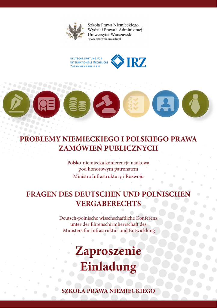 PROBLEMY NIEMIECKIEGO I POLSKIEGO PRAWA ZAMÓWIEŃ PUBLICZNYCH Polsko-niemiecka konferencja naukowa pod honorowym patronatem Ministra Infrastruktury i Rozwoju FRAGEN DES DEUTSCHEN UND POLNISCHEN VERGABERECHTS Deutsch-polnische wissenschaftliche Konferenz unter der Ehrenschirmherrschaft des Ministers für Infrastruktur und Entwicklung Zaproszenie Einladung SZKOŁA PRAWA NIEMIECKIEGO SZKOŁA PRAWA NIEMIECKIEGO PRZY WYDZIALE PRAWA I ADMINISTRACJI UNIWERSYTETU WARSZAWSKIEGO oraz NIEMIECKA FUNDACJA MIĘDZYNARODOWEJ WSPÓŁPRACY PRAWNEJ zapraszają na polsko-niemiecką konferencję naukową PROBLEMY NIEMIECKIEGO I POLSKIEGO PRAWA ZAMÓWIEŃ PUBLICZNYCH Data i miejsce: 4 kwietnia 2014 r., BUW, ul. Dobra 56/66, sala 256 RSVP: do 31 marca [email protected] ~~~~~~~~~~~~~~~~~~~~~~ ~~ DEUTSCHE RECHTSSCHULE AN DER FAKULTÄT FÜR RECHT UND VERWALTUNG UNIVERSITÄT WARSCHAU UND DEUTSCHE STIFTUNG FÜR INTERNATIONALE RECHTLICHE ZUSAMMENARBEIT geben sich die Ehre zur deutsch-polnischen wissenschaftlichen Konferenz FRAGEN DES DEUTSCHEN UND POLNISCHEN VERGABERECHTS am 4. April 2014 in der Universitätsbibliothek, Dobra Str. 56/66, Saal 256, einzuladen RSVP: bis zum 31. März [email protected] Zapewniamy tłumaczenie symultaniczne. Die Konferenz wird simultan gedolmetscht PROGRAM KONFERENCJI PROGRAMM DER KONFERENZ Panel 1/ I. Teil 10:00 – 11:30 Teoretyczne i praktyczne problemy w obszarze niemieckiego i polskiego prawa zamówień publicznych Rechtliche und praktische Probleme im deutschen und polnischen Vergaberecht 1. Hans-Werner Behrens, Przewodniczący 1. Izby ds. Zamówień Publicznych Federalnego Urzędu Kartelowego (Vorsitzender der 1. VergabeKammer, Bundeskartellamt): Problemy niemieckiego prawa zamówień publicznych / Probleme des deutschen Vergaberechts 2. Prof. dr hab. Andrzej Wach, Uniwersytet Warszawski (Universität Warschau): Problemy polskiego prawa zamówień publicznych / Probleme des polnischen Vergaberechts 11:30-12:00 Przerwa na kawę / Kaffeepause Panel II: 12:00-13:30 Postępowanie w sprawach z zakresu zamówień publicznych i ochrona prawna Vergabeverfahren und Rechtsschutz 1. Prof. Klaus Ferdinand Gärditz, Uniwersytet w Bonn (Universität Bonn): Niemieckie postępowanie i ochrona prawna w sprawach z zakresu zamówień publicznych Deutsches Vergabeverfahren und Rechtsschutz im Bereich des Vergaberechts 2. Mec. Aldona Kowalczyk, Kancelaria Salans FMC SNR Denton Oleszczuk sp. k. (Rechtsanwalt): Specyfika polskiego postępowania odwoławczego w zamówieniach publicznych – problemy i wyzwania Die Eigenart des polnischen Widerspruchsverfahrens im Vergaberecht - Fragestellungen und Herausforderungen 3. Mec. Marek Furtek, Kancelaria FKA Furtek Komosa Aleksandrowicz Sp.k. (Rechtsanwalt): Alternatywne metody rozstrzygania sporów dotyczących zamówień publicznych Alternative Streitbeilegungsmethoden im Bereich des Vergaberechts 13:30-14:30 Przerwa obiadowa/ Lunch Panel III: 14:30-16:00 Zamówienia publiczne z perspektywy przedsiębiorców Die Sicht der Unternehmen 1. Adw. Dr. Matthias Ganske, Kancelaria Redeker Sellner Dahs, Bonn (Rechtsanwalt): Problemy niemieckiego prawa zamówień publicznych z perspektywy przedsiębiorców Probleme des deutschen Vergaberechts aus der Sicht der Unternehmen 2. Adw. dr Damian Szczepański, Kancelaria Adwokacka Szczepańscy (Rechtsanwalt): Zasada swobody umów i jej ograniczenia w polskim prawie zamówień publicznych Vertragsfreiheit und ihre Schranken im polnischen Vergaberecht 3. Adw. Andrzej Wesołek, Kancelaria Nowakowski i Wspólnicy (Rechtsanwalt): Przedmiot zamówienia publicznego w kolejnictwie - kontrowersje i konflikty Der Gegenstand der Vergabe im Bereich des Eisenbahnwesens - Kontroversen und Konflikte PATRONAT HONOROWY / EHRENSCHIRMHERRSCHAFT ŻYCZLIWE WSPARCIE / FREUNDLICHE UNTERSTÜTZUNG WSPÓŁPRACA / ZUSAMMENARBEIT