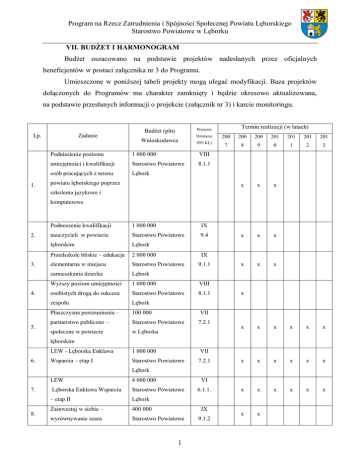 Program na Rzecz Zatrudnienia i Spójności Społecznej Powiatu Lęborskiego Starostwo Powiatowe w Lęborku VII. BUDŻET I HARMONOGRAM Budżet oszacowano na podstawie projektów nadesłanych przez oficjalnych beneficjentów w postaci załącznika nr 3 do Programu. Umieszczone w poniższej tabeli projekty mogą ulegać modyfikacji. Baza projektów dołączonych do Programów ma charakter zamknięty i będzie okresowo aktualizowana, na podstawie przesłanych informacji o projekcie (załącznik nr 3) i karcie monitoringu. Lp. 1. Zadanie Budżet (pln) Termin realizacji (w latach) Priorytet Wnioskodawca Działanie 200 200 200 201 201 201 201 (PO KL) 7 8 9 0 1 2 3 x x x x x x x x x x x x x x x x x x x x x x x x x x x x x Podniesienie poziomu 1 000 000 VIII umiejętności i kwalifikacji Starostwo Powiatowe 8.1.1 osób pracujących z terenu Lębork powiatu lęborskiego poprzez szkolenia językowe i komputerowe 2. 3. 4. 5. Podnoszenie kwalifikacji 1 000 000 IX nauczycieli w powiecie Starostwo Powiatowe 9.4 lęborskim Lębork Przedszkole bliskie – edukacja 2 000 000 elementarna w miejscu Starostwo Powiatowe zamieszkania dziecka Lębork Wyższy poziom umiejętności 1 000 000 VIII osobistych drogą do sukcesu Starostwo Powiatowe 8.1.1 zespołu Lębork Płaszczyzna porozumienia – 100 000 partnerstwo publiczno – Starostwo Powiatowe społeczne w powiecie w Lęborku IX 9.1.1 x VII 7.2.1 lęborskim 6. LEW - Lęborska Enklawa 1 000 000 Wsparcia – etap I Starostwo Powiatowe VII 7.2.1 Lębork 7. 8. LEW 4 000 000 VI Lęborska Enklawa Wsparcia Starostwo Powiatowe – etap II Lębork Zainwestuj w siebie – 400 000 wyrównywanie szans Starostwo Powiatowe 6.1.1. IX 1 9.1.2 Program na Rzecz Zatrudnienia i Spójności Społecznej Powiatu Lęborskiego Starostwo Powiatowe w Lęborku edukacyjnych w powiecie w Lęborku lęborskim 9. ABC turystyki z elementami 2 000 000 przedsiębiorczości jako Gmina Wicko VI 6.1.1 x alternatywne źródło dochodu 10. 11. Nie jesteś już sam 150 000 VII Gmina Wicko 7.2.1 Dostosowanie umiejętności do 250 000 VIII międzynarodowego rynku Gmina Wicko 8.1.1 pracy poprzez szkolenia x x x x x x x x x x x x x x x x x x x x x x x x x x językowe i komputerowe 12. Przedszkole Radości – 312 218,00 wyrównywanie szans Przedszkole Gminne edukacyjnych dzieci z terenu w Charbrowie IX. 9.1.1 gminy Wicko 13. 14. Bądź mobilny w pracy 500 000 VIII Nowa Wieś Lęborska 8.1 Szkolenia dla osób pragnących 60 000 VI podjąć prowadzenie Gmina Cewice 6.2 Nowoczesne przedszkole 100 000 IX wiejskie Gmina Cewice Podnoszenie umiejętności 100 000 lingwistycznych dzieci z Gmina Cewice działalności gospodarczej na terenie Gminy Cewice 15. 16. 9.1.1 IX 9.1.2 obszaru Gminy Cewice – dodatkowa nauka języków obcych na poziomie podstawowym i gimnazjalnym 17. KAMELEON – Kreowanie 150 000 pozytywnego wizerunku PUP Lębork V 5.2.1 Powiatowego Urzędu Pracy w Lęborku poprzez rozwój jakości usług 18. 19. Powiedz stop bezrobociu 100 000 VI PUP Lębork LEW (Lokalne Efekty 100 000 Wsparcia) – badania i analizy PUP Lębork 6.1.1 VI 6.1.2 2 Program na Rzecz Zatrudnienia i Spójności Społecznej Powiatu Lęborskiego Starostwo Powiatowe w Lęborku rynku pracy powiatu lęborskiego 20. ABC Rynku Pracy – badania i 200 000 analizy rynku pracy powiatu PUP Lębork 6.1.2 Dobra kadra – Europejska 249 499,70 Vi jakość PUP Lębork 6.1.2 Pomocna dłoń – rozwój kadr 300 000 Powiatowego Urzędu Pracy w PUP Lębork VI x x x x x x lęborskiego 21. 22. x x VI 6.1.2 x x Lęborku 23. 24. 25. Profesjonalizm naszą ideą 300 000 VI PUP Lębork Lepsze jutro 6.1.2 2 697 800 VI PUP Lębork x 6.1.3 Klucz do sukcesu - 3 000 000 VI przedsiębiorczość w powiecie PUP Lębork 6.2 S.O.S. – Szansa Odwaga 1 000 000 VII Sukces PUP Lębork Moja kariera zawodowa 150 000 IX PUP Lębork 9.3 Centrum Informacji dla Osób 300 000 VII Niepełnosprawnych BRAMA Powiatowe Centrum PERSPEKTYW Pomocy Rodzinie w x x x x x x x x lęborskim 26. 27. 28. 7.2.1 7.2.1 x x x x x x x x x x x Lęborku 29. Osoba aktywna –osobą 117 109,45 samodzielną Miejski Ośrodek VII 7.1.1 Pomocy Społecznej w x Lęborku 30. Razem łatwiej pokonamy 562 459,59 trudności Ośrodek Pomocy VII 7.1.1 x Społecznej w Wicku I Ty możesz mieć swoją 50 000 VII szansę Uczniowski Klub 7.3 Sportowy „Ekonomik- 31. Maratończyk” 32. Zaplanujemy Twoją karierę 359 190 IX zawodową Lęborskie 9.1 3 x x x x Program na Rzecz Zatrudnienia i Spójności Społecznej Powiatu Lęborskiego Starostwo Powiatowe w Lęborku Towarzystwo Oświatowe 33. Koniec z bezrobociem i 103 480,56 zasiłkami – ruszam do pracy Gminny Ośrodek VII 7.1.1 Pomocy Społecznej w x Nowej Wsi Lęborskiej 34. Kształcenie ustawiczne szansą 700 000,00 IX na moją przyszłość Powiatowe Centrum 9.3 x x x x x x x x x Edukacyjne – ZSP 2 35. 36. Wysokie umiejętności i 800 000,00 IX kwalifikacje szansą na dobrą Powiatowe Centrum 9.2 pracę i własną firmę Edukacyjne – ZSP 2 Wiedza i motywacja podstawą 489 863,76 VIII sukcesu regionu DWCOM s.c. Lębork 8.1.1 4 Program na Rzecz Zatrudnienia i Spójności Społecznej Powiatu Lęborskiego Starostwo Powiatowe w Lęborku Załącznik nr 2 do Programu na Rzecz Zatrudnienia i Spójności Społecznej Powiatu Lęborskiego. Projekty planowane do realizacji w latach 2007-2013 z terenu powiatu lęborskiego. Lista projektów Powiatu Lęborskiego Lp. Projektodawca 1. Starostwo Powiatowe w Lęborku 2. Gmina Wicko 3. Gmina Nowa Wieś Lęborska Gmina Cewice 4. 5. Powiatowy Urząd Pracy w Lęborku Liczba Tytuł projektu projektó w 8 1. Podniesienie poziomu umiejętności i kwalifikacji osób pracujących z terenu powiatu lęborskiego poprzez szkolenia językowe i komputerowe. 2. Podnoszenie kwalifikacji nauczycieli w powiecie lęborskim. 3. Przedszkole bliskie – edukacja elementarna w miejscu zamieszkania dziecka. 4. Wyższy poziom umiejętności osobistych droga do sukcesu zespołu. 5. Płaszczyzna porozumienia – partnerstwo publiczno – społecz
