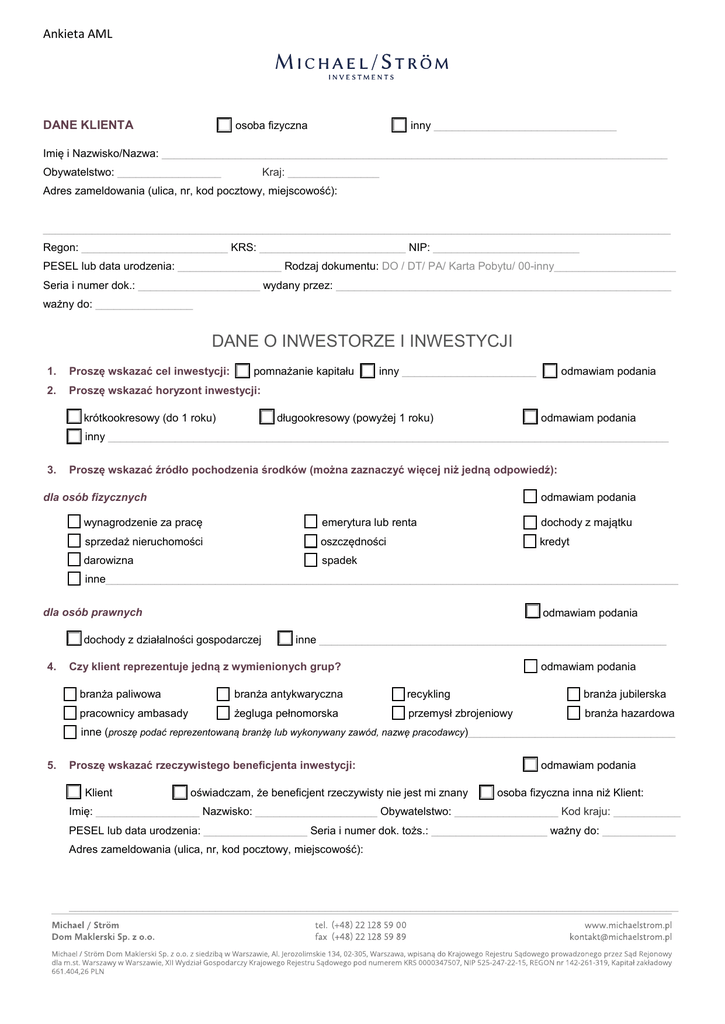 Ankieta AML osoba fizyczna DANE KLIENTA inny ______________________________ Imię i Nazwisko/Nazwa: ___________________________________________________________________________________ Obywatelstwo: _________________ Kraj: _______________ Adres zameldowania (ulica, nr, kod pocztowy, miejscowość): _______________________________________________________________________________________________________ Regon: ________________________ KRS: ________________________ NIP: ________________________ PESEL lub data urodzenia: _________________ Rodzaj dokumentu: DO / DT/ PA/ Karta Pobytu/ 00-inny____________________ Seria i numer dok.: ____________________ wydany przez: _______________________________________________________ ważny do: ________________ DANE O INWESTORZE I INWESTYCJI 1. Proszę wskazać cel inwestycji: pomnażanie kapitału inny ______________________ odmawiam podania 2. Proszę wskazać horyzont inwestycji: długookresowy (powyżej 1 roku) krótkookresowy (do 1 roku) odmawiam podania inny ____________________________________________________________________________________________ 3. Proszę wskazać źródło pochodzenia środków (można zaznaczyć więcej niż jedną odpowiedź): dla osób fizycznych odmawiam podania wynagrodzenie za pracę emerytura lub renta dochody z majątku sprzedaż nieruchomości oszczędności kredyt darowizna spadek inne______________________________________________________________________________________________ dla osób prawnych odmawiam podania dochody z działalności gospodarczej 4. inne _________________________________________________________ Czy klient reprezentuje jedną z wymienionych grup? odmawiam podania branża paliwowa branża antykwaryczna recykling branża jubilerska pracownicy ambasady żegluga pełnomorska przemysł zbrojeniowy branża hazardowa inne (proszę podać reprezentowaną branżę lub wykonywany zawód, nazwę pracodawcy)__________________________________ 5. Proszę wskazać rzeczywistego beneficjenta inwestycji: Klient oświadczam, że beneficjent rzeczywisty nie jest mi znany odmawiam podania osoba fizyczna inna niż Klient: Imię: _________________ Nazwisko: ____________________ Obywatelstwo: _________________ Kod kraju: ___________ PESEL lub data urodzenia: _________________ Seria i numer dok. tożs.: ___________________ ważny do: ____________ Adres zameldowania (ulica, nr, kod pocztowy, miejscowość): ____________________________________________________________________________________________________ Ankieta AML UWAGA! Ostatnie pytanie dotyczy tylko Klientów, którzy nie są rezydentami. Udzielenie odpowiedzi pozytywnej oznacza konieczność wypełnienia załączonego Oświadczenia Klienta o zajmowaniu eksponowanego stanowiska politycznego. 6. Oświadczam, że jestem / nie jestem osobą określaną jako PEP (Politically Exposed Person) w rozumieniu ustawy z dnia 16 listopada 2000 r. o przeciwdziałaniu praniu pieniędzy oraz finansowaniu terroryzmu.* * w przypadku odpowiedzi pozytywnej konieczne jest wypełnienie załączonego Oświadczenia Klienta o zajmowaniu eksponowanego stanowiska politycznego ____________________________________________ Podpis Klienta / Przedstawiciela Ustawowego / Reprezentanta Grupa: niskie/ średnie/ wysokie/ NA ____________________________________________ Pieczęć i Podpis Pracownika Oświadczenie Klienta o zajmowaniu eksponowanego stanowiska politycznego1 Oświadczenie wypełniane jest przez Klienta mającego miejsce zamieszkania poza terytorium Rzeczypospolitej Polskiej. Prosimy o wypełnienie oświadczenia DRUKOWANYMI LITERAMI. Ja __________________________________________________________________________________________________ (imię i nazwisko) zamieszkały/ła _________________________________________________________________________________________ (należy podać pełny adres: kraj, miasto, kod pocztowy, ulica, numer domu) urodzony/a ___________________________________________________________________________________________ (data i miejsce urodzenia: kraj, miasto) legitymujący się : dowód osobisty/paszport __________________________________________________________________ (należy podać serię i numer dokumentu, kraj w którym dokument został wydany) oświadczam, że zajmuję eksponowane stanowisko polityczne _____________________________________________________________________________________________________ (należy podać rodzaj zajmowanego stanowiska lub stopień pokrewieństwa bądź relacji z osobą zajmującą eksponowane stanowisko polityczne) Uprzedzony o odpowiedzialności karnej z art. 233 Kodeksu karnego w związku z art. 9e ust. 5 Ustawy z dnia 16 listopada 2000 r. o przeciwdziałaniu praniu pieniędzy oraz finansowaniu terroryzmu2 za podanie danych niezgodnych ze stanem faktycznym, prawdziwość powyższych danych stwierdzam własnoręcznym podpisem. _______________________ Miejscowość, Data (dd.mm.rrrr) _________________________ Podpis Klienta _________________________ Podpis i pieczęć Pracownika osobę zajmującą eksponowane stanowisko polityczne w rozumieniu ustawy z dnia 16 listopada 2000 r. o przeciwdziałaniu praniu pieniędzy oraz finansowaniu terroryzmu, uważa się osoby fizyczne: 1 Przez a) b) c) szefów państw, szefów rządów, ministrów, wiceministrów lub zastępców ministrów, członków parlamentu, sędziów sądów najwyższych, trybunałów konstytucyjnych oraz innych organów sądowych, których orzeczenia nie podlegają zaskarżeniu, z wyjątkiem trybów nadzwyczajnych, członków trybunałów obrachunkowych, członków zarządów banków centralnych, ambasadorów, charge d’affairs oraz wyższych oficerów sił zbrojnych, członków organów zarządzających lub nadzorczych przedsiębiorstw państwowych, którzy sprawują lub zaprzestali sprawowania funkcji publicznych w okresie krótszym niż rok do dnia złożenia niniejszego oświadczenia, małżonków osób, o których mowa w lit. a), lub osoby pozostające z nimi we wspólnym poż