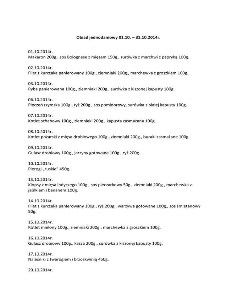 Obiad jednodaniowy 01.10. – 31.10.2014r. 01.10.2014r. Makaron 200g., sos Bolognese z mięsem 150g., surówka z marchwi z papryką 100g. 02.10.2014r. Filet z kurczaka panierowany 100g., ziemniaki 200g., marchewka z groszkiem 100g. 03.10.2014r. Ryba panierowana 100g., ziemniaki 200g., surówka z kiszonej kapusty 100g 06.10.2014r. Pieczeń rzymska 100g., ryż 200g., sos pomidorowy, surówka z białej kapusty 100g. 07.10.2014r. Kotlet schabowy 100g., ziemniaki 200g., kapusta zasmażana 100g. 08.10.2014r. Kotlet pożarski z mięsa drobiowego 100g., ziemniaki 200g., buraki zasmażane 100g. 09.10.2014r. Gulasz drobiowy 100g., jarzyny gotowane 100g., ryż 200g. 10.10.2014r. Pierogi „ruskie” 450g. 13.10.2014r. Klopsy z mięsa indyczego 100g., sos pieczarkowy 50g., ziemniaki 200g., marchewka z jabłkiem i bananem 100g. 14.10.2014r. Filet z kurczaka panierowany 100g., ryż 200g., warzywa gotowane 100g., sos śmietanowy 50g. 15.10.2014r. Kotlet mielony 100g., ziemniaki 200g., marchewka z groszkiem 100g. 16.10.2014r. Gulasz drobiowy 100g., kasza 200g., surówka z kiszonej kapusty 100g. 17.10.2014r. Naleśniki z twarogiem i brzoskwinią 450g. 20.10.2014r. Zraz drobiowo-wieprzowy 100g., sos koperkowy 50g., ziemniaki 200g., surówka z marchwi i selera 100g. 21.10.2014r. Gulasz wieprzowy 100g., ryż 200g., sałatka z ogórka kiszonego z marchwi 100g. 22.10.2014r. Kotlet mielony 100g., ziemniaki 200g., buraki zasmażane 100g. 23.10.2014r. Filet z kurczaka panierowany 100g., ziemniaki 200g., sałatka z czerwonej i białej kapusty 100g. 24.10.2014r. Pierogi z truskawkami ze śmietaną 450g. 27.10.2014r. Kotlet de’vollaile 100g., ziemniaki 200g., sałatka z buraków z papryką 100g. 28.10.2014r. Makaron 200g., sos Bolognese z mięsem 150g, surówka Colesław 100g. 29.10.2014r. Kotlet schabowy 100g., ziemniaki 200g., kapusta zasmażana 100g. 30.10.2014r. Pieczeń rzymska 100g., ryż 200g., sos pomidorowy, surówka z białej kapusty 100g. 31.10.2014r. Knedle ze śliwkami 450g.