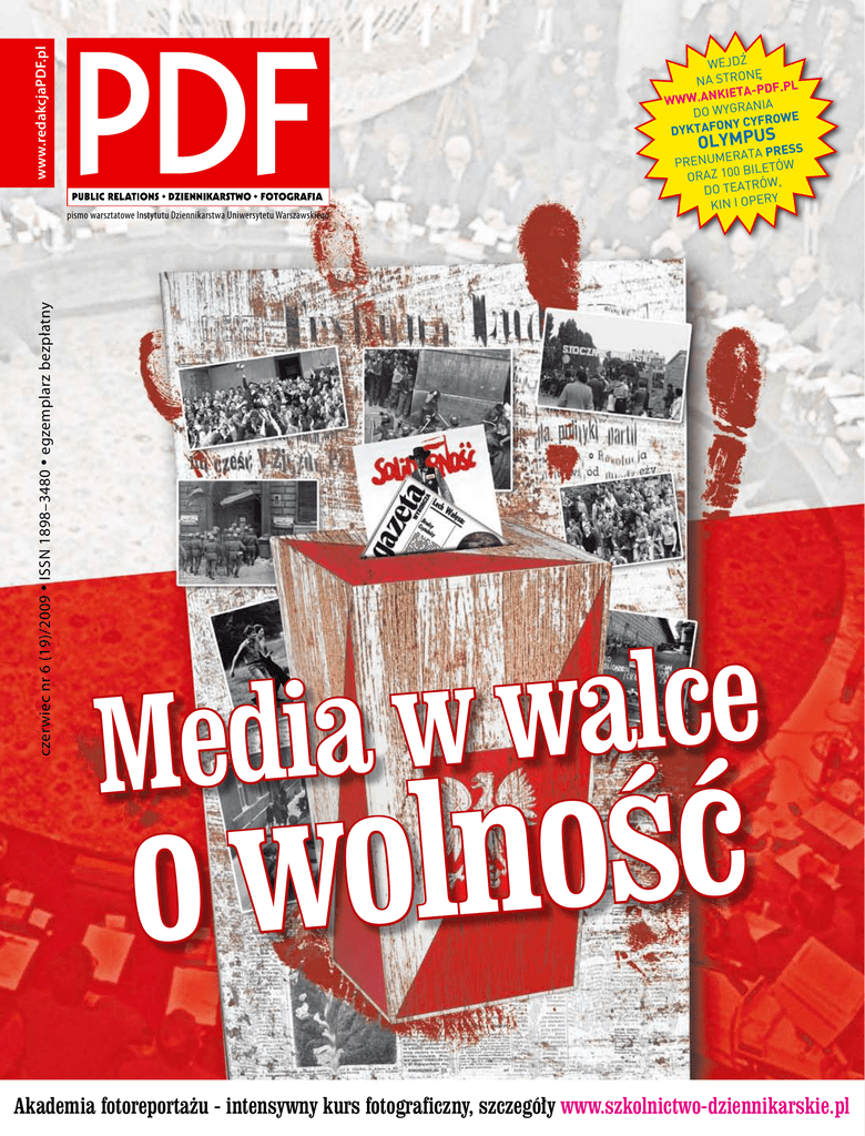 www.redakcjaPDF.pl Wejdź ę na stron f.pl kieta-pd www.an ania do wygr we ny cyfro dyktafo s Olympu a Press czerwiec nr 6 (19)/2009 • ISSN 1898–3480 • egzemplarz bezpłatny pismo warsztatowe Instytutu Dziennikarstwa Uniwersytetu Warszawskiego erat prenum biletów oraz 100 ów, do teatr ry kin i ope e c l a w w a i d e M ć ś o n l o ow Akademia fotoreportażu - intensywny kurs fotograficzny, szczegóły www.szkolnictwo-dziennikarskie.pl dziennikarstwo | Słowo / Obraz Naczelna strona Na wejściu Temat silnie uwarunkowany REDAKCJA redaktor naczelny: Zbigniew Żbikowski z-ca redaktora naczelnego Paweł H. Olek zespół redakcyjny: Emil Borzechowski, Tomasz Betka, Roksana Gowin, Magdalena Grzymkowska, Agnieszka Juskowiak, Marcin Kasprzak, Paweł Łysakiewicz, Iwona Pawlak, Joanna Maria Sawicka, Julian Tomala, Magdalena Wasyłeczko, Agnieszka Wójcińska, Wioletta Wysocka współpraca: Jan Brykczyński, Aleksandra Gałka, Tomasz Jelski, Łukasz Miedziejewski, Katarzyna Radziszewska, Aleksandra Solarska, Maria I. Szulc, Bartosz Zaborowski Były liczne plakaty z Garym Cooperem, niezliczone czarno-białe zdjęcia kandydatów strony opozycyjnej z Wałęsą, wiece, ulotki i agitki, ale niektórym najbardziej utkwiło w pamięci hasło: „Po raz pierwszy możesz wybrać – wybierz Solidarność”. Może dlatego, że stanowiło ono zastanawiający łącznik między starymi a nowymi laty i rodzaj proroctwa na przyszłość, aczkolwiek dość przewrotnego. Jest tu jakaś niedosłowna zbieżność z hasłem Forda z początku dwudziestego stulecia: „Możesz wybrać dowolny kolor, pod warunkiem, że to będzie kolor czarny”. Bo innych, poza czarnymi, Fordów T nie produkowano. Amerykanin, który nie chciał skorzystać z tego wyboru, mógł ewentualnie obyć się bez wozu. Tak samo w głębokim PRL-u: mogliśmy oddać głos na dowolną listę, pod warunkiem, że była to lista Frontu Jedności Narodu. Przed czerwcowymi wyborami 1989 r. „nasi” też dali nam możliwość wyboru, po to tylko, żeby ją w haśle zawęzić (choć zgoda – tu różnica – nie zamykając jej). Bo tylko wybór Solidarności dawał gwarancję, że coś się radykalnie w „tym kraju” zmieni. A zmian chcieli, jak się okazało, nawet zwolennicy PZPR. I się zmieniło. Choć nie do końca. Monopolu na władzę nie udało się utrzymać żadnej opcji politycznej, ale ile czasu musiało upłynąć i ile walk trzeba było stoczyć w mediach i w parlamencie, zanim zaczęły się kruszyć inne monopole. Przed pozornymi wyborami długo stawiały obywateli takie, mające korzenie w PRL, instytucje, jak TP SA (telefon stacjonarny), ZUS (emerytury), PKP (podróż koleją), armia („Możecie służyć w dowolnie wybranej formacji i ja wam mówię, że to będzie piechota”) i wiele innych. Co prawda więcej niż jednej armii w państwie nie będzie, ale dziś młodzież ma przynajmniej rzeczywisty wybór: może iść do woja albo nie iść. A wszystko dlatego, że wtedy jako elektorat zgodziliśmy się, mając wybór, ograniczyć go do Solidarności. Także my, w redakcji „PDF”, szukając motywu na czerwiec, postawiliśmy siebie przed podobnym wyborem: może to być każdy temat, pod warunkiem, że będzie to temat o wyborach’89. W rezultacie także czytelników postawiliśmy przed alternatywą: możecie poczytać o wszystkim, pod warunkiem, że będzie to tekst o tym, co się działo dwadzieścia lat temu. A gdyby ktoś w tym momencie chciał odłożyć czasopismo, spieszymy ze sprostowaniem: spokojnie, piszemy też o epidemii świńskiej grypy, jaka przetoczyła się przez media, o tym, co piszczy w pi-arze i w Internecie, i w innej cyberprzestrzeni. Żeby był wybór. Zgodnie z hasłem: jak możesz wybrać, wybierz „PDF”. Najlepiej cały. Zbigniew Żbikowski stały felieton: Andrzej Zygmuntowicz korekta: Joanna Maria Sawicka WYDAWCA: Instytut Dziennikarstwa Uniwersytetu Warszawskiego koordynator wydawcy: Grażyna Oblas druk: Polskapresse Sp. z o.o. nakład: 10 tys. egz. adres redakcji: PDF pismo warsztatowe Instytutu Dziennikarstwa UW ul. Nowy Świat 69, pok. 51 (IV piętro), 00–046 Warszawa, tel. 022 5520293, e–mail: [email protected] Więcej tekstów w portalu internetowym: www.redakcjaPDF.pl współpraca z serwisem foto: stała współpraca: Piszesz, fotografujesz, interesujesz się PR? Szukamy współpracowników. Kolegia redakcyjne, każda środa godz. 20:00 Instytut Dziennikarstwa UW, sala 27 | 02 | Kurs „Prawo prasowe w praktyce” - charakterystyka prawa prasowego z punktu widzenia dziennikarza oraz osób odpowiedzialnych za kontakty z dziennikarzami. - wprowadzenie do zagadnienia prawa prasowego – uwarunkowania prawne. fot. Jerzy Undro / PAP projekt graficzny, okładka i skład DTP: Karol Grzywaczewski / [email protected] termin: 26 czerwca 2009 roku szczegóły i zapisy: www.szkolnictwo-dziennikarskie.pl reklama Goleniów (woj. zachodniopomorskie), 13 maja 2009 roku. Chorąży Maciej Wesołek z żoną Beatą i córkami Kingą i Gabrysią podczas powitania na lotnisku. Na lotnisku w podszczecińskim Goleniowie wylądował samolot ze 138 żołnierzami na pokładzie. Ostatnia grupa żołnierzy IV zmiany Polskiego Kontyngentu Wojskowego w Afganistanie wróciła do kraju. Na lotnisku witali ich najbliżsi. Akademia fotoreportażu pod kierunkiem Andrzeja Zygmuntowicza • intensywny kurs fotograficzny • atrakcyjny program zajęć • profesjonalna kadra • teoria i praktyka • zajęcia w soboty i niedziele Od października 2009 do lutego 2010 roku Informacje i zapisy: www.szkolnictwo-dziennikarskie.pl tel. (22) 55 20 293, 0 502 825 492 Nasi odważni żołnierze | Piotr Malinowski, Polska Agencja Prasowa | Marcin Kołodziejczyk, reporter „Polityki” Słowo fotografa Obraz tekściarza Przekaz medialny zdominowany jest przez obrazy wojen, katakli‑ zmów czy zbrodni. Rzadkością są zdjęcia takie, jak te prezentowane powyżej. Wyobraźcie sobie, jakie fotografie pojawiłyby się w obi