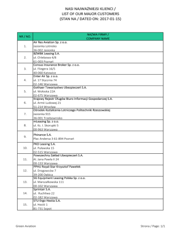NASI NAJWAŻNIEJSI KLIENCI / LIST OF OUR MAJOR CUSTOMERS (STAN NA / DATED ON: 2017-01-15) NAZWA FIRMY / COMPANY NAME NR / NO. 1. 2. 3. 4. 5. 6. 7. 8. 9. 10. 11. 12. 13. 14. 15. Air Res Aviation Sp. z o.o. Jasionka Lotnisko 36-002 Jasionka BZWBK Leasing S.A. ul. Chlebowa 4/8 61-003 Poznań Consus Insurance Broker Sp. z o.o. ul. Fliegera 16/5 40-060 Katowice Enter Air Sp. z o.o. ul. 17 Stycznia 74 02-146 Warszawa Gothaer Towarzystwo Ubezpieczeń S.A. ul. Wołoska 22A 02-675 Warszawa Krajowy Rejestr Długów Biuro Informacji Gospodarczej S.A. ul. Armii Ludowej 21 51-214 Wrocław Ośrodek Kształcenia Lotniczego Politechniki Rzeszowskiej Jasionka 915 36-001 Trzebownisko mLeasing Sp. z o.o. ul. Ks. I. Skorupki 5 00-963 Warszawa Phinance S.A. Plac Andersa 3 61-894 Poznań PKO Leasing S.A. ul. Puławska 15 02-515 Warszawa Powszechny Zakład Ubezpieczeń S.A. Al. Jana Pawła II 24 00-133 Warszawa PPHU Royal-Star Krzysztof Pawełek ul. Drogowców 7 39-200 Dębica SG Equipment Leasing Polska Sp. z o.o. ul. Marszałkowska 111 00-102 Warszawa Sprintair S.A. ul. Ruchliwa 22 02-182 Warszawa STU Ergo Hestia S.A. ul. Hestii 1 81-731 Sopot Green Aviation Strona / Page: 1/1