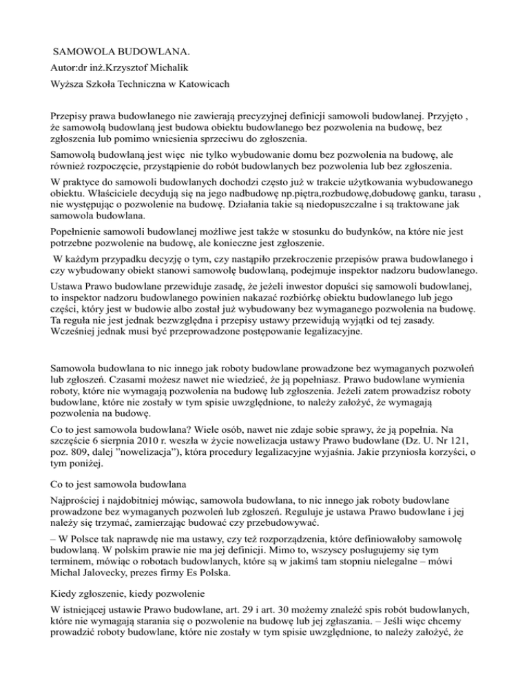 SAMOWOLA BUDOWLANA. Autor:dr inż.Krzysztof Michalik Wyższa