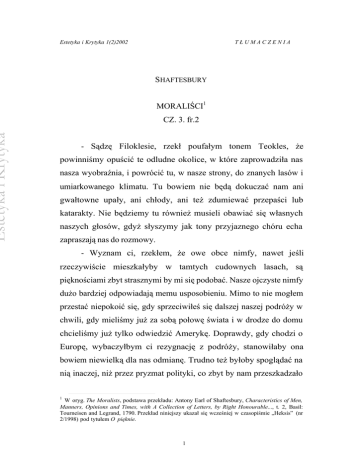 Estetyka i Krytyka Estetyka i Krytyka 1(2)2002 TŁUMACZENIA SHAFTESBURY MORALIŚCI1 CZ. 3. fr.2 - Sądzę Filoklesie, rzekł poufałym tonem Teokles, że powinniśmy opuścić te odludne okolice, w które zaprowadziła nas nasza wyobraźnia, i powrócić tu, w nasze strony, do znanych lasów i umiarkowanego klimatu. Tu bowiem nie będą dokuczać nam ani gwałtowne upały, ani chłody, ani też zdumiewać przepaści lub katarakty. Nie będziemy tu również musieli obawiać się własnych naszych głosów, gdyż słyszymy jak tony przyjaznego chóru echa zapraszają nas do rozmowy. - Wyznam ci, rzekłem, że owe obce nimfy, nawet jeśli rzeczywiście mieszkałyby w tamtych cudownych lasach, są pięknościami zbyt strasznymi by mi się podobać. Nasze ojczyste nimfy dużo bardziej odpowiadają memu usposobieniu. Mimo to nie mogłem przestać niepokoić się, gdy sprzeciwiłeś się dalszej naszej podróży w chwili, gdy mieliśmy już za sobą połowę świata i w drodze do domu chcieliśmy już tylko odwiedzić Amerykę. Doprawdy, gdy chodzi o Europę, wybaczyłbym ci rezygnację z podróży, stanowiłaby ona bowiem niewielką dla nas odmianę. Trudno też byłoby spoglądać na nią inaczej, niż przez pryzmat polityki, co zbyt by nam przeszkadzało 1 W oryg. The Moralists, podstawa przekładu: Antony Earl of Shaftesbury, Characteristics of Men, Manners, Opinions and Times, with A Collection of Letters, by Right Honourable..., t. 2, Basil: Tourneisen and Legrand, 1790. Przekład niniejszy ukazał się wcześniej w czasopiśmie „Heksis” (nr 2/1998) pod tytułem O pięknie. 1 Estetyka i Krytyka w naszych filozoficznych wzlotach. Jednak co do zachodniego szlaku, nie mogę sobie wyobrazić, dlaczego miałbyś zaniedbać owe tak szlachetne przedmioty, które tam się znajdują, skoro złoto i srebro, których jesteś tak zaciekłym wrogiem, nie odstraszyły cię od rodzinnej ziemi, która tak w nie obfituje. Gdyby Peru i Meksyk były tak pozbawione tych metali jak stara Sparta, moglibyśmy usłyszeć o nich więcej być może niż o całej Azji i Afryce. Moglibyśmy mieć więcej zwierząt, roślin, lasów, gór i rzek niż te, które napotkaliśmy. Jakże było mi przykro opuszczać szlachetną Amazonkę! Jak przykro ... Tu, gdy chciałem kontynuować, ujrzałem na twarzy Teoklesa uśmiech tak znaczący, że musiałem przez ciekawość zatrzymać się, by spytać o czym myśli. - O niczym, odrzekł, o niczym innym, jak o samym tym temacie. - Mów dalej. - Sądzę, że ty sam skończysz go za mnie. Tego rodzaju duch proroczy wziął cię we władanie. I tak oto ty, chłodny, niewzruszony Filoklesie, stałeś się poszukiwaczem tego samego co i ja tajemniczego piękna. - To prawda, Teoklesie, rzekłem, przyznaję. Geniusz twój, geniusz tego miejsca i wielki geniusz świata nareszcie zwyciężyły. Nie będę dłużej opierał się wzbierającej we mnie namiętności, jaką budzą we mnie przedmioty natury, tu, gdzie ani sztuka, ani ludzka próżność czy kaprys, wdzierając się w ich pierwotny stan, nie zepsuły ich prawdziwego porządku. Nawet nieociosane skały, omszałe pieczary, nieregularne, niezbadane groty i pełne uskoków wodospady oraz cała dzika gracja samej pustyni bardziej uosabiają naturę, są bardziej poruszające i ukazują swą wspaniałość przewyższającą sztywne i wzbudzające śmiech książęce ogrody. Lecz, błagam, powiedz, jak to się dzieje, że, poza kilkoma, takimi jak ty, filozofami, jedynymi w ten 2 Estetyka i Krytyka sposób zakochanymi ludźmi, poszukującymi lasów, rzek czy wybrzeży, są twoi biedni, pospolici miłośnicy? - Nie tylko o miłośnikach możesz to powiedzieć, odparł. Czyż bowiem nie jest tak samo z poetami i wszystkimi innymi, którzy studiują naturę i sztuki ją naśladujące? Czyż nie tak jest ze wszystkimi, którzy, krótko mówiąc, miłują czy to muzy czy gracje? - Jednakże, odrzekłem, o wszystkich tych, którzy tak głęboko zabrnęli tą romantyczną ścieżką, myśli się jak o ludziach albo w oczywisty sposób pozbawionych rozumu, albo ogarniętych melancholią i entuzjazmem. Zawsze usiłujemy zawrócić ich z tych samotnych okolic. I muszę przyznać, że często i ja musiałem się zastanowić, gdy odkrywałem, że moja wyobraźnia działa w ten sposób, gdyż nie wiedziałem, co mną owładnęło, gdy przedmioty tego rodzaju wzbudzały moje namiętności. - Nic dziwnego, odparł, że jesteśmy w kłopocie, skoro gonimy za cieniem, zamiast za istotą. Gdyż jeśli tylko możemy zawierzyć temu, czego nauczyło nas nasze rozumowanie, iż cokolwiek w naturze jest piękne lub urocze, to jest ono tylko nikłym cieniem tego pierwszego piękna. Tak też jest z każdą prawdziwą miłością, zależną od umysłu i będącą kontemplowaniem piękna - samego w sobie bądź tego, które w niedoskonały sposób ukazuje się w przedmiotach działających na zmysły. Jak rozumny umysł miałby tu spocząć bądź znaleźć zaspokojenie w absurdalnej przyjemności, jaka płynie z samych zmysłów? - Od tej chwili, rzekłem, nie będę miał już powodów obawiać się tych piękności, które wzbudzają pewną melancholię - jak miejsca, które wymieniliśmy, czy też jak te oto uroczyste gaje. Nie będę więcej unikał płynnych akcentów delikatnej muzyki ani uciekał od czarujących rysów najpiękniejszej ludzkiej twarzy. 3 Estetyka i Krytyka - Skoro jesteś gotowy, odparł, i tak biegły w tej nowej miłości, że pewien jesteś, iż nigdy już nie będziesz podziwiał naśladowczego piękna, a tylko szukał jego oryginału, ani też celować w innych przyjemnościach niż przyjemności rozumu, możesz, podobnie jak ja, być godny zaufania i ośmielić się samemu sobie odpowiedzieć. Jednakże byłbym zadowolony, gdybyś odrobinę lepiej wyjaśnił, o co ci chodzi, tak, bym nie popełnił błędu, którego się obawiasz. Czy pomógłbym ci, mówiąc, że absurdem jest szukać przyjemności gdzie indziej niż w kocha