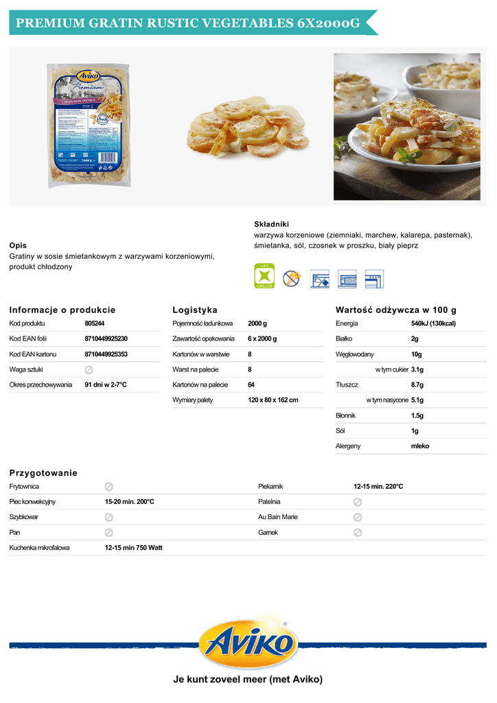 PREMIUM GRATIN RUSTIC VEGETABLES 6X2000G Składniki warzywa korzeniowe (ziemniaki, marchew, kalarepa, pasternak), śmietanka, sól, czosnek w proszku, biały pieprz Opis Gratiny w sosie śmietankowym z warzywami korzeniowymi, produkt chłodzony Wartość odżywcza w 100 g Informacje o produkcie Logistyka Kod produktu 805244 Pojemność ładunkowa 2000 g Energia 540kJ (130kcal) Kod EAN folii 8710449925230 Zawartość opakowania 6 x 2000 g Białko 2g Kod EAN kartonu 8710449925353 Kartonów w warstwie 8 Węglowodany 10g Warst na palecie 8 Kartonów na palecie 64 Wymiary palety 120 x 80 x 162 cm Waga sztuki Okres przechowywania 91 dni w 27°C w tym cukier 3.1g Tłuszcz 8.7g w tym nasycone 5.1g Błonnik 1.5g Sól 1g Alergeny mleko Przygotowanie Frytownica Piec konwekcyjny Piekarnik 1520 min. 200°C Patelnia Szybkowar Au Bain Marie Pan Garnek Kuchenka mikrofalowa 12-15 min 750 Watt Je kunt zoveel meer (met Aviko) 1215 min. 220°C