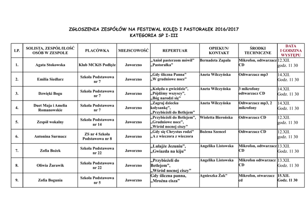 ZGŁOSZENIA ZESPÓŁÓW NA FESTIWAL KOLĘD I PASTORAŁEK 2016/2017 KATEGORIA SP I-III SOLISTA, ZESPÓŁ/ILOŚĆ OSÓB W ZESPOLE PLACÓWKA MIEJSCOWOŚĆ Agata Stokowska Klub MCKiS Podłęże Jaworzno „Anioł pasterzom mówił” „Pastorałka” Bernadeta Zapała 1. Mikrofon, odtwarzacz 12.XII. CD godz. 11 30 Jaworzno „Gdy śliczna Panna” „W grudniowe noce” Odtwarzacz mp3 Emilia Siedlarz Szkoła Podstawowa nr 7 Aneta Wilczyńska 2. 14.XII. Godz. 11 30 Dzwięki Bogu Szkoła Podstawowa nr 7 Jaworzno 3 mikrofony odtwarzacz CD 14.XII. Godz. 11 30 Duet Maja i Amelia Romanowskie Szkoła Podstawowa nr 7 Aneta Wilczyńska 4. Jaworzno Odtwarzacz mp3, 2 mikrofony 14.XII. Godz. 11 30 Odtwarzacz CD Zespół wokalny Szkoła Podstawowa nr 14 Wioletta Bierońska 5. Jaworzno 12.XII. godz. 11 30 Odtwarzacz CD Antonina Surmacz ZS nr 4 Szkoła Podstawowa nr 8 Bożena Szencel 6. Jaworzno „Kolęda o gwieździe”, „Pójdźmy wszyscy”, „Bóg narodzi się” „Zagraj dziecku kołysankę”, „Przybieżeli do Betlejem” „Przybieżeli do Betlejem”, „Grudniowe noce”, „Wśród nocnej ciszy” „Gdy się Chrystus rodzi” „A z wieczora z wieczora Aneta Wilczyńska 3. 12.XII. godz. 11 30 Zofia Bożek Szkoła Podstawowa nr 22 Jaworzno „Lulajże Jezuniu”, „Gwiazda na kiju” Angelika Listowska 7. Mikrofon, odtwarzacz 13.XII. CD Godz. 11 30 Oliwia Żurawik Szkoła Podstawowa nr 22 Jaworzno Mikrofon odtwarzacz 13.XII. CD Godz. 11 30 Zofia Bogunia Szkoła Podstawowa nr 5 Agnieszka Żak” 9. Jaworzno „Przybieżeli do Betlejem”, „Wśród nocnej ciszy” Gdy śliczna panna, „Mroźna cisza” Angelika Listowska 8. Mikrofon, otwarzacz 15.XII. cd Godz. 11 30 REPERTUAR OPIEKUN/ KONTAKT ŚRODKI TECHNICZNE DATA I GODZINA WYSTĘPU LP. Agnieszka Żak, Katarzyna Michlewicz 2 mikrofony, odtwarzacz CD 15.XII. Godz. 11 30 Zespół wokalny„Zorka” Szkoła Podstawowa nr 5 11. Liwia Salomon ZS nr 4 Szkoła Podstawowa nr 8 Jaworzno '' Lulajże Jezuniu”, „Wśród nocnej ciszy”, „Już gwiadeczka”, „Jezus malusieńki”, „Bosy pastuszek”, 12. Zespół wokalny „Wesołe gwiazdeczki” ZS nr 4 Szkoła Podstawowa nr 8 Jaworzno „Przybieżeli do Betlejem”, Ewa Banduła „Świeć gwiazdeczko” Jaworzno „Bosy pastuszek”, „Lulajże Jezuniu” Odtwarzacz CD Zofia Pawlik Szkoła Podstawowa nr 15 Magdalena Maziarz 13. Julia Mika Ognisko Pracy Pozaszkolnej nr 1 Sosnowiec Mikrofon, odtwarzacz 12.XII. USB godz. 11 30 Patrycja Wojciechowska Ognisko Pracy Pozaszkolnej nr 1 Katarzyna Kożuch 15. Sosnowiec „ Pójdźmy wszyscy do stajenki”, „Mroźna cisza” „Do szopy hej Pasterze”, „Złota Jerozolima” Katarzyna Kożuch 14. Odtwarzacz USB, mikrofon 12.XII. godz. 11 30 16. Szymon Posikata Ognisko Pracy Pozaszkolnej nr 1 Sosnowiec Odtwarzacz USB, mikrofon 12.XII. godz. 11 30 10. Jaworzno Agnieszka Jurkowska Odtwarzacz CD, usb 12.XII. godz. 11 30 17. Emilia Ferdek - Sosnowiec 18. Katarzyna Olas Szkoła Podstawowa nr3 z Oddziłami Integracyjnymi Jaworzno „Przybieżeli do Betejem Katarzyna Kożuch pastzerze”, „Gwiazdy tańczyły” „Gdy się Chrystus rodzi”, Agnieszka Derdek „Uciekali, uciekali, uciekali” Barbara Sroka „Wśród nocnej ciszy”, „Całą noc padał śnieg” 19. Maria Urbanik Szkoła Podstawowa nr 15 Jaworzno „Zaśnij dziecino”, „Wśód nocnej iszy” Zuzanna Maśłoń Zespół Szkół Szkoła Podstawowa i Pbliczne Gimnajum Rogoźnik „Ptaszki niby dzwoneczki”, Anna Dydak „Tobie mały Panie” 20. Odtwarzacz CD USB 12.XII. godz. 11 30 12.XII. godz. 11 30 16.XII. Godz. 10 30 Mikrofon na statywie, 12.XII. odtwarzacz CD godz. 14 00 Józef Urbanik, Anna Mikrofon, odsłuch, Martyka odtwarzacz MP Odtwarzacz Cd 13.XII Godz. 11 30 12.XII. Godz. 14 00 21. Julia Palian 22 Maja Popielas SP 5 „Wśród nocnej ciszy” „Świeć gwiazdeczko” Beata Kobiałka Jaworzno 15.XII. Godz. 11 30 „Kolęda z naszych serc” ‘Dzisiaj w Betlejem” Karolina Śleziak Mysłowice 14.XII. Godz.11 30