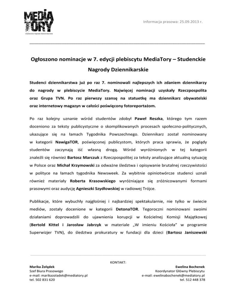 Informacja prasowa: 25.09.2013 r. ____________________________________________________________________________ Ogłoszono nominacje w 7. edycji plebiscytu MediaTory – Studenckie Nagrody Dziennikarskie Studenci dziennikarstwa już po raz 7. nominowali najlepszych ich zdaniem dziennikarzy do nagrody w plebiscycie MediaTory. Najwięcej nominacji uzyskały Rzeczpospolita oraz Grupa TVN. Po raz pierwszy szansę na statuetkę ma dziennikarz obywatelski oraz internetowy magazyn w całości poświęcony fotoreportażom. Po raz kolejny uznanie wśród studentów zdobył Paweł Reszka, którego tym razem doceniono za teksty publicystyczne o skomplikowanych procesach społeczno-politycznych, ukazujące się na łamach Tygodnika Powszechnego. Dziennikarz został nominowany w kategorii NawigaTOR, poświęconej publicystom, których praca sprawia, że poglądy studentów zaczynają iść własną drogą. Wśród wyróżnionych w tej kategorii znaleźli się również Bartosz Marczuk z Rzeczpospolitej za teksty analizujące aktualną sytuację w Polsce oraz Michał Krzymowski za odważne śledztwa i opisywanie brutalnej rzeczywistości w polityce na łamach tygodnika Newsweek. Za wybitnie opiniotwórcze studenci uznali również materiały Roberta Krasowskiego wyróżniające się zróżnicowanymi formami prasowymi oraz audycję Agnieszki Szydłowskiej w radiowej Trójce. Publikacje, które wybuchły najgłośniej i najbardziej spektakularnie, nie tylko w świecie mediów, zostały docenione w kategorii DetonaTOR. Tegoroczni nominowani swoimi działaniami doprowadzili do ujawnienia korupcji w Kościelnej Komisji Majątkowej (Bertold Kittel i Jarosław Jabrzyk w materiale „W imieniu Kościoła” w programie Superwizjer TVN), do śledztwa prokuratury w fundacji dla dzieci (Bartosz Janiszewski ___________________________________________________________________________________ KONTAKT: Marika Żołądek Szef Biura Prasowego e-mail: [email protected] tel. 502 831 620 Ewelina Bochenek Koordynator Główny Plebiscytu e-mail: [email protected] tel. 512 448 378 Informacja prasowa: 25.09.2013 r. na łamach tygodnika Wprost) i do spowodowania dyskusji na temat tego, kto sprawuje dziś IV władzę: dziennikarze czy agencje PR (Cezary Łazarewicz w tekście „Orzeł może” opublikowanym w Tygodniku Powszechnym). Łukasz Frątczak i Tomasz Sekielski zostali wyróżnieni za materiał w programie „Po prostu”, w którym udowodnili, jak łatwo jest wnieść na posiedzenie Sejmu substancje będące podstawą do sporządzenia ładunków wybuchowych. Za wstrząsający materiał opublikowany w Dużym Formacie nominację dostał Mariusz Szczygieł. Głośny reportaż opowiada o kobiecie skazanej za zabójstwo 6-letniego pasierba, która po kilku latach od odbycia kary podjęła pracę w szkole i została ekspertem MEN. Za udowadnianie, że szybkość i rzetelność nie muszą się wykluczać, w kategorii TORpeda nominowana została Karolina Hyrek-Prosiecka, którą studenci docenili za wnikliwe analizy problemów związanych z gospodarką i polityką na antenie TVN CNBC oraz wskazywanie błędów osobom za nie odpowiedzialnym. Za błyskawiczny przekaz informacji zza oceanu i skrupulatne wyjaśnianie tego, co dzieje się na szczytach amerykańskiej władzy, nominowany został Piotr Milewski z Radia Zet, natomiast Tomasz Skory z RMF FM - za celne i odważne komentarze na temat bieżących spraw toczących się w Polsce i za granicą. W kategorii TORpeda nominowane zostały również Izabela Kacprzak i Grażyna Zawadka (Rzeczpospolita) za materiały o sprawach bieżących, w których wykazują się nie tylko umiejętnością pracy w duecie, ale także nieustępliwością i wszechstronnością. Roberta Zielińskiego (Dziennik Gazeta Prawna) studenci docenili za niebywałe kompetencje w relacjonowaniu spraw dotyczących policji, prokuratury oraz Ministerstwa Spraw Wewnętrznych. Najważniejszą kategorią Plebiscytu jest AuTORytet. Laureata w tej kategorii poznamy już 26 listopada. To wyróżnienie studenci przyznają za całokształt pracy dziennikarskiej. W tej wyjątkowej kategorii nie ma listy nominowanych, a każdy z głosujących może wpisać nazwisko swojego kandydata w puste miejsce. ___________________________________________________________________________________ KONTAKT: Marika Żołądek Szef Biura Prasowego e-mail: [email protected] tel. 502 831 620 Ewelina Bochenek Koordynator Główny Plebiscytu e-mail: [email protected] tel. 512 448 378 Informacja prasowa: 25.09.2013 r. MediaTory to Plebiscyt, w którym studenci dziennikarstwa z całej Polski wybierają dziennikarzy i ludzi mediów, których działalność w danym roku akademickim uznali za wzorową. To już druga edycja, w której udział biorą także uczelnie niepubliczne. Do udziału w Plebiscycie organizatorzy zapraszają każdą uczelnię w Polsce, na której dziennikarstwo funkcjonuje jako odrębny kierunek. W sumie do głosowania uprawnionych jest blisko 10 tysięcy studentów z 19 uczelni w Polsce. Organizatorami 7. edycji Plebiscytu są: Stowarzyszenie MediaTory, Koło Naukowe Studentów Dziennikarstwa i Komunikacji Społecznej UJ, a współorganizatorem Uniwersytet Jagielloński. Zwycięzców poznamy na uroczystej Gali Finałowej 7. grudnia w Auditorium Maximum UJ w Krakowie. Sponsorami Głównymi Plebiscytu już po raz trzeci są Julian Kozankiewicz, Piotr Kempa i Tomasz Andryszczyk. Narzędzia wspomagające monitoring mediów udostępnia Instytut Monitorowania Mediów. *** Pełna lista nominowanych dostępna jest w załączniku i na www.mediatory.pl. ___________________________________________________________________________________ KONTAKT: Marika Żołądek Szef Biura Prasowego e-mail: [email protected] tel. 502 831 620 Ewelina Bochenek Koordynator Główny Plebiscytu e-mail: [email protected] tel. 512 448 378