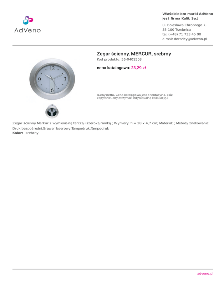 Właścicielem marki AdVeno jest firma Kulik Sp.J ul. Bolesława Chrobrego 7, 55-100 Trzebnica tel. (+48) 71 733 45 00 e-mail: [email protected] Zegar ścienny, MERCUR, srebrny Kod produktu: 56-0401503 cena katalogowa: 23,29 zł (Ceny netto. Cena katalogowa jest orientacyjna, złóż zapytanie, aby otrzymać indywidualną kalkulację.) Zegar ścienny Merkur z wymienialną tarczą i szeroką ramką.; Wymiary: fi = 28 x 4,7 cm; Materiał: ; Metody znakowania: Druk bezpośredni,Grawer laserowy,Tampodruk,Tampodruk Kolor: srebrny 1 adveno.pl