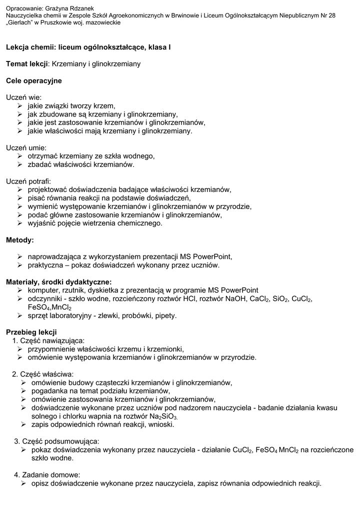 Opracowanie: Grażyna Rdzanek Nauczycielka chemii w Zespole Szkół Agroekonomicznych w Brwinowie i Liceum Ogólnokształcącym Niepublicznym Nr 28 „Gierlach” w Pruszkowie woj. mazowieckie Lekcja chemii: liceum ogólnokształcące, klasa I Temat lekcji: Krzemiany i glinokrzemiany Cele operacyjne Uczeń wie: ¾ jakie związki tworzy krzem, ¾ jak zbudowane są krzemiany i glinokrzemiany, ¾ jakie jest zastosowanie krzemianów i glinokrzemianów, ¾ jakie właściwości mają krzemiany i glinokrzemiany. Uczeń umie: ¾ otrzymać krzemiany ze szkła wodnego, ¾ zbadać właściwości krzemianów. Uczeń potrafi: ¾ projektować doświadczenia badające właściwości krzemianów, ¾ pisać równania reakcji na podstawie doświadczeń, ¾ wymienić występowanie krzemianów i glinokrzemianów w przyrodzie, ¾ podać główne zastosowanie krzemianów i glinokrzemianów, ¾ wyjaśnić pojęcie wietrzenia chemicznego. Metody: ¾ naprowadzająca z wykorzystaniem prezentacji MS PowerPoint, ¾ praktyczna – pokaz doświadczeń wykonany przez uczniów. Materiały, środki dydaktyczne: ¾ komputer, rzutnik, dyskietka z prezentacją w programie MS PowerPoint ¾ odczynniki - szkło wodne, rozcieńczony roztwór HCl, roztwór NaOH, CaCl2, SiO2, CuCl2, FeSO4,MnCl2 ¾ sprzęt laboratoryjny - zlewki, probówki, pipety. Przebieg lekcji 1. Część nawiązująca: ¾ przypomnienie właściwości krzemu i krzemionki, ¾ omówienie występowania krzemianów i glinokrzemianów w przyrodzie. 2. Część właściwa: ¾ omówienie budowy cząsteczki krzemianów i glinokrzemianów, ¾ pogadanka na temat podziału krzemianów, ¾ omówienie zastosowania krzemianów i glinokrzemianów, ¾ doświadczenie wykonane przez uczniów pod nadzorem nauczyciela - badanie działania kwasu solnego i chlorku wapnia na roztwór Na2SiO3. ¾ zapis odpowiednich równań reakcji, wnioski. 3. Część podsumowująca: ¾ pokaz doświadczenia wykonany przez nauczyciela - działanie CuCl2, FeSO4 MnCl2 na rozcieńczone szkło wodne. 4. Zadanie domowe: ¾ opisz doświadczenie wykonane przez nauczyciela, zapisz równania odpowiednich reakcji.