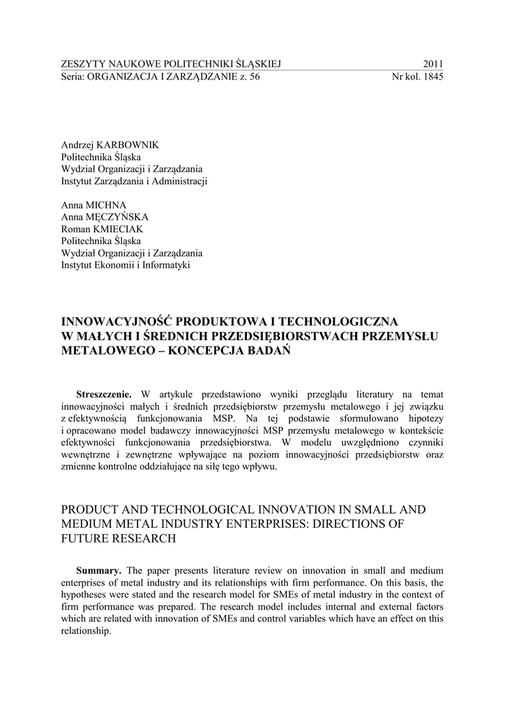 ZESZYTY NAUKOWE POLITECHNIKI ŚLĄSKIEJ Seria: ORGANIZACJA I ZARZĄDZANIE z. 56 2011 Nr kol. 1845 Andrzej KARBOWNIK Politechnika Śląska Wydział Organizacji i Zarządzania Instytut Zarządzania i Administracji Anna MICHNA Anna MĘCZYŃSKA Roman KMIECIAK Politechnika Śląska Wydział Organizacji i Zarządzania Instytut Ekonomii i Informatyki INNOWACYJNOŚĆ PRODUKTOWA I TECHNOLOGICZNA W MAŁYCH I ŚREDNICH PRZEDSIĘBIORSTWACH PRZEMYSŁU METALOWEGO – KONCEPCJA BADAŃ Streszczenie. W artykule przedstawiono wyniki przeglądu literatury na temat innowacyjności małych i średnich przedsiębiorstw przemysłu metalowego i jej związku z efektywnością funkcjonowania MSP. Na tej podstawie sformułowano hipotezy i opracowano model badawczy innowacyjności MSP przemysłu metalowego w kontekście efektywności funkcjonowania przedsiębiorstwa. W modelu uwzględniono czynniki wewnętrzne i zewnętrzne wpływające na poziom innowacyjności przedsiębiorstw oraz zmienne kontrolne oddziałujące na siłę tego wpływu. PRODUCT AND TECHNOLOGICAL INNOVATION IN SMALL AND MEDIUM METAL INDUSTRY ENTERPRISES: DIRECTIONS OF FUTURE RESEARCH Summary. The paper presents literature review on innovation in small and medium enterprises of metal industry and its relationships with firm performance. On this basis, the hypotheses were stated and the research model for SMEs of metal industry in the context of firm performance was prepared. The research model includes internal and external factors which are related with innovation of SMEs and control variables which have an effect on this relationship. 106 A. Karbownik, A. Michna, A. Męczyńska, R. Kmieciak 1. Wstęp Wraz z dokonującą się w latach 90-tych transformacją polityczno-gospodarczą, rozpoczął się dynamiczny rozwój sektora małych i średnich przedsiębiorstw (MSP) w Polsce. Sektor MSP [18] stanowi ponad 99% ogółu przedsiębiorstw i generuje 47,4% PKB oraz zatrudnia ponad 6 milionów osób, co stanowi 70% miejsc pracy w polskich przedsiębiorstwach. Wśród przedsiębiorstw produkcyjnych sektora MSP ponad 20% stanowią firmy branży metalowej. Szczególnie interesujące jest umiejscowienie planowanych badań empirycznych w województwie śląskim, gdzie przemysł metalowy, obok górnictwa, ma długoletnie tradycje. Przedsiębiorstwa tego regionu są jednymi z najbardziej innowacyjnych w skali kraju [20] oraz jest tutaj największa, po województwie mazowieckim, liczba zarejestrowanych przedsiębiorstw tego sektora (11,4% ogółu polskich MSP) [6]. Artykuł dotyczy innowacyjności MSP przemysłu metalowego (produkcja wyrobów metalowych, produkcja maszyn i urządzeń) – do tej branży należy co piąte MSP, działające w sektorze przetwórstwa przemysłowego w Polsce. W ostatnich latach przemysł metalowy cechuje wzrost produkcji sprzedanej oraz duża dynamika nakładów inwestycyjnych, jednocześnie deklarowany jest wysoki poziom nakładów na działalność innowacyjną. Przedsiębiorstwa te odgrywają coraz bardziej znaczącą rolę w gospodarce, a charakteryzują się pewną unikalnością, wynikającą przykładowo z: małych możliwości zasobowych, ograniczonych środków finansowych, braku odpowiedniego kapitału relacyjnego, utrudnionego dostępu do specjalistów. Innowacyjność będzie krytycznym czynnikiem przetrwania przedsiębiorstw w turbulentnym oraz hiperkonkurencyjnym otoczeniu [3]. Zatem we współczesnym przedsiębiorstwie ważne jest stworzenie klimatu sprzyjającego działaniom innowacyjnym. Tymczasem jest jeszcze wiele zagadnień dotyczących innowacyjności, które nie zostały dokładnie zbadane – problemy te są bardzo złożone. Innowacyjność jest postrzegana jako źródło osiągania przewagi konkurencyjnej [19], stąd wydaje się naturalna konieczność zbadania poziomu wykorzystania tego źródła i wskazanie rezerw w tym obszarze. Dla MSP przemysłu metalowego ważne jest udzielenie odpowiedzi na pytania: jakie zjawiska przyczyniają się do działań innowacyjnych; czy podejście projektowe podnosi skuteczność działań innowacyjnych, a w szczególności skuteczność wdrażania innowacji; jak określać poziom innowacyjności przedsiębiorstwa; jak poszczególne rodzaje innowacji wpływają na efektywność funkcjonowania przedsiębiorstwa? Ustalenie związku między innowacyjnością MSP branży metalowej a efektywnością funkcjonowania i opracowanie rekomendacji praktycznych może zachęcić menedżerów do poszerzenia działań na rzecz innowacyjności, co w konsekwencji przyczyni się do wzrostu konkurencyjności polskiego przemysłu metalowego. Innowacyjnośc produktowa i technologiczna… 107 2. Badania literaturowe z zakresu innowacyjności produktowej i technologicznej w małych i średnich przedsiębiorstwach przemysłu metalowego Dane GUS wskazują, że wśród dużych przedsiębiorstw jest więcej przedsiębiorstw wdrażających innowacje niż w gronie MSP [24]. Oprócz niewystarczających zasobów finansowych i ludzkich, innowacyjność (wprowadzanie nowego procesu, produktu lub pomysłu w organizacji [8]) MSP ograniczają: brak kultury innowacyjnej, niedostateczne umiejętności kierownictwa w zarządzaniu innowacjami, niechęć do ryzyka, brak rozpoznania przez kierownictwo możliwości twórczych pracowników, niewystarczająca wiedza o technologii, rynku i nowoczesnych metodach zarządzania [1]. Z drugiej strony wskazuje się, że mniejsze przedsiębiorstwa, w porównaniu z dużymi, charakteryzują się: większą elastycznością w dostosowywaniu się do zmieniających się warunków rynkowych, mniejszą biurokracją i brakiem konfliktu celów na płaszczyźnie właściciel – zarządzający. Najważniejsze dla osiągnięcia trwałej innowacyjności w MSP są: postawa kierownictwa, zaangażowanie pracowników i współpraca z innymi organizacjami [21]. Kierownictwo jest odpowiedzialne za promowanie tworzenia i rozwijania nowych pomysłów. Jego rolą jest tworzenie atmosfery sprzyjaj