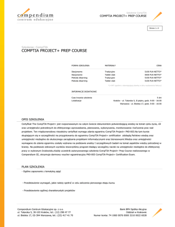 Szkolenie CompTIA COMPTIA PROJECT+ PREP COURSE Strona 1 z 4 Szkolenie: CompTIA COMPTIA PROJECT+ PREP COURSE FORMA SZKOLENIA MATERIAŁY CENA Stacjonarne Tradycyjne 5100 PLN NETTO* Stacjonarne Tablet ctab 5500 PLN NETTO* Metoda dlearning Tradycyjne 5100 PLN NETTO* Metoda dlearning Tablet ctab 5100 PLN NETTO* *(+VAT zgodnie z obowiązującą stawką w dniu wystawienia faktury) INFORMACJE DODATKOWE Czas trwania szkolenia Lokalizacje 5 dni Kraków - ul. Tatarska 5, II piętro, godz. 9:00 - 16:00 Warszawa - ul. Bielska 17, godz. 9:00 - 16:00 OPIS SZKOLENIA Certyfikat The CompTIA Project+ jest rozpoznawanym na całym świecie dokumentem potwierdzającą wiedzę na temat cyklu życia, ról oraz umiejętności potrzebnych do efektywnego wprowadzania, planowania, wykonywania, monitorowania i kończenia prac nad projektem. Ten międzynarodowy niezależny certyfikat wymaga zdania egzaminu CompTIA Project+ PK0-003.Na tym kursie skupiającym się w szczególności na przygotowaniu do egzaminu CompTIA Project+ certification zdobędą Państwo wiedzę oraz umiejętności niezbędne do skutecznego zarządzania projektami informatycznymi oraz biznesowymi.Wiedza oraz umiejętności wymagane do zdania egzaminu zostały wybrana na podstawie analizy I szczegółowych badań na temat aspektów wiedzy potrzebnej w branży. Na podstawie zebranych wyników stworzyliśmy program kładący szczególny nacisk na umiejętności niezbędne do efektywnej pracy w wybranym środowisku.Każdy uczestnik autoryzowanego szkolenia CompTIA Project+ Prep Course realizowanego w Compendium CE, otrzymuje darmowy voucher egzaminacyjny PK0-003 CompTIA Project+ Certification Exam. PLAN SZKOLENIA - Ogólne zapoznanie z tematyką zajęć - Przedstawienie wymagań, jakie należy spełnić w celu zaliczenia pierwszego etapu kursu - Przedstawienie ogólnej charakterystyki projektów Compendium Centrum Edukacyjne sp. z o.o. ul. Tatarska 5, 30-103 Kraków, tel.: (12) 298 47 77 ul. Bielska 17, 02-394 Warszawa, tel.: (22) 417 41 70 Bank BPH Spółka Akcyjna Oddział w Krakowie Numer konta: 74 1060 0076 0000 3210 0022 6028 Szkolenie CompTIA COMPTIA PROJECT+ PREP COURSE Strona 2 z 4 - Podsumowanie kroków niezbędnych do wdrożenie projektu - Wytłumaczenie znaczenia poszczególnych elementów projektu - Przedstawienie zarysu poszczególnych etapów w życiu projektu - Wytłumaczenie różnic pomiędzy poszczególnymi typami organizacji prowadzenia projektu. - Planowanie projektu - Przygotowanie wstępnego planu projektu na podstawie otrzymanego wstępnej charakterystyki - Wykorzystanie Work Breakdown Structure (WBS) oraz WBS dictionary w procesie planowania projektu - Zarys zarządzania zmianami w projekcie. - Opracowanie harmonogramu projektu w oparciu o WBS, zakres projektu i zapotrzebowanie na zasoby - Implementacja odpowiednich narzędzi/metod w celu uzyskania oczekiwanego produktu końcowego - Ocenienie wpływu zastosowanych narzędzi na projekt na podstawie przykładowego scenariusza. - Zidentyfikowanie wewnętrznych i zewnętrznych elementów planu komunikacyjnego - Zarys elementów polityki zarządzania ryzykiem - Ustalenie ról oraz wymaganych zasobów na podstawie ich dostępności i w oparciu o WBS - Identyfikacja poszczególnych elementów planu zarządzania jakością - Identyfikacja elementów planu zarządzania kosztami - Wyjaśnienie procesu zamówień w wybranej sytuacji - Wyjaśnienie celów i etapów planu przejściowego - Wykonanie oraz przekazanie projektu Compendium Centrum Edukacyjne sp. z o.o. ul. Tatarska 5, 30-103 Kraków, tel.: (12) 298 47 77 ul. Bielska 17, 02-394 Warszawa, tel.: (22) 417 41 70 Bank BPH Spółka Akcyjna Oddział w Krakowie Numer konta: 74 1060 0076 0000 3210 0022 6028 Szkolenie CompTIA COMPTIA PROJECT+ PREP COURSE Strona 3 z 4 - Efektywne zarządzanie zasobami ludzkimi - Przedstawienie roli spotkań projektowych oraz czynności z nimi związanych - ) Przedstawienie celu i wpływu ładu organizacyjnego na realizację danego projektu - Wskazanie na na podstawie wybranego scenariusza możliwego miejsce wystąpienia problemu oraz zaproponowanie jego rozwiązania - Kontrola zmian i komunikacji - Wprowadzenie procedury zarządzania zmianami w przedstawionym scenariuszu - Ocena wpływu potencjalnych zmian do potrójnego ograniczenia - Ustalenie na podstawie planu zarządzania ryzykiem odpowiedniej reakcji na potencjalne zagrożenia / incydenty bezpieczeństwa. - Na podstawie zadanego scenariusza, wykonanie odpowiednich technik bilansowania zasobami - Przedstawienie działań mających na celu zapewnienie wysokiej jakości projektu końcowego. - Określenie działań mających na celu doprowadzenie projektu to stanu zgodnego ze specyfikacją. - Przeanalizowanie oraz zinterpretowanie rezultatu EVM (Earned Value Measurement) na podstawie wybranego scenariusza. - Wdrażanie dystrybucji informacji w oparciu o plan komunikacji na podstawie wybranego scenariusza - Rozpoznanie potrzeb komunikacyjnych dla odległych i / lub pośrednich członków zespołu projektowego - Zakończenie projektu - Wyjaśnienie znaczenia i korzyści wynikających z formalnego zamknięcia projektu - Określenie okoliczności, w których może wystąpić zamknięcie projektu . Omówienie kroków, które należy podjąć w powyższej Compendium Centrum Edukacyjne sp. z o.o. ul. Tatarska 5, 30-103 Kraków, tel.: (12) 298 47 77 ul. Bielska 17, 02-394 Warszawa, tel.: (22) 417 41 70 Bank BPH Spółka Akcyjna Oddział w Krakowie Numer konta: 74 1060 0076 0000 3210 0022 6028 Szkolenie CompTIA COMPTIA PROJECT+ PREP COURSE Strona 4 z 4 sytuacji. - Przedstawienie komponentów oraz przeznaczenie dokumentacji zamknięcia WYMAGANIA DLA UCZESTNIKA - Uczestnik powyższych zajęć powinien mieć przynajmniej roczne doświadczenie w prowadzeniu, zarządzaniu oraz tworzeniu projektów małych zraz średniej wielkości. CERTYFIKATY Uczestnicy szkolenia otrzymują certyfikat ukończenia szkolenia wystawiony imiennie oraz na firmę sygnowany przez firmę Comp