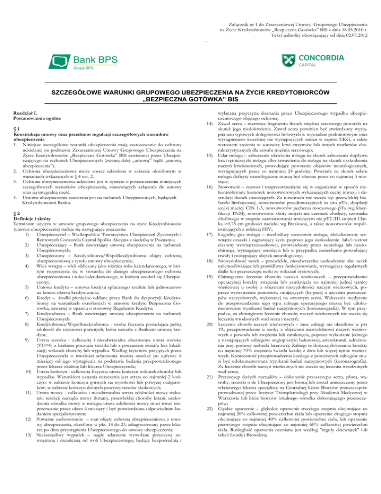 Załącznik nr 1 do Zrzeszeniowej Umowy Grupowego Ubezpieczenia na Życie Kredytobiorców „Bezpieczna Gotówka” BIS z dnia 18.03.2010 r. Tekst jednolity obowiązujący od dnia 02.07.2012 . SZCZEGÓŁOWE WARUNKI GRUPOWEGO UBEZPIECZENIA NA ŻYCIE KREDYTOBIORCÓW „BEZPIECZNA GOTÓWKA” BIS Rozdział I. Postanowienia ogólne 14) §1 Konstrukcja umowy oraz przedmiot regulacji szczegółowych warunków ubezpieczenia 1. Niniejsze szczegółowe warunki ubezpieczenia mają zastosowanie do ochrony udzielanej na podstawie Zrzeszeniowej Umowy Grupowego Ubezpieczenia na Życie Kredytobiorców „Bezpieczna Gotówka” BIS zawieranej przez Ubezpieczającego na rachunek Ubezpieczonych (zwanej dalej „umową” bądź „umową ubezpieczenia”). 2. Ochrona ubezpieczeniowa może zostać udzielona w zakresie określonym w wariantach wskazanych w § 4 ust. 2. 3. Ochrona ubezpieczeniowa udzielana jest w oparciu o postanowienia niniejszych szczegółowych warunków ubezpieczenia, stanowiących załącznik do umowy oraz jej integralną część. 4. Umowa ubezpieczenia zawierana jest na rachunek Ubezpieczonych, będących Kredytobiorcami Banku. §2 Definicje i skróty Terminom użytym w umowie grupowego ubezpieczenia na życie Kredytobiorców (umowa ubezpieczenia) nadaje się następujące znaczenia: 1) Ubezpieczyciel – Wielkopolskie Towarzystwo Ubezpieczeń Życiowych i Rentowych Concordia Capital Spółka Akcyjna z siedzibą w Poznaniu; 2) Ubezpieczający – Bank zawierający umowę ubezpieczenia na rachunek Ubezpieczonych; 3) Ubezpieczony – Kredytobiorca/Współkredytobiorca objęty ochroną ubezpieczeniową z tytułu umowy ubezpieczenia;. 4) Wiek wstępu – wiek obliczany jako różnica roku kalendarzowego, w którym rozpoczyna się w stosunku do danego ubezpieczonego ochrona ubezpieczeniowa i roku kalendarzowego, w którym urodził się Ubezpieczony; 5) Umowa kredytu – umowa kredytu spłacanego ratalnie lub jednorazowo na koniec okresu kredytowania; 6) Kredyt – środki pieniężne oddane przez Bank do dyspozycji Kredytobiorcy na warunkach określonych w umowie kredytu Bezpieczna Gotówka, zawartej w oparciu o stosowny Regulamin Kredytu; 7) Kredytodawca – Bank zawierający umowę ubezpieczenia na rachunek Ubezpieczonych. 8) Kredytobiorca/Współkredytobiorca - osoba fizyczna posiadająca pełną zdolność do czynności prawnych, która zawarła z Bankiem umowę kredytu; 9) Utrata wzroku - całkowita i nieodwracalna obustronna utrata wzroku (VO=0, z brakiem poczucia światła lub z poczuciem światła bez lokalizacji) wskutek choroby lub wypadku. Według kryteriów przyjętych przez Ubezpieczyciela o trwałości schorzenia można orzekać po upływie 6 miesięcy od jego wystąpienia na podstawie badania przeprowadzonego przez lekarza okulistę lub lekarza Ubezpieczyciela; 10) Utrata kończyn - całkowita fizyczna utrata kończyn wskutek choroby lub wypadku. Warunkiem uznania roszczenia jest utrata co najmniej 2 kończyn: w zakresie kończyn górnych na wysokości lub powyżej nadgarstków, w zakresie kończyn dolnych powyżej stawów skokowych; 11) Utrata mowy - całkowita i nieodwracalna utrata zdolności mowy wskutek: resekcji narządu mowy (krtani), przewlekłej choroby krtani, uszkodzenia ośrodka mowy w mózgu; utrata zdolności mowy musi trwać nieprzerwanie przez okres 6 miesięcy i być potwierdzona odpowiednim badaniem specjalistycznym; 12) Poważne zachorowanie – stan objęty ochroną ubezpieczeniową z umowy ubezpieczenia, określony w pkt. 14 do 23, zdiagnozowany przez lekarza po dniu przystąpienia Ubezpieczonego do umowy ubezpieczenia; 13) Nieszczęśliwy wypadek – nagłe zdarzenie wywołane przyczyną zewnętrzną i niezależną od woli Ubezpieczonego, będące bezpośrednią i 15) 16) 17) 18) 19) 20) 21) 22) wyłączną przyczyną doznania przez Ubezpieczonego wypadku ubezpieczeniowego objętego ochroną; Zawał serca – martwica fragmentu tkanek mięśnia sercowego powstała na skutek jego niedokrwienia. Zawał serca powinien być stwierdzony wystąpieniem typowych dolegliwości bólowych w wywiadzie podmiotowym oraz wystąpieniem wcześniej nie występujących zmian w zapisie EKG, a także wzrostem stężenia w surowicy krwi enzymów lub innych markerów charakterystycznych dla zawału mięśnia sercowego; Udar mózgu – zaburzenie ukrwienia mózgu na skutek zaburzenia dopływu krwi tętniczej do mózgu albo krwawienia do mózgu na skutek uszkodzenia naczyń krwionośnych, powodujące powstanie objawów neurologicznych, występujących przez co najmniej 24 godziny. Powstałe na skutek udaru mózgu deficyty neurologiczne muszą być obecne przez co najmniej 3 miesiące; Nowotwór – rozrost i rozprzestrzenianie się w organizmie w sposób niekontrolowany komórek nowotworowych wykazujących cechy inwazji i destrukcji tkanek otaczających. Za nowotwór nie uważa się: przewlekłej białaczki limfatycznej, nowotworów przedinwazyjnych in situ pTis, dysplazji szyjki macicy CIN 1-3, nowotworów pęcherza moczowego pTa (wg klasyfikacji TNM), nowotworów skóry innych niż czerniak złośliwy, czerniaka złośliwego w stopniu zaawansowania mniejszym niż pT2 (III stopień Clarka >0,75 cm grubości nacieku wg Breslowa), a także nowotworów współistniejących z infekcją HIV; Łagodny guz mózgu – niezłośliwy nowotwór mózgu, zlokalizowany wewnątrz czaszki i zagrażający życiu poprzez jego uszkodzenie lub/i wzrost ciasnoty wewnątrzczaszkowej, potwierdzony przez neurologa lub neurochirurga, wymagający usunięcia lub w przypadku zaniechania powodujący trwały i postępujący ubytek neurologiczny; Niewydolność nerek – przewlekłe, nieodwracalne uszkodzenie obu nerek uniemożliwiające ich prawidłowe funkcjonowanie, wymagające regularnych dializ lub przeszczepu nerki ze wskazań życiowych; Chirurgiczne leczenie choroby naczyń wieńcowych – przeprowadzenie operacyjnej korekty zwężenia lub zamknięcia co najmniej jednej tętnicy wieńcowej u osoby z