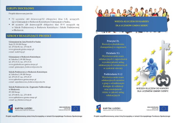 GRUPY DOCELOWE Projekt skierowany jest do: § 72 uczni ów (40 dziewcząt/32 chłopców) klas I-II, uczących się w Gimnazjum w Borkowie Kościelnym i Gimnazjum w Susku, § 48 uczniów (28 dziewcząt/20 chłopców) klas IV-V uczących się w Szkole Podstawowej w Borkowie Kościelnym i Szkole Podstawowej w Bledzewie. WIEDZA KLUCZEM DO KARIERY DLA UCZNIÓW GMINY SIERPC SZKOŁY REALIZUJĄCE PROJEKT Gimnazjum im. Jana Pawła II w Susku Susk 35, 09-200 Sierpc tel. 275-84-90, fax. 275-84-91 www.gimsusk.gmina.sierpc.pl e-mail [email protected] Gimnazjum w Borkowie Kościelnym ul. Szkolna 2, 09-200 Sierpc tel. 275-15-31, fax. 275-15-31 www.gimborkowo.gmina.sierpc.pl e-mail [email protected] Szkoła Podstawowa w Borkowie Kościelnym ul. Szkolna 2, 09-200 Sierpc tel. 275-25-37, fax. 275-25-37 www.spborkowo.gmina.sierpc.pl e-mail [email protected] Szkoła Podstawowa im. Zygmunta Padlewskiego w Bledzewie 09–200 Sierpc tel. 275-48-81, fax. 275-48-81 www.spbledzewo.gmina.sierpc.pl e-mail: [email protected] Projekt współfinansowany przez Unię Europejską w ramach Europejskiego Funduszu Społecznego Priorytet IX. Rozwój wykształcenia i kompetencji w regionach Działanie 9.1. Wyrównywanie szans edukacyjnych i zapewnienie wysokiej jakości usług edukacyjnych świadczonych w systemie oświaty Poddziałanie 9.1.2 Wyrównywanie szans edukacyjnych uczniów z grup o utrudnionym dostępie do edukacji oraz zmniejszenie różnic w jakości usług edukacyjnych Projekt współfinansowany przez Unię Europejską w ramach Europejskiego Funduszu Społecznego OPIS PROJEKTU Projekt „WIEDZA KLUCZEM DO KARIERY DLA UCZNIÓW GMINY SIERPC” jest współfinansowany przez Unię Europejską w ramach Europejskiego Funduszu Społecznego. Głównym celem projektu jest wyrównanie szans edukacyjnych uczniów pochodzących z terenu Gminy Sierpc poprzez organizację zajęć dodatkowych. Cele szczegółowe: § § § § § wyrównanie dysproporcji edukacyjnych uczniów ze specjalnymi potrzebami edukacyjnymi z Gimnazjum w Borkowie Kościelnym i Gimnazjum w Susku w nauce przedmiotów matematycznoprzyrodniczych, informatyki i języka angielskiego poprzez organizację dodatkowych zajęć dydaktyczno wyrównawczych, rozwój kompetencji kluczowych u uczniów szczególnie uzdolnionych z Gimnazjum w Borkowie Kościelnym i Gimnazjum w Susku poprzez organizację dodatkowych zajęć pozalekcyjnych z biologii, chemii, fizyki, informatyki, języka angielskiego i matematyki, podniesienie jakości procesu kształcenia oraz zwiększenie efektywności przyswajania i zastosowania zdobytej wiedzy w praktyce poprzez organizację zajęć edukacyjno-poznawczych w instytucjach naukowych oraz organizację letnich warsztatów naukowych, wyrównanie dysproporcji w nauce matematyki uczniów ze Szkoły Podstawowej w Borkowie Kościelnym i Szkoły Podstawowej w Bledzewie poprzez dodatkowe zajęcia dydaktyczno-wyrównawcze oraz rozwijanie zdolności matematycznych uczniów ze Szkoły Podstawowej w Borkowie Kościelnym i Szkoły Podstawowej w Bledzewie poprzez dodatkowe zajęcia z matematyki dla uczniów uzdolnionych, zwiększenie motywacji, podniesienie aspiracji do kontynuowania nauki poprzez doradztwo zawodowe, zajęcia z przedsiębiorczości i opiekę pedagogiczno-psychologiczną. Projekt współfinansowany przez Unię Europejską w ramach Europejskiego Funduszu Społecznego RODZAJE ZAJĘĆ W ramach projektu realizowane będą: § zajęcia z psychologiem dla uczniów szkół gimnazjalnych (12 godzin) § zajęcia z pedagogiem dla uczniów szkół gimnazjalnych (12 godzin) § zajęcia z doradcą zawodowym dla uczniów szkół gimnazjalnych § § § § § (12 godzin) zajęcia wyrównujące dysproporcje edukacyjne uczniów szkół gimnazjalnych z biologii (34 godziny), chemii (34 godziny), fizyki (34 godziny), matematyki (34 godziny), języka angielskiego (34 godziny) i informatyki (34 godziny) zajęcia rozwijające uzdolnienia uczniów szkół gimnazjalnych z biologii (34 godziny), chemii (34 godziny) ,fizyki (34 godziny), matematyki (34 godziny), języka angielskiego (34 godziny) i informatyki (34 godziny) zajęcia wyrównujące dysproporcje i rozwijające zainteresowania uczniów szkół podstawowych z matematyki (40 godzin) zajęcia edukacyjno-poznawcze w instytucjach naukowych letnie warsztaty naukowe. KADRA PROJEKTU § KIEROWNIK PROJEKTU - Beata Okraszewska § ASYSTENT KIEROWNIKA- Mirosław Hensel § SPECJALISTA DS. INFORMACJI, PROMOCJI I EWALUACJI - Maria Trzcińska § SPECJALISTA DO ROZLICZEŃ FINANSOWO - KSIĘGOWYCH - Anna Bielecka § OPIEKUN SZKÓŁ: (Gimnazjum i Szkoła Podstawowa w Borkowie Kościelnym) - Małgorzata Korpolińska § OPIEKUN SZKÓŁ: (Gimnazjum w Susku i Szkoła Podstawowa w Bledzewie) - Joanna Urbańska Projekt współfinansowany przez Unię Europejską w ramach Europejskiego Funduszu Społecznego