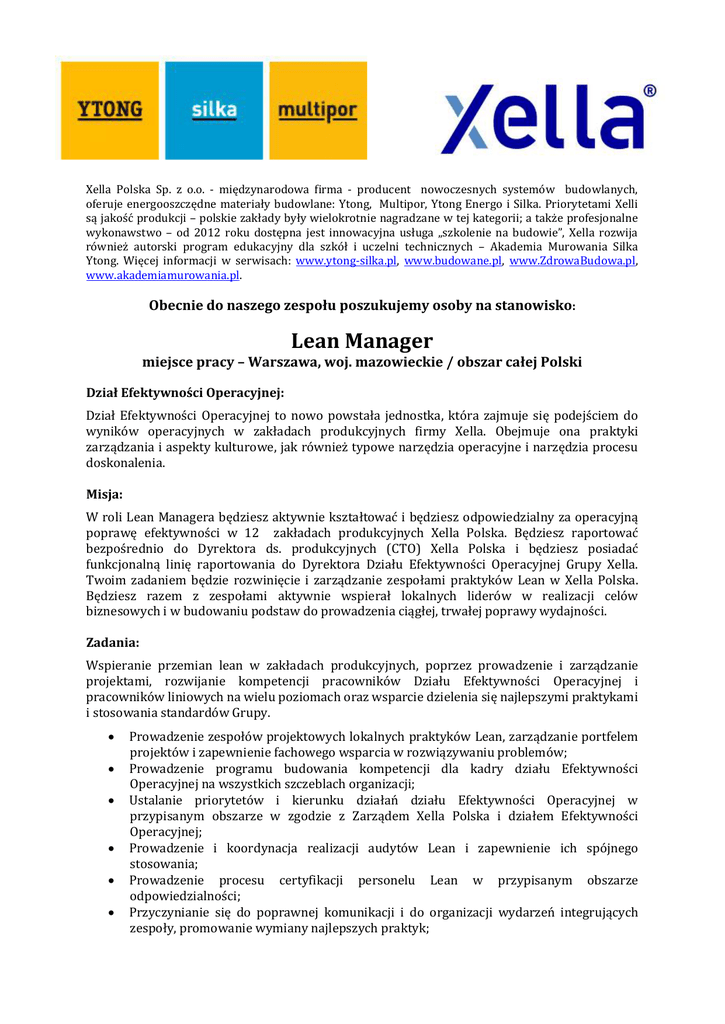 Xella Polska Sp. z o.o. - międzynarodowa firma - producent nowoczesnych systemów budowlanych, oferuje energooszczędne materiały budowlane: Ytong, Multipor, Ytong Energo i Silka. Priorytetami Xelli są jakość produkcji – polskie zakłady były wielokrotnie nagradzane w tej kategorii; a także profesjonalne wykonawstwo – od 2012 roku dostępna jest innowacyjna usługa „szkolenie na budowie”, Xella rozwija również autorski program edukacyjny dla szkół i uczelni technicznych – Akademia Murowania Silka Ytong. Więcej informacji w serwisach: www.ytong-silka.pl, www.budowane.pl, www.ZdrowaBudowa.pl, www.akademiamurowania.pl. Obecnie do naszego zespołu poszukujemy osoby na stanowisko: Lean Manager miejsce pracy – Warszawa, woj. mazowieckie / obszar całej Polski Dział Efektywności Operacyjnej: Dział Efektywności Operacyjnej to nowo powstała jednostka, która zajmuje się podejściem do wyników operacyjnych w zakładach produkcyjnych firmy Xella. Obejmuje ona praktyki zarządzania i aspekty kulturowe, jak również typowe narzędzia operacyjne i narzędzia procesu doskonalenia. Misja: W roli Lean Managera będziesz aktywnie kształtować i będziesz odpowiedzialny za operacyjną poprawę efektywności w 12 zakładach produkcyjnych Xella Polska. Będziesz raportować bezpośrednio do Dyrektora ds. produkcyjnych (CTO) Xella Polska i będziesz posiadać funkcjonalną linię raportowania do Dyrektora Działu Efektywności Operacyjnej Grupy Xella. Twoim zadaniem będzie rozwinięcie i zarządzanie zespołami praktyków Lean w Xella Polska. Będziesz razem z zespołami aktywnie wspierał lokalnych liderów w realizacji celów biznesowych i w budowaniu podstaw do prowadzenia ciągłej, trwałej poprawy wydajności. Zadania: Wspieranie przemian lean w zakładach produkcyjnych, poprzez prowadzenie i zarządzanie projektami, rozwijanie kompetencji pracowników Działu Efektywności Operacyjnej i pracowników liniowych na wielu poziomach oraz wsparcie dzielenia się najlepszymi praktykami i stosowania standardów Grupy. • • • • • • Prowadzenie zespołów projektowych lokalnych praktyków Lean, zarządzanie portfelem projektów i zapewnienie fachowego wsparcia w rozwiązywaniu problemów; Prowadzenie programu budowania kompetencji dla kadry działu Efektywności Operacyjnej na wszystkich szczeblach organizacji; Ustalanie priorytetów i kierunku działań działu Efektywności Operacyjnej w przypisanym obszarze w zgodzie z Zarządem Xella Polska i działem Efektywności Operacyjnej; Prowadzenie i koordynacja realizacji audytów Lean i zapewnienie ich spójnego stosowania; Prowadzenie procesu certyfikacji personelu Lean w przypisanym obszarze odpowiedzialności; Przyczynianie się do poprawnej komunikacji i do organizacji wydarzeń integrujących zespoły, promowanie wymiany najlepszych praktyk; Wymagania: • Wykształcenie wyższe preferowane techniczne; • Doświadczenie na podobnym stanowisku we wdrażaniu i optymalizacji procesów produkcyjnych min. 3 lata; mile widziane doświadczenie z zakresu doradztwa; • Znajomość metodologii i narzędzi lean management (5S, Kaizen, Six Sigma, OEE, SMED itp.); • Doświadczenie w zarządzaniu projektami; • Praktyczne doświadczenie w szkoleniu i coachowaniu innych z rozwoju nowych umiejętności; • Bardzo dobra znajomość języka angielskiego; • Prawo jazdy kat. B i gotowość do podróży; • Osobowość nastawiona na znajdywanie pragmatycznych rozwiązań złożonych problemów; • Wysoko rozwinięte umiejętności przywództwa, coachingu i budowania zespołu; • Wysoko rozwinięte umiejętności analityczne i komunikacyjne; • Wysoki poziom kompetencji społecznych, umiejętność pracy w różnych kulturach i zróżnicowanych środowiskach; Oferujemy: • Pracę w międzynarodowej firmie o ugruntowanej pozycji na rynku materiałów budowlanych; • Możliwość rozwoju i wdrażania własnych pomysłów; • • Udział w międzynarodowych projektach; Przyjazną atmosferę pracy; Osoby zainteresowane naszą ofertą prosimy o przesłanie CV na adres mailowy: [email protected] z zaznaczeniem w temacie maila „Lean Manager” Prosimy o zamieszczanie w dokumentach klauzuli: „Wyrażam zgodę na przetwarzanie moich danych osobowych zawartych w ofercie pracy na potrzeby obecnego i przyszłych procesów rekrutacji (zgodnie z ustawą z dnia 29.08.1997 r. o ochronie danych osobowych)”. Uprzejmie informujemy, że skontaktujemy się tylko z wybranymi kandydatami.