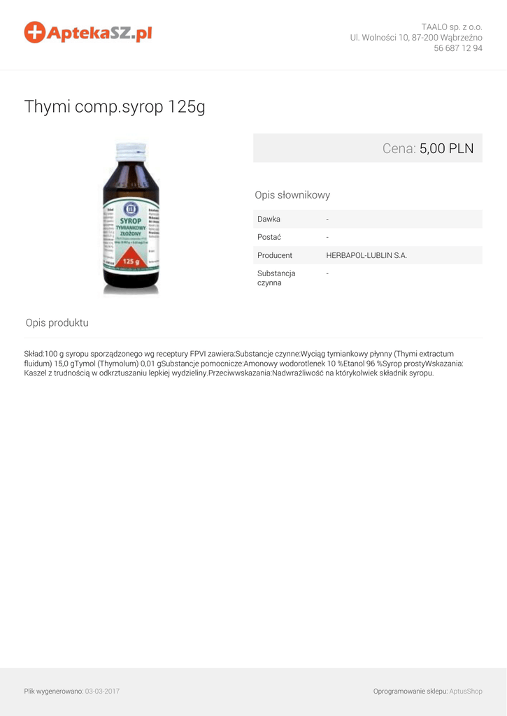 TAALO sp. z o.o. Ul. Wolności 10, 87-200 Wąbrzeźno 56 687 12 94 Thymi comp.syrop 125g Cena: 5,00 PLN Opis słownikowy Dawka - Postać - Producent HERBAPOL-LUBLIN S.A. Substancja czynna - Opis produktu Skład:100 g syropu sporządzonego wg receptury FPVI zawiera:Substancje czynne:Wyciąg tymiankowy płynny (Thymi extractum fluidum) 15,0 gTymol (Thymolum) 0,01 gSubstancje pomocnicze:Amonowy wodorotlenek 10 %Etanol 96 %Syrop prostyWskazania: Kaszel z trudnością w odkrztuszaniu lepkiej wydzieliny.Przeciwwskazania:Nadwrażliwość na którykolwiek składnik syropu. Plik wygenerowano: 03-03-2017 Powered by TCPDF (www.tcpdf.org) Oprogramowanie sklepu: AptusShop