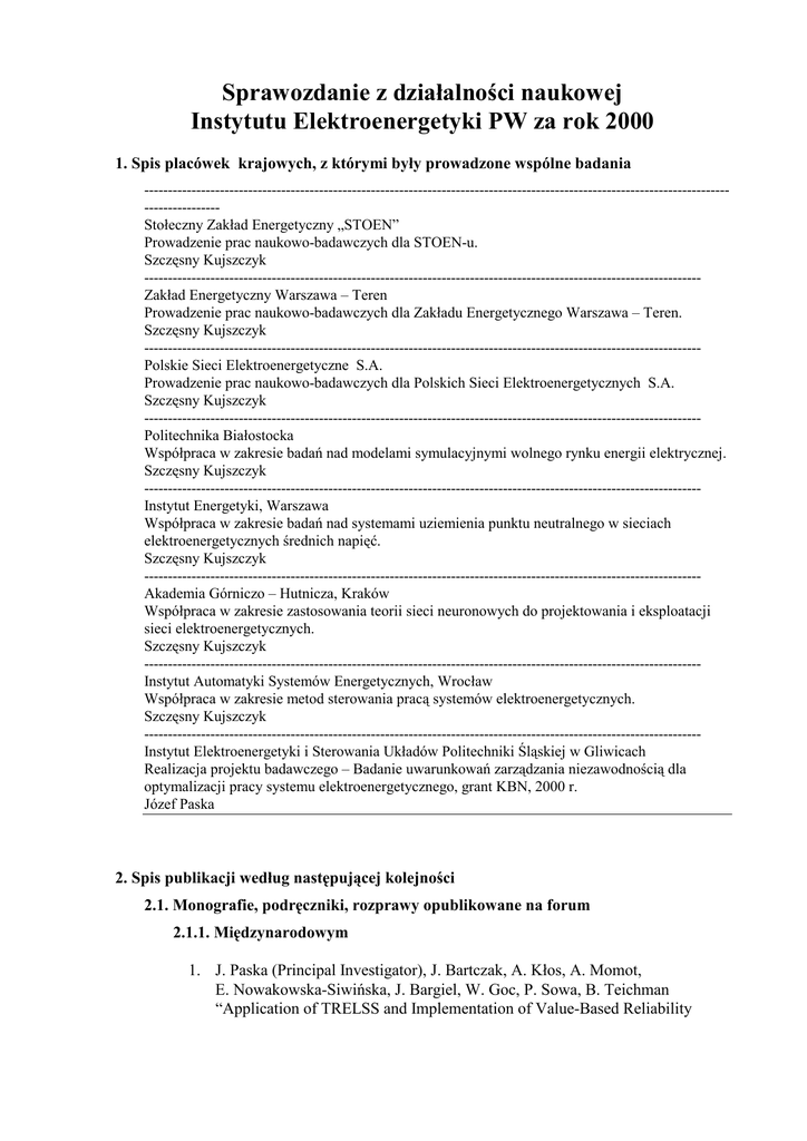 Sprawozdanie z działalności naukowej Instytutu Elektroenergetyki PW za rok 2000 1. Spis placówek krajowych, z którymi były prowadzone wspólne badania ------------------------------------------------------------------------------------------------------------------------------------------Stołeczny Zakład Energetyczny „STOEN” Prowadzenie prac naukowo-badawczych dla STOEN-u. Szczęsny Kujszczyk ---------------------------------------------------------------------------------------------------------------------Zakład Energetyczny Warszawa – Teren Prowadzenie prac naukowo-badawczych dla Zakładu Energetycznego Warszawa – Teren. Szczęsny Kujszczyk ---------------------------------------------------------------------------------------------------------------------Polskie Sieci Elektroenergetyczne S.A. Prowadzenie prac naukowo-badawczych dla Polskich Sieci Elektroenergetycznych S.A. Szczęsny Kujszczyk ---------------------------------------------------------------------------------------------------------------------Politechnika Białostocka Współpraca w zakresie badań nad modelami symulacyjnymi wolnego rynku energii elektrycznej. Szczęsny Kujszczyk ---------------------------------------------------------------------------------------------------------------------Instytut Energetyki, Warszawa Współpraca w zakresie badań nad systemami uziemienia punktu neutralnego w sieciach elektroenergetycznych średnich napięć. Szczęsny Kujszczyk ---------------------------------------------------------------------------------------------------------------------Akademia Górniczo – Hutnicza, Kraków Współpraca w zakresie zastosowania teorii sieci neuronowych do projektowania i eksploatacji sieci elektroenergetycznych. Szczęsny Kujszczyk ---------------------------------------------------------------------------------------------------------------------Instytut Automatyki Systemów Energetycznych, Wrocław Współpraca w zakresie metod sterowania pracą systemów elektroenergetycznych. Szczęsny Kujszczyk ---------------------------------------------------------------------------------------------------------------------Instytut Elektroenergetyki i Sterowania Układów Politechniki Śląskiej w Gliwicach Realizacja projektu badawczego – Badanie uwarunkowań zarządzania niezawodnością dla optymalizacji pracy systemu elektroenergetycznego, grant KBN, 2000 r. Józef Paska 2. Spis publikacji według następującej kolejności 2.1. Monografie, podręczniki, rozprawy opublikowane na forum 2.1.1. Międzynarodowym 1. J. Paska (Principal Investigator), J. Bartczak, A. Kłos, A. Momot, E. Nowakowska-Siwińska, J. Bargiel, W. Goc, P. Sowa, B. Teichman “Application of TRELSS and Implementation of Value-Based Reliability 2 Approach at Polish Power Grid Company”, TR-114816, EPRI, Palo Alto, CA, USA, and PPGC, Warsaw, Poland, March 2000. 2.1.2. Krajowym 1. E. Nowakowska-Siwińska, G.Grycz „Opis rozwiązań taryfowych dla energii elektrycznej w wybranych krajach OECD”, ARE S.A., Warszawa 2000, ISBN 83-87574-25-2. 2. E. Nowakowska-Siwińska „Kształtowanie cen gazu ziemnego w warunkach konkurencyjnego rynku”, ARE S.A., Warszawa 2000, ISBN 83-87574-26-0. 3. D. Rasolomampionona „Internet : Źródło informacji dla elektroenergetyków”, WPW, 2000. 4. J. Marzecki „Elektroenergetyczne sieci miejskie”, Wydawnictwo Naukowo – Techniczne, Warszawa 2000, str 400, podręcznik akademicki, ISBN 83-2042563-8. 5. J. Marzecki „Rozdzielcze sieci elektroenergetyczne. Zagadnienia wybrane”, Państwowe Wydawnictwo Naukowe, Warszawa 2000, str 364, podręcznik akademicki, ISBN 83-01-13078-6. 6. P. Helt, M. Parol, P. Piotrowski „Metody sztucznej inteligencji w elektroenergetyce”, Oficyna Wydawnicza Politechniki Warszawskiej, Warszawa 2000. ISBN 83-7207-194-2. 2.2. Rozprawy doktorskie i habilitacyjne 2.2.1. Habilitacyjne 2.2.2. Doktorskie 1. D. CzyŜewski „Luminancyjny model samochodowych źródeł światła”, Politechnika Warszawska, 2000, promotor: prof. nzw. dr hab. W. śagan. 2. P. Pracki „Rozmieszczanie świetlówkowych opraw oświetlenia bezpośredniego według kryterium wyrównanego rozkładu luminancji w otoczeniu”, Politechnika Warszawska, 2000, promotor: prof. dr hab. inŜ. J.Bąk. 3. A. Wiśniewski „Minimalizowanie liczby opraw oświetleniowych przy oświetleniu ogólnym wnętrz”, Politechnika Warszawska, 2000, promotor: prof. dr hab. inŜ. J. Bąk. 2.2.3. Doktoranci pobierający stypendium 1. 2. 3. 4. 5. 6. 7. 8. 9. 10. 11. 12. Piotr Biczel - Promotor prof. dr hab. Antoni Dmowski Bartłomiej Kras - Promotor prof. dr hab. Antoni Dmowski Paweł Ozimek - Promotor prof. dr hab. Antoni Dmowski Mariusz Wiśniewski - Promotor prof. dr hab. Antoni Dmowski Dariusz CzyŜewski - Promotor prof. nzw. dr hab. Wojciech śagan Rafał Krupiński - Promotor prof. dr hab.. Wojciech śagan Paweł Okoń - Promotor prof. dr hab. Wojciech śagan Arkadiusz Krutkiewicz - Promotor prof. dr hab. Wojciech śagan Rafał Korupczyński - Promotor prof. dr hab. Wojciech śagan Filip Gabryelczyk - Promotor prof. dr hab. Wojciech śagan Michał Kołodziej - Promotor prof. dr hab. Wojciech śagan Adam Kotowicz - Promotor prof. dr hab. Wojciech śagan 3 13. 14. 15. 16. 17. 18. Marcin Januszewski – Promotor prof. dr hab. Jan Machowski Michał Kiembrowski - Promotor prof. dr hab. Jan Machowski Waldemar Bandzul – Promotor prof. dr hab. Szczęsny Kujszczyk Krzysztof KsięŜyk – Promotor prof. dr hab. Szczęsny Kujszczyk Dariusz Papierzewski – Promotor prof. dr hab. Szczęsny Kujszczyk Piotr Konarzewski – Promotor prof. dr hab. Szczęsny Kujszczyk 2.3. Oryginalne prace naukowe w recenzowanych czasopismach międzynarodowych 1. J. Machowski, S. Robak, J. W. Bialek, J. R. Bumby, N. Abi-Samra “Decentralized Stability-Enhancing Control of Synchronous Generator”, IEEE paper PE-007PRS, 04-2000. 2.4. Oryginalne prace naukowe w recenzowanych czasopismach krajowych 1. 2. 3. 4. 5. 6. 7. 8. 9. 10. 