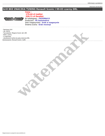 Informacje o produkcie Utworzono 03-03-2017 Grill BEZ ZNACZKA TUNING Renault Scenic I 99-03 czarny DRL Cena : 179,44 zł (netto) 220,71 zł (brutto) Nr katalogowy : FKSGRN415 Producent : FK Automotive Stan magazynowy : brak w magazynie Średnia ocena : brak recenzji w at er m ar k - Sportowy Grill - rok: 99-03 - Typ pojazdu: Megane Scenic (JA / JM) - Kolor: czarny - 2-częściowy - wbudowane świtła do jazdy dziennej DRL Zastosowanie: Renault Scenic 2 (JM) Wygenerowano w programie www.oscGold.com