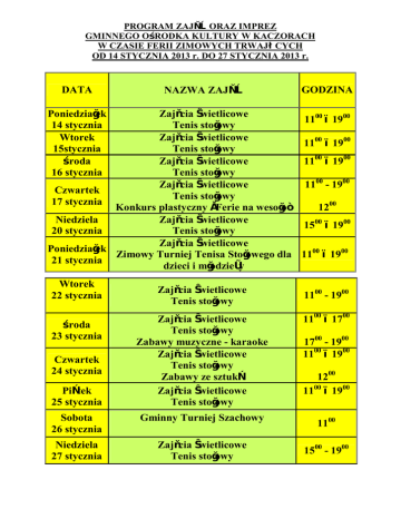 PROGRAM ZAJĘĆ ORAZ IMPREZ GMINNEGO OŚRODKA KULTURY W KACZORACH W CZASIE FERII ZIMOWYCH TRWAJĄCYCH OD 14 STYCZNIA 2013 r. DO 27 STYCZNIA 2013 r. DATA NAZWA ZAJĘĆ GODZINA Zajęcia świetlicowe 1100 – 1900 Tenis stołowy Zajęcia świetlicowe 1100 – 1900 Tenis stołowy Zajęcia świetlicowe 1100 – 1900 Tenis stołowy Zajęcia świetlicowe 1100 - 1900 Czwartek Tenis stołowy 17 stycznia Konkurs plastyczny „Ferie na wesoło” 1200 Niedziela Zajęcia świetlicowe 1500 – 1900 20 stycznia Tenis stołowy Zajęcia świetlicowe Poniedziałek Zimowy Turniej Tenisa Stołowego dla 1100 – 1900 21 stycznia dzieci i młodzieży Poniedziałek 14 stycznia Wtorek 15stycznia Środa 16 stycznia Wtorek 22 stycznia Zajęcia świetlicowe Tenis stołowy 1100 - 1900 Zajęcia świetlicowe Tenis stołowy Zabawy muzyczne - karaoke Zajęcia świetlicowe Tenis stołowy Zabawy ze sztuką Zajęcia świetlicowe Tenis stołowy 1100 – 1700 Sobota 26 stycznia Gminny Turniej Szachowy 1100 Niedziela 27 stycznia Zajęcia świetlicowe Tenis stołowy 1500 - 1900 Środa 23 stycznia Czwartek 24 stycznia Piątek 25 stycznia 1700 - 1900 1100 – 1900 1200 1100 – 1900