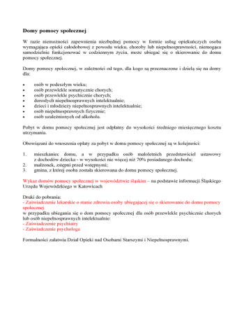 Domy pomocy społecznej W razie niemożności zapewnienia niezbędnej pomocy w formie usług opiekuńczych osoba wymagająca opieki całodobowej z powodu wieku, choroby lub niepełnosprawności, niemogąca samodzielnie funkcjonować w codziennym życiu, może ubiegać się o skierowanie do domu pomocy społecznej. Domy pomocy społecznej, w zależności od tego, dla kogo są przeznaczone i dzielą się na domy dla: • • • • • • • osób w podeszłym wieku; osób przewlekle somatycznie chorych; osób przewlekle psychicznie chorych; dorosłych niepełnosprawnych intelektualnie; dzieci i młodzieży niepełnosprawnych intelektualnie; osób niepełnosprawnych fizycznie; osób uzależnionych od alkoholu. Pobyt w domu pomocy społecznej jest odpłatny do wysokości średniego miesięcznego kosztu utrzymania. Obowiązani do wnoszenia opłaty za pobyt w domu pomocy społecznej są w kolejności: 1. 2. 3. mieszkaniec domu, a w przypadku osób małoletnich przedstawiciel ustawowy z dochodów dziecka - w wysokości nie więcej niż 70% posiadanego dochodu; małżonek, zstępni przed wstępnymi; gmina, z której osoba została skierowana do domu pomocy społecznej. Wykaz domów pomocy społecznej w województwie śląskim – na podstawie informacji Śląskiego Urzędu Wojewódzkiego w Katowicach Druki do pobrania: - Zaświadczenie lekarskie o stanie zdrowia osoby ubiegającej się o skierowanie do domu pomocy społecznej w przypadku ubiegania się o dom pomocy społecznej dla osób przewlekle psychicznie chorych lub osób niepełnosprawnych intelektualnie: - Zaświadczenie psychiatry - Zaświadczenie psychologa Formalności załatwia Dział Opieki nad Osobami Starszymi i Niepełnosprawnymi.