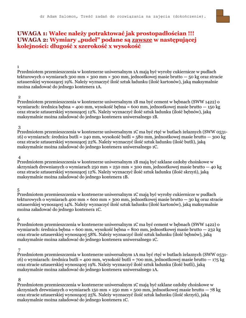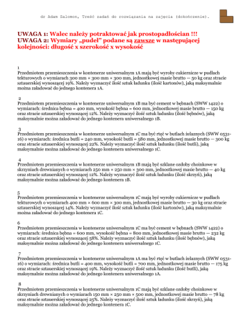 dr Adam Salomon, Treść zadań do rozwiązania na zajęcia (dokończenie). UWAGA 1: Walec należy potraktować jak prostopadłościan !!! UWAGA 2: Wymiary „pudeł” podane są zawsze w następującej kolejności: długość x szerokość x wysokość 1 Przedmiotem przemieszczenia w kontenerze uniwersalnym 1A mają być wyroby cukiernicze w pudłach tekturowych o wymiarach 300 mm × 300 mm × 300 mm, jednostkowej masie brutto — 50 kg oraz stracie sztauerskiej wynoszącej 19%. Należy wyznaczyć ilość sztuk ładunku (ilość kartonów), jaką maksymalnie można załadować do jednego kontenera 1A. 2 Przedmiotem przemieszczenia w kontenerze uniwersalnym 1B ma być cement w bębnach (SWW 1422) o wymiarach: średnica bębna = 400 mm, wysokość bębna = 600 mm, jednostkowej masie brutto — 150 kg oraz stracie sztauerskiej wynoszącej 12%. Należy wyznaczyć ilość sztuk ładunku (ilość bębnów), jaką maksymalnie można załadować do jednego kontenera uniwersalnego 1B. 3 Przedmiotem przemieszczenia w kontenerze uniwersalnym 1C ma być rtęć w butlach żelaznych (SWW 053116) o wymiarach: średnica butli = 240 mm, wysokość butli = 580 mm, jednostkowej masie brutto — 300 kg oraz stracie sztauerskiej wynoszącej 22%. Należy wyznaczyć ilość sztuk ładunku (ilość butli), jaką maksymalnie można załadować do jednego kontenera uniwersalnego 1C. 4 Przedmiotem przemieszczenia w kontenerze uniwersalnym 1B mają być szklane ozdoby choinkowe w skrzyniach drewnianych o wymiarach 250 mm × 250 mm × 300 mm, jednostkowej masie brutto — 40 kg oraz stracie sztauerskiej wynoszącej 12%. Należy wyznaczyć ilość sztuk ładunku (ilość skrzyń), jaką maksymalnie można załadować do jednego kontenera 1B. 5 Przedmiotem przemieszczenia w kontenerze uniwersalnym 1C mają być wyroby cukiernicze w pudłach tekturowych o wymiarach 400 mm × 600 mm × 300 mm, jednostkowej masie brutto — 30 kg oraz stracie sztauerskiej wynoszącej 14%. Należy wyznaczyć ilość sztuk ładunku (ilość kartonów), jaką maksymalnie można załadować do jednego kontenera 1C. 6 Przedmiotem przemieszczenia w kontenerze uniwersalnym 1C ma być cement w bębnach (SWW 1422) o wymiarach: średnica bębna = 600 mm, wysokość bębna = 800 mm, jednostkowej masie brutto — 232 kg oraz stracie sztauerskiej wynoszącej 58%. Należy wyznaczyć ilość sztuk ładunku (ilość bębnów), jaką maksymalnie można załadować do jednego kontenera uniwersalnego 1C. 7 Przedmiotem przemieszczenia w kontenerze uniwersalnym 1A ma być rtęć w butlach żelaznych (SWW 053116) o wymiarach: średnica butli = 400 mm, wysokość butli = 700 mm, jednostkowej masie brutto — 175 kg oraz stracie sztauerskiej wynoszącej 19%. Należy wyznaczyć ilość sztuk ładunku (ilość butli), jaką maksymalnie można załadować do jednego kontenera uniwersalnego 1A. 8 Przedmiotem przemieszczenia w kontenerze uniwersalnym 1C mają być szklane ozdoby choinkowe w skrzyniach drewnianych o wymiarach 150 mm × 250 mm × 500 mm, jednostkowej masie brutto — 78 kg oraz stracie sztauerskiej wynoszącej 25%. Należy wyznaczyć ilość sztuk ładunku (ilość skrzyń), jaką maksymalnie można załadować do jednego kontenera 1C. dr Adam Salomon, Treść zadań do rozwiązania na zajęcia (dokończenie). 9 Przedmiotem przemieszczenia w kontenerze uniwersalnym 1A mają być wyroby cukiernicze w pudłach tekturowych o wymiarach 400 mm × 2400 mm × 600 mm, jednostkowej masie brutto — 60 kg oraz stracie sztauerskiej wynoszącej 11%. Należy wyznaczyć ilość sztuk ładunku (ilość kartonów), jaką maksymalnie można załadować do jednego kontenera 1A. 10 Przedmiotem przemieszczenia w kontenerze uniwersalnym 1A ma być cement w bębnach (SWW 1422) o wymiarach: średnica bębna = 500 mm, wysokość bębna = 600 mm, jednostkowej masie brutto — 300 kg oraz stracie sztauerskiej wynoszącej 28%. Należy wyznaczyć ilość sztuk ładunku (ilość bębnów), jaką maksymalnie można załadować do jednego kontenera uniwersalnego 1A. 11 Przedmiotem przemieszczenia w kontenerze uniwersalnym 1A ma być rtęć w butlach żelaznych (SWW 053116) o wymiarach: średnica butli = 490 mm, wysokość butli = 770 mm, jednostkowej masie brutto — 222 kg oraz stracie sztauerskiej wynoszącej 22%. Należy wyznaczyć ilość sztuk ładunku (ilość butli), jaką maksymalnie można załadować do jednego kontenera uniwersalnego 1A. 12 Przedmiotem przemieszczenia w kontenerze uniwersalnym 1C mają być wyroby cukiernicze w pudłach tekturowych o wymiarach 400 mm × 300 mm × 300 mm, jednostkowej masie brutto — 20 kg oraz stracie sztauerskiej wynoszącej 16%. Należy wyznaczyć ilość sztuk ładunku (ilość kartonów), jaką maksymalnie można załadować do jednego kontenera 1C. 13 Przedmiotem przemieszczenia w kontenerze uniwersalnym 1C ma być cement w bębnach (SWW 1422) o wymiarach: średnica bębna = 600 mm, wysokość bębna = 800 mm, jednostkowej masie brutto — 232 kg oraz stracie sztauerskiej wynoszącej 58%. Należy wyznaczyć ilość sztuk ładunku (ilość bębnów), jaką maksymalnie można załadować do jednego kontenera uniwersalnego 1C. 14 Przedmiotem przemieszczenia w kontenerze uniwersalnym 1A ma być rtęć w butlach żelaznych (SWW 053116) o wymiarach: średnica butli = 440 mm, wysokość butli = 990 mm, jednostkowej masie brutto — 525 kg oraz stracie sztauerskiej wynoszącej 48%. Należy wyznaczyć ilość sztuk ładunku (ilość butli), jaką maksymalnie można załadować do jednego kontenera uniwersalnego 1A. 15 Przedmiotem przemieszczenia w kontenerze uniwersalnym 1B mają być szklane ozdoby choinkowe w skrzyniach drewnianych o wymiarach 450 mm × 350 mm × 400 mm, jednostkowej masie brutto — 45 kg oraz stracie sztauerskiej wynoszącej 19%. Należy wyznaczyć ilość sztuk ładunku (ilość skrzyń), jaką maksymalnie można załadować do jednego kontenera 1B. 16 Przedmiotem przemieszczenia w kontenerze uniwersalnym 1B mają by