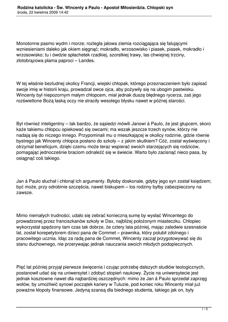 Rodzina katolicka - Św. Wincenty a Paulo - Apostoł Miłosierdzia. Chłopski syn środa, 22 kwietnia 2009 14:42 Monotonne pasmo wydm i morze; rozległa jałowa ziemia rozciągająca się falującymi wzniesieniami daleko jak okiem sięgnąć; mokradło, wrzosowisko i piasek, piasek, mokradło i wrzosowisko; tu i ówdzie spłachetek rzadkiej, szorstkiej trawy, las chwiejnej trzciny, złotobrązowa plama paproci – Landes. W tej właśnie bezludnej okolicy Francji, wiejski chłopak, którego przeznaczeniem było zapisać swoje imię w historii kraju, prowadzał owce ojca, aby pożywiły się na ubogim pastwisku. Wincenty był niepozornym małym chłopcem, miał jednak duszę błędnego rycerza, zaś jego rozświetlone Bożą łaską oczy nie straciły wesołego błysku nawet w późnej starości. Był również inteligentny – tak bardzo, że sąsiedzi mówili Janowi á Paulo, że jest głupcem, skoro każe takiemu chłopcu opiekować się owcami; ma wszak jeszcze trzech synów, którzy nie nadają się do niczego innego. Przypominali mu o mieszkającej w okolicy rodzinie, gdzie równie bystrego jak Wincenty chłopca posłano do szkoły – z jakim skutkiem? Cóż, został wyświęcony i otrzymał beneficjum, dzięki czemu może teraz wspierać swoich starzejących się rodziców, pomagając jednocześnie braciom odnaleźć się w świecie. Warto było zacisnąć nieco pasa, by osiągnąć coś takiego. Jan á Paulo słuchał i chłonął ich argumenty. Byłoby doskonale, gdyby jego syn został księdzem; być może, przy odrobinie szczęścia, nawet biskupem – los rodziny byłby zabezpieczony na zawsze. Mimo niemałych trudności, udało się zebrać konieczną sumę by wysłać Wincentego do prowadzonej przez franciszkanów szkoły w Dax, najbliżej położonym miasteczku. Chłopiec wykorzystał spędzony tam czas tak dobrze, że cztery lata później, mając zaledwie szesnaście lat, został korepetytorem dzieci pana de Commet – prawnika, który polubił zdolnego i pracowitego ucznia. Idąc za radą pana de Commet, Wincenty zaczął przygotowywać się do stanu duchownego, nie przerywając jednak nauczania swoich młodych podopiecznych. Pięć lat później przyjął pierwsze święcenia i czując potrzebę dalszych studiów teologicznych, postanowił udać się na uniwersytet i zdobyć stopień naukowy. Życie na uniwersytecie jest jednak kosztowne nawet dla najbardziej oszczędnych: mimo że Jan á Paulo sprzedał zaprzęg wołów, by umożliwić synowi początek kariery w Tuluzie, pod koniec roku Wincenty miał już poważne kłopoty finansowe. Jedyną szansą dla biednego studenta, takiego jak on, były 1/5 Rodzina katolicka - Św. Wincenty a Paulo - Apostoł Miłosierdzia. Chłopski syn środa, 22 kwietnia 2009 14:42 korepetycje w trakcie letnich wakacji; tu Wincentemu się poszczęściło. Szlachcic, który go zatrudnił był tak zachwycony wynikami, że gdy wakacje się skończyły, uparł się, by młody nauczyciel zabrał swych podopiecznych do Tuluzy. Uczęszczali tam na uczelnię, zaś Wincenty w dalszym ciągu nadzorował ich naukę – i to z sukcesami, które sprawiły, że wkrótce jeszcze kilku szlachciców powierzyło mu wykształcenie swoich synów. Stanął więc na czele niewielkiej szkoły. Prowadzenie takiego przedsięwzięcia przy jednoczesnym poświęceniu się własnym studiom nie wydaje się najłatwiejszym z zadań, Wincenty pracował jednak ciężko i sumiennie. Już wtedy wydawało się, że ma dziwny dar wywierania na innych dobrego wpływu. Przez siedem lat pełnił swą podwójną rolę, stale osiągając sukcesy. Ukończył studia teologiczne, zdobył tytuł naukowy i został wyświęcony na księdza w pierwszych latach siedemnastego wieku – wieku, który miał się okazać brzemienny w wydarzenia, ważne zarówno dla Francji, jak i jego samego. Aż do tej chwili niewiele różniło Wincentego od każdego z młodych studentów, jakich można było spotkać w owych czasach. Cieszył się miłością i szacunkiem tych, którzy bliżej go poznali, ale to wszystko. Z kapłaństwem przyszła jednak zmiana. Od tej pory miał pójść własną, jasno wytyczoną ścieżką – ścieżką, która biegła inaczej niż drogi współczesnych mu ludzi i która niosła ze sobą pierwsze zapowiedzi tego, kim stanie się w przyszłości. Pierwsza Msza święta nowo wyświęconego księdza była zwykle odprawiana w sposób dość ceremonialny i nie pozbawiony pompy. Kleryk, który chce zapewnić sobie dostatnie życie powinien przecież pokazać ludziom, że się do niego nadaje; cnota pokory nie była więc szczególnie modna. Z niemałym zdziwieniem przyjęto zatem decyzję Wincentego, który stanowczo nie zgadzając się na obecność obcych, odprawił pierwszą Mszę świętą w zapomnianej, niewielkiej kapliczce, znajdującej się w lesie niedaleko Bajet, ukochanej przez niego ze względu na ciszę i odosobnienie. Tam właśnie, samotnie, jeżeli nie liczyć wymaganej rubrykami obecności akolity i ministranta, w drżeniu na myśl o własnej małości, składając po raz pierwszy wielką Ofiarę, przysiągł być wiernym na śmierć i życie sługą swojego Pana. Wyobrażenie o tym, jak powinno wyglądać życie duchownego miał bardzo wygórowane; w późnym wieku mawiał często, że gdyby nie to, że już jest księdzem, nigdy nie ośmieliłby się nim zostać. Stary przyjaciel i patron Wincentego, pan de Commet, bardzo chciał wyświadczyć przysługę młodemu kapłanowi. Dzięki swym wpływom doprowadził do przyznania mu zwierzchnictwa nad liczącą się parafią Thil, znajdującą się w pobliżu miasteczka Dax. Był to uśmiech losu, którego wielu mogłoby pozazdrościć; do uszu Wincentego dotarła jednak wiadomość o konkurencie do tego samego stanowiska utrzymującym, że przyobiecano mu je w Rzymie. Zamiast 2/5 Rodzina katolicka - Św. Wincenty a Paulo - Apostoł Miłosierdzia. Chłopski syn środa, 22 kwietnia 2009 14:42 kwestionować jego s