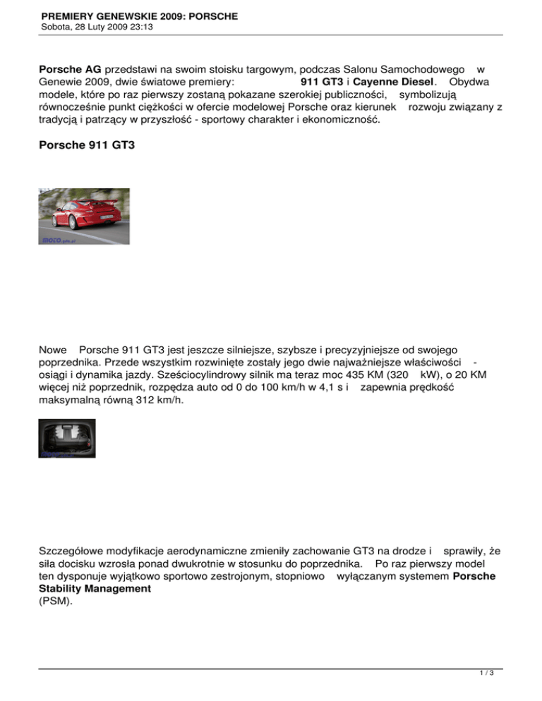 PREMIERY GENEWSKIE 2009: PORSCHE Sobota, 28 Luty 2009 23:13 Porsche AG przedstawi na swoim stoisku targowym, podczas Salonu Samochodowego w Genewie 2009, dwie światowe premiery: 911 GT3 i Cayenne Diesel. Obydwa modele, które po raz pierwszy zostaną pokazane szerokiej publiczności, symbolizują równocześnie punkt ciężkości w ofercie modelowej Porsche oraz kierunek rozwoju związany z tradycją i patrzący w przyszłość - sportowy charakter i ekonomiczność. Porsche 911 GT3 Nowe Porsche 911 GT3 jest jeszcze silniejsze, szybsze i precyzyjniejsze od swojego poprzednika. Przede wszystkim rozwinięte zostały jego dwie najważniejsze właściwości osiągi i dynamika jazdy. Sześciocylindrowy silnik ma teraz moc 435 KM (320 kW), o 20 KM więcej niż poprzednik, rozpędza auto od 0 do 100 km/h w 4,1 s i zapewnia prędkość maksymalną równą 312 km/h. Szczegółowe modyfikacje aerodynamiczne zmieniły zachowanie GT3 na drodze i sprawiły, że siła docisku wzrosła ponad dwukrotnie w stosunku do poprzednika. Po raz pierwszy model ten dysponuje wyjątkowo sportowo zestrojonym, stopniowo wyłączanym systemem Porsche Stability Management (PSM). 1/3 PREMIERY GENEWSKIE 2009: PORSCHE Sobota, 28 Luty 2009 23:13 Porsche Cayenne Diesel Drugą nowością prezentowaną przez Porsche w Genewie jest model Cayenne Diesel. Połączenie sportowego, wielofunkcyjnego samochodu terenowego Porsche z ekonomicznym napędem gwarantującym wysoki moment obrotowy sprawdzi się przede wszystkim w samochodach przeznaczonych do pokonywania długich tras lub ciągnięcia przyczepy. Nie można zapomnieć o doskonałych właściwościach dotyczących dynamiki jazdy, bezpieczeństwa i umiejętności terenowych, za które Cayenne chwalony jest na całym świecie. Z zewnątrz nowy model wygląda jak Cayenne z silnikiem benzynowym V6 i podobnie jak on ma napis Cayenne na klapie tylnej. Silnik V6, o wysokiej kulturze pracy, uzyskuje z trzech litrów pojemności moc 240 KM (176 kW), która pozwala rozpędzić samochód do 214 km/h. Godny uwagi jest moment obrotowy osiągający już przy 2000 obr/min. najwyższą wartość 550 Nm. Nowy Cayenne ma także bardzo dobre przyspieszenie: od zera do 100 km/h rozpędza się w 8,3 s. Jednakże jego największą zaletą jest niskie zużycie paliwa: na 100 km Cayenne Diesel potrzebuje średnio 9,3 litra paliwa, a dzięki zbiornikowi paliwa o pojemności 100 litrów może pokonać bez tankowania nawet 1000 km. 2/3 PREMIERY GENEWSKIE 2009: PORSCHE Sobota, 28 Luty 2009 23:13 Cayenne Diesel oferowany jest tylko z sześciostopniową automatyczną przekładnią Porsche Tiptronic S. Montowany seryjnie w modelu Cayenne system Porsche Stability Management (PSM) został dostosowany do charakterystyki pracy silnika wysokoprężnego. O idealne właściwości jezdne na drodze i w terenie dba inteligentny system Porsche Traction Management (PTM), który w zależności od sytuacji rozdziela napęd na tylne i przednie koła. Materiały źródłowe: Kulczyk Tradex (20.02.2009) 3/3