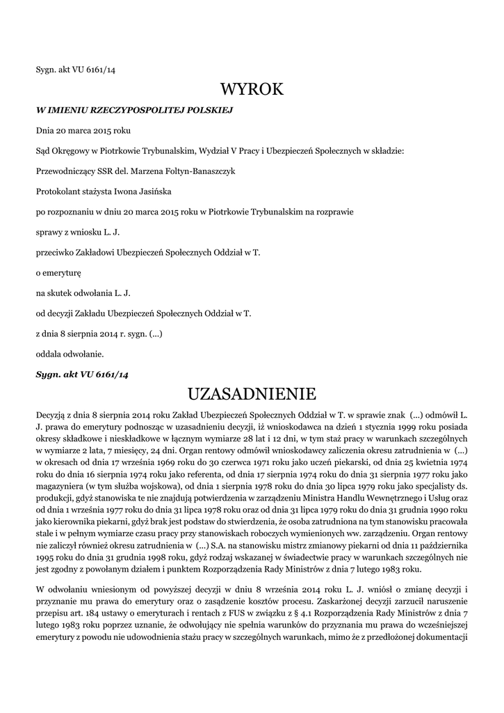 Sygn. akt VU 6161/14 WYROK W IMIENIU RZECZYPOSPOLITEJ POLSKIEJ Dnia 20 marca 2015 roku Sąd Okręgowy w Piotrkowie Trybunalskim, Wydział V Pracy i Ubezpieczeń Społecznych w składzie: Przewodniczący SSR del. Marzena Foltyn-Banaszczyk Protokolant stażysta Iwona Jasińska po rozpoznaniu w dniu 20 marca 2015 roku w Piotrkowie Trybunalskim na rozprawie sprawy z wniosku L. J. przeciwko Zakładowi Ubezpieczeń Społecznych Oddział w T. o emeryturę na skutek odwołania L. J. od decyzji Zakładu Ubezpieczeń Społecznych Oddział w T. z dnia 8 sierpnia 2014 r. sygn. (...) oddala odwołanie. Sygn. akt VU 6161/14 UZASADNIENIE Decyzją z dnia 8 sierpnia 2014 roku Zakład Ubezpieczeń Społecznych Oddział w T. w sprawie znak (...) odmówił L. J. prawa do emerytury podnosząc w uzasadnieniu decyzji, iż wnioskodawca na dzień 1 stycznia 1999 roku posiada okresy składkowe i nieskładkowe w łącznym wymiarze 28 lat i 12 dni, w tym staż pracy w warunkach szczególnych w wymiarze 2 lata, 7 miesięcy, 24 dni. Organ rentowy odmówił wnioskodawcy zaliczenia okresu zatrudnienia w (...) w okresach od dnia 17 września 1969 roku do 30 czerwca 1971 roku jako uczeń piekarski, od dnia 25 kwietnia 1974 roku do dnia 16 sierpnia 1974 roku jako referenta, od dnia 17 sierpnia 1974 roku do dnia 31 sierpnia 1977 roku jako magazyniera (w tym służba wojskowa), od dnia 1 sierpnia 1978 roku do dnia 30 lipca 1979 roku jako specjalisty ds. produkcji, gdyż stanowiska te nie znajdują potwierdzenia w zarządzeniu Ministra Handlu Wewnętrznego i Usług oraz od dnia 1 września 1977 roku do dnia 31 lipca 1978 roku oraz od dnia 31 lipca 1979 roku do dnia 31 grudnia 1990 roku jako kierownika piekarni, gdyż brak jest podstaw do stwierdzenia, że osoba zatrudniona na tym stanowisku pracowała stale i w pełnym wymiarze czasu pracy przy stanowiskach roboczych wymienionych ww. zarządzeniu. Organ rentowy nie zaliczył również okresu zatrudnienia w (...) S.A. na stanowisku mistrz zmianowy piekarni od dnia 11 października 1995 roku do dnia 31 grudnia 1998 roku, gdyż rodzaj wskazanej w świadectwie pracy w warunkach szczególnych nie jest zgodny z powołanym działem i punktem Rozporządzenia Rady Ministrów z dnia 7 lutego 1983 roku. W odwołaniu wniesionym od powyższej decyzji w dniu 8 września 2014 roku L. J. wniósł o zmianę decyzji i przyznanie mu prawa do emerytury oraz o zasądzenie kosztów procesu. Zaskarżonej decyzji zarzucił naruszenie przepisu art. 184 ustawy o emeryturach i rentach z FUS w związku z § 4.1 Rozporządzenia Rady Ministrów z dnia 7 lutego 1983 roku poprzez uznanie, że odwołujący nie spełnia warunków do przyznania mu prawa do wcześniejszej emerytury z powodu nie udowodnienia stażu pracy w szczególnych warunkach, mimo że z przedłożonej dokumentacji wynika udokumentowanie wymaganego stażu 15 lat pracy w warunkach szczególnych. W uzasadnieniu odwołania wnioskodawca uznał, że organ mógł zakwestionować pracę od dnia 17 września 1969 roku do dnia 30 czerwca 1971 roku na stanowisku uczeń piekarski. Natomiast jako kierownik wykonywał prace o którym mowa w wykazie A dział XIV poz. 24 na wydziałach, w których jako podstawowe wykonywane są prace wymienione w wykazie A dział X poz. 11., jednocześnie sam wykonywał prace przy wypieku pieczywa jako piekarz. Takie prace wykonywał zarówno (...) Społem jak i w (...) S.A. Zakład Ubezpieczeń Społecznych Oddział w T. wniósł o oddalenie odwołania. Na rozprawie pełnomocnik wnioskodawcy popierał odwołanie. Sąd Okręgowy ustalił następujący stan faktyczny: Wnioskodawca L. J., urodzony w dniu (...), złożył w dniu 26 czerwca 2014 roku wniosek o przyznanie emerytury. Wnioskodawca był członkiem otwartego funduszu emerytalnego. W dniu 26 czerwca 2014 roku złożył wniosek o przekazanie środków zgromadzonych na rachunku OFE na dochody budżetu państwa. (dowód: wniosek o emeryturę k. 1-4 akta emerytalne) L. J. legitymuje się na dzień 1 stycznia 1999 roku okresem ubezpieczenia 28 lat i 12 dni, w tym staż pracy w warunkach szczególnych w wymiarze 2 lata, 7 miesięcy, 24 dni. Organ rentowy do okresu pracy w warunkach szczególnych zaliczył wnioskodawcy okres zatrudnienia w (...) Społem (...) w T. od dnia 1 września 1971 roku do dnia 24 kwietnia 1974 roku na stanowisku piekarz. Do stażu pracy w warunkach szczególnych organ rentowy nie zaliczył wnioskodawcy okresu zatrudnienia w (...) Społem (...) w T. w okresach: - od dnia 17 września 1969 roku do 30 czerwca 1971 roku na stanowisku uczeń piekarski; - od dnia 25 kwietnia 1974 roku do dnia 16 sierpnia 1974 roku na stanowisku referenta; - od dnia 17 sierpnia 1974 roku do dnia 31 sierpnia 1977 roku na stanowisku magazyniera ( w tym służba wojskowa); - od dnia 1 sierpnia 1978 roku do dnia 30 lipca 1979 roku na stanowisku specjalisty ds. produkcji; Organ rentowy stwierdził, że stanowiska te nie znajdują potwierdzenia w zarządzeniu Ministra Handlu Wewnętrznego i Usług z dnia 10 listopada 1986 roku, na które powołał się pracodawca. - od dnia 1 września 1977 roku do dnia 31 lipca 1978 roku oraz od dnia 31 lipca 1979 roku do dnia 31 grudnia 1990 roku na stanowisku kierownika piekarni. Organ rentowy podał, że brak jest podstaw do stwierdzenia, że osoba zatrudniona na tym stanowisku, pracowała stale i w pełnym wymiarze czasu pracy przy stanowiskach roboczych wymienionych ww. zarządzeniu. Organ rentowy nie zaliczył również wnioskodawcy okresu zatrudnienia w (...) S.A. - od dnia 11 października 1995 roku do dnia 31 grudnia 1998 roku na stanowisku mistrz zmianowy piekarni, gdyż rodzaj wskazanej w świadectwie pracy w warunkach szczególnych nie jest zgodny z powołanym działem i punktem Rozporządzenia Rady Ministrów z dnia 7 lutego 1983 roku. (okoliczności bezsporne; dowód: decyzja k. 19 akt ZUS; odpowiedź na odwołanie k.14-15) L. J. został zatrudniony w (...) Społem (...) w T. od dnia 17 września 1969 roku do dnia 30 czerwca 197