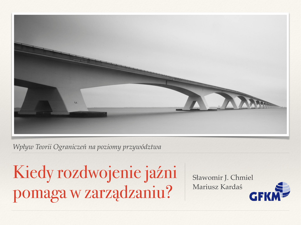 Wpływ Teorii Ograniczeń na poziomy przywództwa Kiedy rozdwojenie jaźni pomaga w zarządzaniu? Sławomir J. Chmiel Mariusz Kardaś Gdańska Fundacja Kształcenia Menedżerów Zakres • Postulaty Teorii Ograniczeń • Przywództwo procesowe vs przywództwo projektowe • Poziomy przywództwa • Poziomy przywództwa w zarządzaniu projektami • • Lider Projektu • Lider Liderów Projektu • Lider Programu Pożytki z rozdwojenia jaźni Gdańska Fundacja Kształcenia Menedżerów Teoria ograniczeń w zarządzaniu procesami • Wydolność całego systemu jest limitowana przez tzw. ‚ograniczenie systemu’ (wąskie gardło lub najsłabsze ogniwo). • Wzmacnianie elementów niebędących ograniczeniem systemu nie wpływa na poprawę działania całego systemu (lokalne optima nie mają znaczenia). • Miejsce występowania ‚ograniczenia’ powinno być decyzją strategiczną. • Organizacja rozwija się optymalnie zarządzając ‚ograniczeniami’ porzez: • identyfikację wszystkich ograniczeń systemu, • pełne wykorzystanie potencjału tych ograniczeń (reorganizacja), • podporządkowanie wszystkiego powyższej decyzji, • wywindowanie ograniczeń (inwestycje). Gdańska Fundacja Kształcenia Menedżerów Teoria ograniczeń w zarządzaniu projektami „Analizując pracę wąskich gardeł można przewidzieć, kiedy wyrób lub usługa będą gotowe dla klienta.” –Eliyahu M. Goldratt • Czas i zasoby w projektach są przeszacowane. • Czas i zasoby w projektach są marnotrawione. • Lider Projektu musi się koncentrować nie tylko na ścieżce krytycznej, lecz przede wszystkim na łańcuchu krytycznym, czyli na zadaniach realizowanych przez zasoby krytyczne. Gdańska Fundacja Kształcenia Menedżerów Przywództwo procesowe vs przywództwo projektowe Zarządzanie procesem Zarządzanie projektem przywództwo ciągłe CZAS przywództwo czasowe nieliczne i planowane PRZEJŚCIA częste i płynne formalne PRZYWÓDZTWO nieformalne stałe i nieliczne PUNKTY ODNIESIENIA zmienne i liczne powtarzalne CELE niepowtarzalne wybrany i zbudowany ZESPÓŁ przydzielony Gdańska Fundacja Kształcenia Menedżerów Poziomy przywództwa (w procesach) 🔎 ⌛🔑 der a e L s s Busine Functi on Lea der 🔎 ⌛🔑 ers d a e L of r e d a Le Leade r of Oth e rs Le lf e S f o ader 🔎 Nowe wartości pracy To, co pracownik uważa to za ważne i na czym się skupia 🔎 ⌛🔑 ⌛ Nowy budżet czasu Ramy czasowe definiujące pracę menedżera 🔎 ⌛🔑 🔑 Nowe umiejętności Zdolność pracownika do podołania nowym obowiązkom Gdańska Fundacja Kształcenia Menedżerów Poziomy przywództwa w projektach • • • • Progra Każdy poziom przywództwa ma unikalną rolę do spełnienia Każdy poziom przywództwa tworzy unikalną wartość Każdy poziom pracuje na sukces poziomu niższego Wszystkie poziomy muszą być połączone (na styk) m Lea 🔎 ⌛🔑 der 🔎 ⌛🔑 ers d a e L ct e j o r P of r e d a Le Projec t Lead er Le lf e S f o ader 🔎 ⌛🔑 Gdańska Fundacja Kształcenia Menedżerów Lider projektu Wartości pracy • uzyskiwanie wyników dzięki innym • sukces bezpośrednich podwładnych • widoczna prawość (uczciwość) Sygnały świadczące, że Lider sobie nie radzi • uprawia mikrozarządzanie • płynność działania • uważa, że zna się lepiej niż podwładni Budżet czasu • unika trudnych rozmów (rozliczania) • planowanie projektu (do roku wprzód) • izoluje się od innych liderów projektów • komunikacja wewnętrzna w projekcie • jest w ciągłym konflikcie z nimi • dokonywanie wyborów • źle znosi trudne pytania od podwładnych • zarządzanie realizacją • nie widzi w podwładnym partnera • rozwój ludzi lecz jedynie przydzielony mu zasób Umiejętności • dobór specjalistów i zbudowanie zespołu • utrzymywanie relacji z interesariuszami • wyznaczenie celów i zadań • ocena pracy specjalistów • rozwój specjalistów 🔊 Gdańska Fundacja Kształcenia Menedżerów Lider Liderów Projektu Wartości pracy • doprowadzanie do końca tego co należy • przywództwo oparte na wartościach Sygnały świadczące, że Lider sobie nie radzi • wieloznaczność (dylematy) • uważa przywództwo jedynie za jeden • budowanie relacji z elementów pracy, a nie za istotę pracy Budżet czasu • planowanie długoterminowe (2-3 letnie) • nie tworzy skutecznych Liderów Projektów • dobiera podwładnych w uwagi na ich • zarządzanie interesariuszami projektu umiejętności techniczne, a nie przywódcze (wewnętrznymi i zewnętrznymi) • kontroluje pracę specjalistów, zamiast • komunikacja w pionie i w poziomie monitorować ją poprzez Liderów Innych • przydział zasobów do projektów • podejmuje decyzje jedynie na podstawie Umiejętności kryteriów komercyjnych (ekonomicznych) • dobór Liderów Projektów do projektów • jest stale skonfliktowany z organizacją • taktyczne zarządzanie interesariuszami liniową (strukturą procesową firmy) • ocena i rozwój Liderów Projektów • budowa organizacji projektowej • planowanie długoterminowe 🔊 Gdańska Fundacja Kształcenia Menedżerów Lider Programu Wartości pracy • to, czego się jeszcze nie wie • między-funkcjonalne zrozumienie Budżet czasu • przygotowanie i udział w spotkaniach • spędzanie czasu z innymi Liderami Programów i kadrą zarządzającą • szukanie inspiracji zewnętrznych Umiejętności • dobór Liderów Liderów Projektów • strategiczne planowanie projektowe • biegłość w prowadzeniu projektu • ocena i rozwój Liderów Liderów Projektów • realizacja programu 🔊 Sygnały świadczące, że Lider sobie nie radzi • koncentruje się wyłącznie na własnym programie zamiast na całym biznesie • woli spotykać się z ludźmi pracującymi w jego programie zamiast z innymi Liderami Programów i Liderem Biznesu • nie łączy własnych priorytetów z wytycznymi strategii biznesowej • doceni