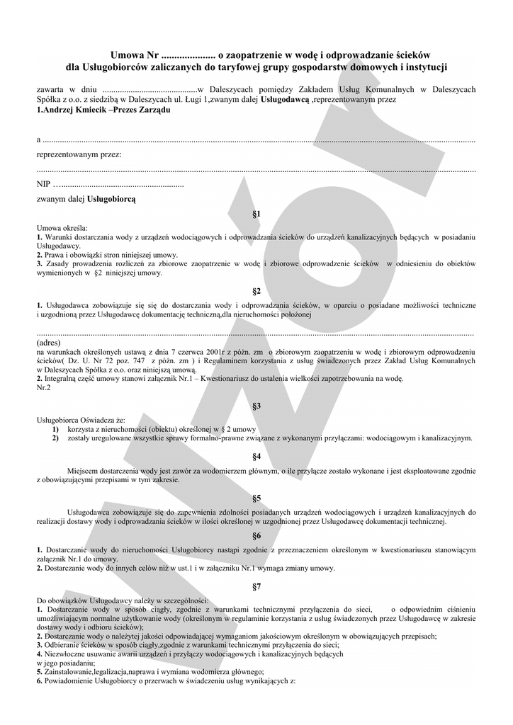 Umowa Nr ..................... o zaopatrzenie w wodę i odprowadzanie ścieków dla Usługobiorców zaliczanych do taryfowej grupy gospodarstw domowych i instytucji zawarta w dniu ............................................w Daleszycach pomiędzy Zakładem Usług Komunalnych w Daleszycach Spółka z o.o. z siedzibą w Daleszycach ul. Ługi 1,zwanym dalej Usługodawcą ,reprezentowanym przez 1.Andrzej Kmiecik –Prezes Zarządu a ......................................................................................................................................................................................................... reprezentowanym przez: ............................................................................................................................................................................................................ NIP …......................................................... zwanym dalej Usługobiorcą §1 Umowa określa: 1. Warunki dostarczania wody z urządzeń wodociągowych i odprowadzania ścieków do urządzeń kanalizacyjnych będących w posiadaniu Usługodawcy. 2. Prawa i obowiązki stron niniejszej umowy. 3. Zasady prowadzenia rozliczeń za zbiorowe zaopatrzenie w wodę i zbiorowe odprowadzenie ścieków w odniesieniu do obiektów wymienionych w §2 niniejszej umowy. §2 1. Usługodawca zobowiązuje się się do dostarczania wody i odprowadzania ścieków, w oparciu o posiadane możliwości techniczne i uzgodnioną przez Usługodawcę dokumentację techniczną,dla nieruchomości położonej ........................................................................................................................................................................................................... (adres) na warunkach określonych ustawą z dnia 7 czerwca 2001r z póżn. zm o zbiorowym zaopatrzeniu w wodę i zbiorowym odprowadzeniu ścieków( Dz. U. Nr 72 poz. 747 z póżn. zm ) i Regulaminem korzystania z usług świadczonych przez Zakład Usług Komunalnych w Daleszycach Spółka z o.o. oraz niniejszą umową. 2. Integralną część umowy stanowi załącznik Nr.1 – Kwestionariusz do ustalenia wielkości zapotrzebowania na wodę. Nr.2 §3 Usługobiorca Oświadcza że: 1) korzysta z nieruchomości (obiektu) określonej w § 2 umowy 2) zostały uregulowane wszystkie sprawy formalno-prawne związane z wykonanymi przyłączami: wodociągowym i kanalizacyjnym. §4 Miejscem dostarczenia wody jest zawór za wodomierzem głównym, o ile przyłącze zostało wykonane i jest eksploatowane zgodnie z obowiązującymi przepisami w tym zakresie. §5 Usługodawca zobowiązuje się do zapewnienia zdolności posiadanych urządzeń wodociągowych i urządzeń kanalizacyjnych do realizacji dostawy wody i odprowadzania ścieków w ilości określonej w uzgodnionej przez Usługodawcę dokumentacji technicznej. §6 1. Dostarczanie wody do nieruchomości Usługobiorcy nastąpi zgodnie z przeznaczeniem określonym w kwestionariuszu stanowiącym załącznik Nr.1 do umowy. 2. Dostarczanie wody do innych celów niż w ust.1 i w załączniku Nr.1 wymaga zmiany umowy. §7 Do obowiązków Usługodawcy należy w szczególności: 1. Dostarczanie wody w sposób ciągły, zgodnie z warunkami technicznymi przyłączenia do sieci, o odpowiednim ciśnieniu umożliwiającym normalne użytkowanie wody (określonym w regulaminie korzystania z usług świadczonych przez Usługodawcę w zakresie dostawy wody i odbioru ścieków); 2. Dostarczanie wody o należytej jakości odpowiadającej wymaganiom jakościowym określonym w obowiązujących przepisach; 3. Odbieranie ścieków w sposób ciągły,zgodnie z warunkami technicznymi przyłączenia do sieci; 4. Niezwłoczne usuwanie awarii urządzeń i przyłączy wodociągowych i kanalizacyjnych będących w jego posiadaniu; 5. Zainstalowanie,legalizacja,naprawa i wymiana wodomierza głównego; 6. Powiadomienie Usługobiorcy o przerwach w świadczeniu usług wynikających z: - wystąpienia przyczyn wymienionych w § 8 ust. 1 niezwłocznie i w sposób zwyczajowo przyjęty - planowanych prac konserwacyjno-remontowych na dwa dni przed terminem ich wykonania. §8 1. Usługodawca nie ponosi odpowiedzialności odszkodowawczej za przerwy w świadczeniu usług spowodowane: 1. działaniem siły wyższej lub z przyczyn niezależnych od Usługodawcy; 2. zamarznięciem urządzeń, przyłączy i instalacji wodociągowych i kanalizacyjnych wykonanych niezgodnie z obowiązującymi przepisami; 3. planowanymi przerwami (po uprzednim powiadomieniu Usługobiorcy w sposób zwyczajowo przyjęty) związanymi z wykonywaniem prac konserwacyjno - remontowych urządzeń wodociągowych i kanalizacyjnych. 2. Usługodawca nie ponosi również odpowiedzialności odszkodowawczej za szkody powstałe na skutek zalania wodą lub ściekami, a spowodowane: 1) wadliwym wykonaniem lub źle funkcjonującą instalacją wodociagowo – kanalizacyjną Usługobiorcy, 2) awarią instalacji i przyłączy Usługobiorcy, 3) brakiem przewidzianych przepisami prawa budowlanego urządzeń przeciwzalewowych na przyłączu lub wewnętrznej instalacji kanalizacyjnej Usługobiorcy. W przypadku cofnięcia się ścieków ( przy braku urządzenia zabezpieczającego) za jego skutki odpowiada Usługobiorca. 4) niewykonaniem lub nienależytym wykonaniem obowiązków wynikających z § 9 niniejszej umowy. 3. W przypadku wykonania przyłącza wodociągowego przez Usługobiorce niezgodnie z przepisami prawa, w tym niezgodnie z warunkiem technicznymi Usługodawcy, Usługodawca nie ponosi odpowiedzialności za jakość i ciśnienie dostarczonej wody. §9 1. Do obowiązków Usługobiorcy należy: 1) utrzymywanie właściwego stanu technicznego należących do niego instalacji, przyłączy i urządzeń wodociągowych i kanalizacyjnych, 2) wydzielenie, zgodnie z projektem pomieszczenia lub wykonanie studni wodomierzowej, przeznaczonej do zainstalowania wodomierza głównego z zaworem oraz utrzymywanie t