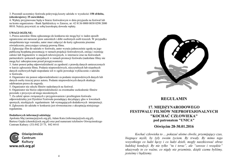 3. Pozostali uczestnicy festiwalu pokrywają koszty udziału w wysokości 150 zł/doba, (obcokrajowcy 35 euro/doba). 4. Wpłaty przyjmowane będą w biurze festiwalowym w dniu przyjazdu na festiwal lub na konto organizatora - Bank Spółdzielczy w Zatorze, nr: 42 8136 0000 0030 0298 2000 0010. Należy przywieźć ze sobą kserokopię dowodu wpłaty. UWAGI OGÓLNE: 1. Prawa autorskie filmu zgłaszanego do konkursu nie mogą być w żaden sposób ograniczone ani naruszać praw autorskich i dóbr osobistych osób trzecich. W przypadku niespełnienia tego warunku, autor musi załączyć do karty zgłoszenia pisemne oświadczenie, precyzujące sytuację prawną filmu. 2. Zgłaszając film do udziału w festiwalu, autor wyraża jednocześnie zgodę na jego publiczną bezpłatną prezentację w ramach projekcji festiwalowych, emisję i reemisję całości lub fragmentów w stacjach telewizyjnych, w internecie oraz na festiwalach partnerskich i pokazach specjalnych w ramach promocji festiwalu (nadesłane filmy nie mogą być zabezpieczone przed przegrywaniem). 3. Autor ponosi pełną odpowiedzialność za zgodność z prawdą danych umieszczonych w karcie zgłoszenia filmu. Podanie nieprawdziwych, nieczytelnych lub niepełnych danych osobowych bądź niepodanie ich w ogóle powoduje wykluczenie z udziału w festiwalu. 4. Organizator nie ponosi odpowiedzialności za podanie nieprawdziwych danych lub danych osoby trzeciej przez autora. Podanie nieprawdziwych danych skutkuje odebraniem prawa do nagrody. 5. Organizator nie odsyła filmów nadesłanych na festiwal. 6. Organizator nie bierze odpowiedzialności za ewentualne uszkodzenie filmów powstałe z przyczyn od niego niezależnych. 7. Za całość spraw związanych z przygotowaniem i przebiegiem festiwalu odpowiedzialny jest Dyrektor Festiwalu posiadający decydujący głos w kwestiach spornych, nieobjętych regulaminem lub wymagających dodatkowych interpretacji. 8. Zgłoszenie do udziału w konkursie jest równoznaczne z akceptacją niniejszego regulaminu. Dodatkowych informacji udzielają: Apolonia Maj ([email protected]), Adam Kuta ([email protected]), Bartosz Gajda ([email protected]) oraz pod numerami telefonów Oświęcimskiego Centrum Kultury: (33) 842 25 75, 842 44 61 REGULAMIN 17. MIĘDZYNARODOWEGO FESTIWALU FILMÓW NIEPROFESJONALNYCH "KOCHAĆ CZŁOWIEKA" pod patronatem "UNICA" Oświęcim 28-30.01.2016 Kochać człowieka to ... pokazać ulotne chwile, przemijający czas, biegnące myśli, by żyły swoim życiem. By trwały. By mimo tego wszystkiego co ludzi łączy i co ludzi dzieli, mogły naszkicować obraz ludzkiej kondycji. By nie tylko “tu i teraz”, ale “zawsze i wszędzie” ukazywały to co ważne, co nigdy nie przeminie, dzięki czemu byliśmy, jesteśmy i będziemy. www.ock.org.pl 4 ORGANIZATOR: Oświęcimskie Centrum Kultury w Oświęcimiu WSPÓŁORGANIZATOR: Federacja Niezależnych Twórców Filmowych w Polsce CELE FESTIWALU: 1. Kształtowanie postaw miłości i szacunku wobec człowieka poprzez ukazanie w filmowym zapisie tematyki związanej ze wszystkimi aspektami jego życia. 2. Prezentacja dążeń i osiągnięć twórczych w tematyce określonej hasłem programowym festiwalu. TERMIN I MIEJSCE: 28-30.01.2016 Oświęcimskie Centrum Kultury w Oświęcimiu, ul. Śniadeckiego 24 tel./fax: (33) 842 25 75, 842 44 61 www.ock.org.pl / e-mail: [email protected] WARUNKI UCZESTNICTWA: 1. Organizator oczekuje na filmy w sposób jednoznaczny dotyczące człowieka. 2. Do festiwalu nie będą dopuszczone filmy: - zrealizowane: przez zawodowych twórców, studentów szkół filmowych, telewizyjnych i artystycznych powyżej II roku nauki, członków komisji kwalifikacyjnej i jury oraz w celach komercyjnych, - zakwalifikowane do projekcji konkursowych w poprzednich edycjach festiwalu, - niespełniające wymogów technicznych określonych niniejszym regulaminem, - nadesłane po ustalonym terminie. 3.Każdy nadesłany film podlegać będzie ocenie komisji kwalifikacyjnej, która po obejrzeniu wszystkich filmów w dniach 16-17 grudnia 2015 roku, dokona kwalifikacji filmów do projekcji konkursowych. Komisja nie jest zobowiązana do wyjaśniania swoich postanowień. 4. Lista filmów zakwalifikowanych do projekcji festiwalowych będzie dostępna na stronie internetowej OCK www.ock.org.pl od 19 grudnia 2015 roku. 5. Filmy zakwalifikowane do projekcji konkursowych oceniane będą przez jury powołane przez organizatora. 6. Decyzje komisji kwalifikacyjnej i jury festiwalu są ostateczne i niepodważalne. 7. Czas projekcji filmu nie może przekroczyć 20 minut. Decyzją komisji kwalifikacyjnej do festiwalu mogą zostać dopuszczone filmy dłuższe, o wybitnych walorach poznawczych i artystycznych. 8. Warunkiem dopuszczenia do konkursu filmów zagranicznych jest przesłanie ich streszczenia w języku angielskim lub niemieckim. Ponadto filmy obcojęzyczne powinny posiadać napisy w języku angielskim. 9. Filmy, wraz z czytelnie wypełnioną i podpisaną kartą zgłoszenia, należy nadsyłać w nieprzekraczalnym terminie do 14 grudnia 2015 roku (data dostarczenia filmu do siedziby organizatora) na adres: Oświęcimskie Centrum Kultury, 32-600 Oświęcim, ul. Śniadeckiego 24, z dopiskiem: „festiwal filmowy”. Nośniki bez kart zgłoszenia filmu nie będą przyjmowane do konkursu. 2 10. Do każdego zgłoszonego filmu autorzy zobowiązani są, w terminie określonym w pkt. 9, do przesłania na e-mail: [email protected], kadru z filmu (zdjęcie w wersji cyfrowej, format jpg, 300dpi, opisane tytułem filmu i nazwiskiem autora). WARUNKI TECHNICZNE: 1. Filmy muszą być nagrane w formacie DVD. 2. Każdy film musi znajdować się na odrębnej płycie DVD (warunek bezwzględny). 3. Każdy film powinien zawierać czołówkę, a przede wszystkim: tytuł, imię i nazwisko autora (autorów), rok produkcji oraz napis koniec. 4. Nie będą przyjmowane filmy DVD z interaktywnym menu. NAGRODY: 1. Organizator 17. Międzynarodowego Festiwalu Filmów Nieprofe