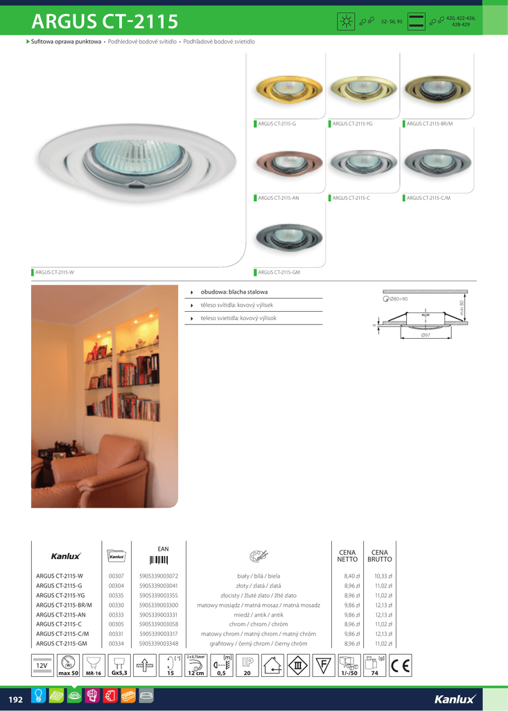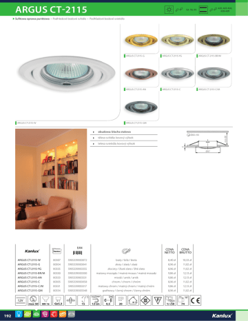 ARGUS CT-2115 420, 422-426, 428-429 52- 56, 95 Sufitowa oprawa punktowa • Podhledové bodové svítidlo • Podhľadové bodové svietidlo ARGUS CT-2115-G ARGUS CT-2115-YG ARGUS CT-2115-BR/M ARGUS CT-2115-AN ARGUS CT-2115-C ARGUS CT-2115-C/M ARGUS CT-2115-GM ARGUS CT-2115-W obudowa: blacha stalowa min 80 Ø80÷90 těleso svítidla: kovový výlisek teleso svietidla: kovový výlisok 4 Ø97 CENA NETTO CENA BRUTTO ARGUS CT-2115-W 00307 5905339003072 biały / bílá / biela 8,40 zł ARGUS CT-2115-G 00304 5905339003041 złoty / zlatá / zlatá 8,96 zł 11,02 zł ARGUS CT-2115-YG 00335 5905339003355 złocisty / žluté zlato / žlté zlato 8,96 zł 11,02 zł ARGUS CT-2115-BR/M 00330 5905339003300 matowy mosiądz / matná mosaz / matná mosadz 9,86 zł 12,13 zł ARGUS CT-2115-AN 00333 5905339003331 miedź / antik / antik 9,86 zł 12,13 zł ARGUS CT-2115-C 00305 5905339003058 chrom / chrom / chróm 8,96 zł 11,02 zł 10,33 zł ARGUS CT-2115-C/M 00331 5905339003317 matowy chrom / matný chrom / matný chróm 9,86 zł 12,13 zł ARGUS CT-2115-GM 00334 5905339003348 grafitowy / černý chrom / čierny chróm 8,96 zł 11,02 zł 2 x 0,75mm2 max 50 192 15 12 cm 0,5 20 1/-/50 74
