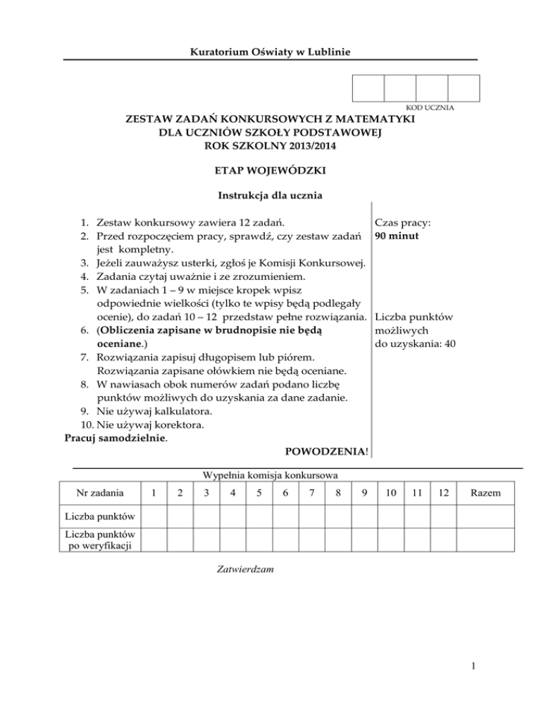 Kuratorium Oświaty w Lublinie KOD UCZNIA ZESTAW ZADAŃ KONKURSOWYCH Z MATEMATYKI DLA UCZNIÓW SZKOŁY PODSTAWOWEJ ROK SZKOLNY 2013/2014 ETAP WOJEWÓDZKI Instrukcja dla ucznia 1. Zestaw konkursowy zawiera 12 zadań. 2. Przed rozpoczęciem pracy, sprawdź, czy zestaw zadań jest kompletny. 3. Jeżeli zauważysz usterki, zgłoś je Komisji Konkursowej. 4. Zadania czytaj uważnie i ze zrozumieniem. 5. W zadaniach 1 – 9 w miejsce kropek wpisz odpowiednie wielkości (tylko te wpisy będą podlegały ocenie), do zadań 10 – 12 przedstaw pełne rozwiązania. 6. (Obliczenia zapisane w brudnopisie nie będą oceniane.) 7. Rozwiązania zapisuj długopisem lub piórem. Rozwiązania zapisane ołówkiem nie będą oceniane. 8. W nawiasach obok numerów zadań podano liczbę punktów możliwych do uzyskania za dane zadanie. 9. Nie używaj kalkulatora. 10. Nie używaj korektora. Pracuj samodzielnie. POWODZENIA! Czas pracy: 90 minut Liczba punktów możliwych do uzyskania: 40 Wypełnia komisja konkursowa Nr zadania 1 2 3 4 5 6 7 8 9 10 11 12 Razem Liczba punktów Liczba punktów po weryfikacji Zatwierdzam 1 Zadanie 1 (1 pkt) Zosia napisała pewną liczbę. Marysia napisała liczbę pięć razy większą niż Zosia. Obie dziewczynki podzieliły swoje liczby przez 9. Zosia otrzymała resztę 7, Marysia otrzymała resztę . ……. . Zadanie 2 (2 pkt.) Ania zaznaczyła na osi liczbowej punkty A, B, C, D, E odpowiadające odpowiednio liczbom: 5 3 -3, -1 , 0, 1 ,3. Najmniejszą długość ma odcinek ………, wynosi ona ………… . 8 7 Zadanie 3 (3 pkt. ) W piątek klasa VIa pisała sprawdzian z matematyki. Janek był chory, więc nie przystąpił do sprawdzianu. Najniższą oceną z tego sprawdzianu była trójka. Żaden uczeń nie otrzymał szóstki. Połowa piszących otrzymała oceny dobre, co trzeci uczeń otrzymał piątkę, a tylko czterech uczniów otrzymało ocenę dostateczną. Ta klasa liczy ………. uczniów. Ocenę bardzo dobrą z tego sprawdzianu otrzymało ………. uczniów. Oceny dostateczne stanowiły ………….% ocen dobrych. Zadanie 4 (4 pkt.) Hania zbiera znaczki. 25% kolekcji stanowią znaczki polskie. Wśród znaczków zagranicznych Hania ma znaczki państw europejskich oraz 15 znaczków amerykańskich. Znaczki europejskie stanowią 80% znaczków zagranicznych. Hania ma ………..znaczków polskich. Znaczków europejskich ma ………razy więcej niż polskich. Znaczków zagranicznych ma o ……..więcej niż polskich. Kolekcja Hani liczy ……..znaczków. Zadanie 5 (4pkt.) Basia się urodziła w styczniu 2014r. Jej mama miała wtedy 27 lat. a) Mama będzie 4 razy starsza od Basi za ………….lat. Wówczas razem będą miały …….lat. b) Wiek Basi będzie stanowił 0,4 wieku mamy, gdy Basia będzie obchodziła swoje ……………..urodziny. Wówczas wspólne dzielniki liczb oznaczających wiek każdej z nich napisane w kolejności rosnącej (bez przecinków) utworzą liczbę ………. . Zadanie 6 (2 pkt.) Zapisz w postaci wyrażenia różnicę podwojonego sześcianu liczby x i kwadratu podwojonej liczby x. …………………………………….. Zadanie 7 (4 pkt.) Oceń prawdziwość poniższych zdań, wpisując w wykropkowane miejsce P, jeśli zdanie jest prawdziwe lub F, gdy zdanie jest nieprawdziwe. a) Każda cięciwa okręgu o promieniu długości 5 cm ma długość mniejszą od 10 cm. ………… b) Istnieje trójkąt, który nie ma osi symetrii. ..………. c) Objętość graniastosłupa o podstawie trójkąta i wysokości H jest równa objętości ostrosłupa o podstawie takiego samego trójkąta i wysokości H. ….……… d) Każdy trójkąt, w którym jeden z kątów ma miarę równą średniej arytmetycznej miar wszystkich trzech kątów jest trójkątem równobocznym. ……… 2 Zadanie 8 (4 pkt.) Każdy bok prostokątnego placu o obwodzie 190 m obsadzono drzewkami w taki sposób, że w każdym wierzchołku rośnie jedno drzewko. Wzdłuż krótszego boku posadzono 15 drzewek, wzdłuż dłuższego 21. Przyjmujemy, że drzewka rosnące w wierzchołkach nie należą do żadnego boku prostokąta. Odległości między drzewkami są równe. Jedno drzewko rośnie od drugiego w odległości ……….m. Krótszy bok prostokąta ma długość ………m. Ten plac ma powierzchnię równą …………m2, czyli ……….ha. Zadanie 9 (3 pkt.) Jaś nasypał 18000 cm3 piasku do prostopadłościennego pudełka o podstawie kwadratu o boku długości 0,6 m. Piasek wypełnił pudełko do 0,4 wysokości. Wysokość tego pudełka wynosi ……….dm. Na oklejenie ścian bocznych tego pudełka potrzeba …….. dm2 papieru. Jaś ma zeszyt papierów kolorowych zawierający 10 kartek o wymiarach 19 cm i 11 cm każda. Do oklejenia ścian bocznych tego pudełka zabraknie mu ……….całych kartek papieru kolorowego. Zadanie 10 (4 pkt.) W sześcianie ABCDEFGH środek podstawy EFGH oznaczono literą K i połączono z wierzchołkami A i B. Wykonaj rysunek i oblicz pole trójkąta ABK wiedząc, że krawędź sześcianu ma długość 6 cm. 3 Zadanie 11 (4 pkt.) Prostokąt i kwadrat mają równe obwody. W prostokącie jeden bok jest 2 razy dłuższy od drugiego. Oblicz, jaką częścią pola kwadratu jest pole prostokąta. Wynik zapisz w najprostszej postaci. Uwaga! Zadanie rozwiąż nie podając przykładowych wartości liczbowych długości boków prostokąta i kwadratu. Odpowiedź Zadanie 12 (5 pkt.) Na uszycie pewnej spódnicy zużyto 0,8 m materiału. Dodatki, czyli zamek, nici i guzik, stanowiły 15% wartości materiału, z którego uszyto spódnicę. Koszty wykonania, podatek oraz marża sklepu prowadzącego sprzedaż powiększyły wartość tej spódnicy o 48 zł. Pani Kowalska kupiła w kwietniu taką spódnicę za 94 zł. Oblicz, ile trzeba będzie zapłacić za taką spódnicę w tym sklepie w czerwcu wiedząc, że cena materiału wzrosła o 20%, a inne koszty (dodatki, podatek, marża) nie uległy zmianie. Odpowiedź 4