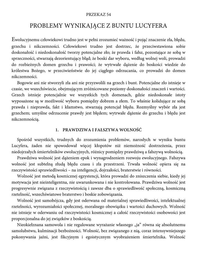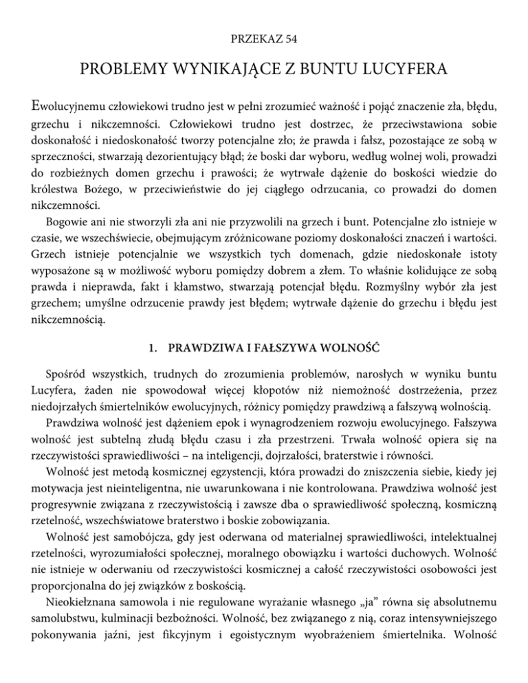 PRZEKAZ 54 PROBLEMY WYNIKAJĄCE Z BUNTU LUCYFERA Ewolucyjnemu człowiekowi trudno jest w pełni zrozumieć ważność i pojąć znaczenie zła, błędu, grzechu i nikczemności. Człowiekowi trudno jest dostrzec, że przeciwstawiona sobie doskonałość i niedoskonałość tworzy potencjalne zło; że prawda i fałsz, pozostające ze sobą w sprzeczności, stwarzają dezorientujący błąd; że boski dar wyboru, według wolnej woli, prowadzi do rozbieżnych domen grzechu i prawości; że wytrwałe dążenie do boskości wiedzie do królestwa Bożego, w przeciwieństwie do jej ciągłego odrzucania, co prowadzi do domen nikczemności. Bogowie ani nie stworzyli zła ani nie przyzwolili na grzech i bunt. Potencjalne zło istnieje w czasie, we wszechświecie, obejmującym zróżnicowane poziomy doskonałości znaczeń i wartości. Grzech istnieje potencjalnie we wszystkich tych domenach, gdzie niedoskonałe istoty wyposażone są w możliwość wyboru pomiędzy dobrem a złem. To właśnie kolidujące ze sobą prawda i nieprawda, fakt i kłamstwo, stwarzają potencjał błędu. Rozmyślny wybór zła jest grzechem; umyślne odrzucenie prawdy jest błędem; wytrwałe dążenie do grzechu i błędu jest nikczemnością. 1. PRAWDZIWA I FAŁSZYWA WOLNOŚĆ Spośród wszystkich, trudnych do zrozumienia problemów, narosłych w wyniku buntu Lucyfera, żaden nie spowodował więcej kłopotów niż niemożność dostrzeżenia, przez niedojrzałych śmiertelników ewolucyjnych, różnicy pomiędzy prawdziwą a fałszywą wolnością. Prawdziwa wolność jest dążeniem epok i wynagrodzeniem rozwoju ewolucyjnego. Fałszywa wolność jest subtelną złudą błędu czasu i zła przestrzeni. Trwała wolność opiera się na rzeczywistości sprawiedliwości – na inteligencji, dojrzałości, braterstwie i równości. Wolność jest metodą kosmicznej egzystencji, która prowadzi do zniszczenia siebie, kiedy jej motywacja jest nieinteligentna, nie uwarunkowana i nie kontrolowana. Prawdziwa wolność jest progresywnie związana z rzeczywistością i zawsze dba o sprawiedliwość społeczną, kosmiczną rzetelność, wszechświatowe braterstwo i boskie zobowiązania. Wolność jest samobójcza, gdy jest oderwana od materialnej sprawiedliwości, intelektualnej rzetelności, wyrozumiałości społecznej, moralnego obowiązku i wartości duchowych. Wolność nie istnieje w oderwaniu od rzeczywistości kosmicznej a całość rzeczywistości osobowości jest proporcjonalna do jej związków z boskością. Nieokiełznana samowola i nie regulowane wyrażanie własnego „ja” równa się absolutnemu samolubstwu, kulminacji bezbożności. Wolność, bez związanego z nią, coraz intensywniejszego pokonywania jaźni, jest fikcyjnym i egoistycznym wyobrażeniem śmiertelnika. Wolność motywowana przez własne „ja” jest iluzją pojęciową, okrutnym oszustwem. Zezwolenie, strojące się w szaty wolności, jest prekursorem skrajnego zniewolenia. Prawdziwa wolność idzie w parze z prawdziwym odczuwaniem własnej godności; fałszywa wolność jest partnerem samouwielbienia. Prawdziwa wolność jest owocem samokontroli; fałszywa wolność, założeniem samostanowienia. Samokontrola prowadzi do altruistycznej służby; samouwielbienie zmierza do eksploatacji innych dla samolubnego wyniesienia takiej błądzącej jednostki, ponieważ jest ona skłonna poświęcić prawe osiągnięcia w imię posiadania niesprawiedliwej władzy nad bratnimi jej istotami. Nawet mądrość jest boska i bezpieczna tylko wtedy, kiedy jest kosmiczna w swej skali działania i duchowa w swej motywacji. Nie ma większego błędu ponad to oszukiwanie samego siebie, które wiedzie inteligentne istoty do prób wykorzystania władzy nad innymi istotami, dla pozbawienia tych osób ich naturalnych wolności. Złota zasada ludzkiej uczciwości sprzeciwia się głośno wszelkim takim oszustwom, nieuczciwościom, samolubstwom i nieprawościom. Jedyna prawdziwa i autentyczna wolność porównywalna jest z rządami miłości i ze służbą miłosierdzia. Jak śmie samowolna istota naruszać prawa swych braci w imię wolności osobistej, kiedy Najwyżsi Władcy wszechświata tego nie robią, zachowując miłosierny szacunek dla prerogatyw woli i potencjałów osobowości! Żadna istota, wykorzystując swą domniemaną wolność osobistą, nie ma prawa pozbawiać jakiejkolwiek innej istoty przywilejów bytu, nadanych jej przez Stwórców i należycie szanowanych przez wszystkich ich lojalnych towarzyszy, podwładnych i im podległych. Ewolucyjny człowiek czasem musi walczyć o swą materialną wolność z tyranami i ciemiężcami, na świecie grzechu i nikczemności, czy we wczesnym okresie prymitywnej, rozwijającej się sfery, ale nie na światach morontialnych czy na sferach duchowych. Wojna odziedziczona jest w spadku po wczesnym człowieku ewolucyjnym, ale na światach o normalnej, zaawansowanej cywilizacji, walka fizyczna, jako metoda regulacji nieporozumień narodowych dawno już została zdyskredytowana. 2. KRADZIEŻ WOLNOŚCI Bóg zaplanował wieczną Havonę, razem z Synem i w Duchu i od tego czasu istnieje wieczny wzorzec partnerstwa w stwarzaniu – dzielenie się stwarzaniem. Taki wzorzec – dzielenie się – jest głównym celem wszystkich Synów i Córek Boga, którzy wychodzą w przestrzeń i próbują powielić w czasie centralny wszechświat wiecznej perfekcji. Przeznaczeniem każdej istoty, z każdego rozwijającego się wszechświata, dążącej do czynienia woli Ojca, jest zostać czasowo-przestrzennym partnerem Stwórców we wspaniałej przygodzie osiągania empirycznej doskonałości. Gdyby to nie było prawdą, Ojciec raczej nie wyposażyłby takich istot w stwórczą, wolną wolę, ani nie zamieszkałby ich, faktycznie wchodząc z nimi w partnerstwo dzięki swemu własnemu duchowi. Szaleństwo Lucyfera polegało na próbie zrobienia tego, co niewykonalne, na dokonaniu krótkiego spięcia czasu w empirycznym wszechświecie. Zb