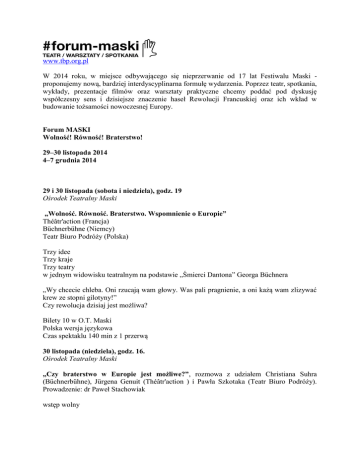 www.tbp.org.pl W 2014 roku, w miejsce odbywającego się nieprzerwanie od 17 lat Festiwalu Maski proponujemy nową, bardziej interdyscyplinarna formułę wydarzenia. Poprzez teatr, spotkania, wykłady, prezentacje filmów oraz warsztaty praktyczne chcemy poddać pod dyskusję współczesny sens i dzisiejsze znaczenie haseł Rewolucji Francuskiej oraz ich wkład w budowanie tożsamości nowoczesnej Europy. Forum MASKI Wolność! Równość! Braterstwo! 29–30 listopada 2014 4–7 grudnia 2014 29 i 30 listopada (sobota i niedziela), godz. 19 Ośrodek Teatralny Maski „Wolność. Równość. Braterstwo. Wspomnienie o Europie” Théâtr'action (Francja) Büchnerbühne (Niemcy) Teatr Biuro Podróży (Polska) Trzy idee Trzy kraje Trzy teatry w jednym widowisku teatralnym na podstawie „Śmierci Dantona” Georga Büchnera „Wy chcecie chleba. Oni rzucają wam głowy. Was pali pragnienie, a oni każą wam zlizywać krew ze stopni gilotyny!” Czy rewolucja dzisiaj jest możliwa? Bilety 10 w O.T. Maski Polska wersja językowa Czas spektaklu 140 min z 1 przerwą 30 listopada (niedziela), godz. 16. Ośrodek Teatralny Maski „Czy braterstwo w Europie jest możliwe?”, rozmowa z udziałem Christiana Suhra (Büchnerbühne), Jürgena Genuit (Théâtr'action ) i Pawła Szkotaka (Teatr Biuro Podróży). Prowadzenie: dr Paweł Stachowiak wstęp wolny 4 grudnia (czwartek), godz. 18 OT Maski „Próżność. Queer. Szaleństwo” Otwarte podsumowanie zajęć „Etiudy teatralne” (studenci II roku wiedzy o teatrze UAM), opieka: Krzysztof Cicheński 5 grudnia (piątek), godz. 10–13 OT Maski „Ja. Ty. Inni” Warsztat technik aktorskich prowadzony przez Teatr Biuro Podróży Obowiązują zapisy 5 grudnia (piątek), godz. 16 OT Maski „Między niebem a ziemią” Spotkanie poświęcone działalności Teatru Biuro Podróży 5 grudnia (piątek), godz. 20 Sala Teatralna, Collegium Maius „TAZM Milczenie światła” Przedstawienie Pracowni ROSA, poświęcone osadzonym w ciemności więźniom Tazmamartu 6 grudnia (sobota), godz. 9–12 Sala Teatralna, Collegium Maius Acting Techniques Intensive Seminar ATIS ISKRA Intensywne seminarium technik aktorskich, prowadzenie: prof. Grzegorz Ziółkowski, współpraca: Maciej Zakrzewski, Maria Bohdziewicz Obowiązują zapisy 6 grudnia (sobota), godz. 14:30 Sala Teatralna, Collegium Maius „Wrażliwość teatru” Inauguracja programu Pracowni ROSA, poświęconego wybitnym twórczyniom i twórcom teatru współczesnego Pokaz filmu dokumentalnego Ariane Mnouchkine. L’aventure du Théâtre du Soleil Wprowadzenie: Adam Domalewski 6 grudnia (sobota), godz. 17–20 OT Maski „Ja. Ty. Inni” Warsztat Teatru Biuro Podróży (kontynuacja) Obowiązują zapisy 6 grudnia (sobota), godz. 21 Sala Teatralna, Collegium Maius „TAZM Milczenie światła” Przedstawienie Pracowni ROSA 7 grudnia (niedziela), godz. 9–12 Sala Teatralna, Collegium Maius ATIS ISKRA Intensywne seminarium technik aktorskich (kontynuacja) Obowiązują zapisy 7 grudnia (niedziela), godz. 15 Sala Teatralna, Collegium Maius „Inne” Inauguracja programu Pracowni ROSA, poświęconego wybitnym kobietom pracującym na polu sztuki, kultury i życia społecznego Pokaz filmu The 10 Conditions of Love poświęconego Rebiji Kadir Wprowadzenie: prof. Grzegorz Ziółkowski, współpraca: Adam Domalewski 7 grudnia (niedziela), godz. 17 OT Maski „Granda w bramie”: otwarty pokaz warsztatu teatralnego z udziałem Teatru Brama z Goleniowa i Teatru Granda UAM. Prowadzenie: Daniel Jacewicz. Opieka: dr Magdalena Grenda ORGANIZATORZY • Katedra Dramatu, Teatru i Widowisk UAM • Ośrodek Teatralny „Maski” UAM • Pracownia ROSA • Teatr Biuro Podróży MIEJSCA • Ośrodek Teatralny „Maski”: Al. Niepodległości 26, Poznań, tel. 61 829 39 07 • Sala Teatralna im. Wojciecha Bogusławskiego: Collegium Maius UAM, wejście z holu biblioteki, ul. H. Kowalczyka BILETY • „Wolność. Równość. Braterstwo. Wspomnienie o Europie” bilety 10 zł Rezerwacje: [email protected] •„TAZM Milczenie światła”: wstęp wolny, rezerwacje wejściówek: [email protected] • Pokazy studenckie: wstęp wolny ZAPISY NA WARSZTATY Koszt dwudniowych warsztatów Teatru Biuro Podróży lub ATIS ISKRA: 60 zł, studenci UAM – 40 zł Rezerwacje warsztatów TBP: [email protected] Rezerwacje ATIS ISKRA: [email protected] KONTAKT Teatr Biuro Podróży: [email protected] Pracownia ROSA: [email protected] ADRESY STRON INTERNETOWYCH • Teatr Biuro Podróży: www.tbp.org.pl • Büchnerbühne: www.buechnerbuehne.de • Théâtr'action: www.theatraction-bordeaux.fr • Katedra Dramatu, Teatru i Widowisk UAM www.teatrologia.amu.edu.pl • Instytut Kulturoznawstwa UAM www.kulturoznawstwo.amu.edu.pl • Acting Techniques Intensive Seminar ATIS AMU: www.grzeg-atis.home.amu.edu.pl • Pracownia ROSA: www.grzeg-rosa.home.amu.edu.pl