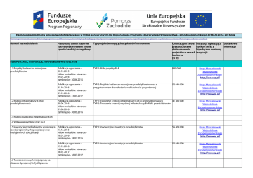 Harmonogram naborów wniosków o dofinansowanie w trybie konkursowym dla Regionalnego Programu Operacyjnego Województwa Zachodniopomorskiego 2014-2020 na 2016 rok *Harmonogram może ulec zmianie. Dokumenty programowe opublikowane są na stronie Instytucji Zarządzającej (http://rpo.terminal.pl/jak-skorzystac-z-programu-regionalnego/zobacz-ogloszenia-i-wyniki-naborow-wnioskow/harmonogram-naborow-wnioskow). Numer i nazwa Działania Typ projektów mogących uzyskać dofinansowanie Planowany termin naborów (określony kwartałami albo w sposób bardziej szczegółowy Orientacyjna kwota przeznaczona na dofinansowanie projektów w ramach konkursu (w zł) Instytucja ogłaszająca Dodatkowe konkurs (wraz z informacje hiperłączem do strony instytucji) I GOSPODARKA, INNOWACJE, NOWOCZESNE TECHNOLOGIE 1.1 Projekty badawczo- rozwojowe przedsiębiorstw 1.2 Rozwój infrastruktury B+R w przedsiębiorstwach Publikacja ogłoszenia 30.12.2015 Nabór wniosków: otwarcie 29.01.2016 zamknięcie - 30.06.2016 TYP 1: Małe projekty B+R 940 000 Urząd Marszałkowski Województwa Zachodniopomorskiego http://rpo.wzp.pl/ Publikacja ogłoszenia 31.10.2016 Nabór wniosków: otwarcie 01.12.2016 zamknięcie - 31.01.2017 TYP 2: Projekty badawczo-rozwojowe przedsiębiorstw wraz z przygotowaniem do wdrożenia w działalności gospodarczej 52 640 000 Urząd Marszałkowski Województwa Zachodniopomorskiego http://rpo.wzp.pl/ Publikacja ogłoszenia 30.06.2016 Nabór wniosków: otwarcie 01.08.2016 zamknięcie - 30.09.2016 TYP 1: Tworzenie i rozwój infrastruktury B+R w przedsiębiorstwach 41 360 000 TYP 2: Tworzenie i rozwój wspólnej infrastruktury B+R dla przedsiębiorstw Urząd Marszałkowski Województwa Zachodniopomorskiego http://rpo.wzp.pl/ Publikacja ogłoszenia 17.12.2015 Nabór wniosków: otwarcie 18.01.2016 zamknięcie - 18.03.2016 TYP 1: Innowacyjne inwestycje przedsiębiorstw 56 400 000 Urząd Marszałkowski Województwa Zachodniopomorskiego http://rpo.wzp.pl/ Publikacja ogłoszenia 15.12.2016 Nabór wniosków: otwarcie 16.01.2017 zamknięcie - 16.03.2017 TYP 1: Innowacyjne inwestycje przedsiębiorstw 52 640 000 Urząd Marszałkowski Województwa Zachodniopomorskiego http://rpo.wzp.pl/ 1.3 Rozwój publicznej infrastruktury B+R 1.4 Wdrażanie wyników prac B+R 1.5 Inwestycje przedsiębiorstw wspierające rozwój regionalnych specjalizacji oraz inteligentnych specjalizacji 1.6 Tworzenie nowych miejsc pracy na obszarze Specjalnej Stefy Włączenia Numer i nazwa Działania Planowany termin naborów Typ projektów mogących uzyskać dofinansowanie (określony kwartałami albo w sposób bardziej szczegółowy Orientacyjna kwota przeznaczona na dofinansowanie projektów w ramach konkursu (w zł) Instytucja ogłaszająca Dodatkowe konkurs (wraz z informacje hiperłączem do strony instytucji) 1.7 Inwestycje przedsiębiorstw w ramach strategii ZIT dla Szczecińskiego Obszaru Metropolitarnego 1.8 Inwestycje przedsiębiorstw w ramach ZIT dla Koszalińsko- KołobrzeskoBiałogardzkiego Obszaru Funkcjonalnego 1.9 Inwestycje w przedsiębiorstwach poprzez Tryb właściwy dla instrumentów finansowych instrumenty finansowe 1.10 Tworzenie i rozbudowa infrastruktury na Publikacja ogłoszenia rzecz rozwoju gospodarczego 29.01.2016 Nabór wniosków: otwarcie 01.03.2016 zamknięcie - 29.04.2016 TYP 1: Działania zwiększające atrakcyjność i dostępność stref inwestycyjnyc 109 660 400 Urząd Marszałkowski Województwa Zachodniopomorskiego http://rpo.wzp.pl/ TYP 1: Kompleksowe wsparcie indywidualnych przedsiębiorstw w zakresie 3 760 000 ekspansji na rynki zagraniczne TYP 2: Kompleksowe wsparcie dla grup przedsiębiorstw w zakresie międzynarodowej kooperacji TYP 3: Organizacja przedsięwzięć kooperacyjnych w kraju Urząd Marszałkowski Województwa Zachodniopomorskiego http://rpo.wzp.pl/ 1.11 Tworzenie i rozbudowa infrastruktury na Tryb pozakonkursowy rzecz rozwoju gospodarczego w ramach Strategii ZIT dla Szczecińskiego Obszaru Metropolitarnego 1.12 Tworzenie i rozbudowa infrastruktury na Tryb pozakonkursowy rzecz rozwoju gospodarczego w ramach Strategii ZIT dla Koszalińsko- KołobrzeskoBiałogardzkiego Obszaru Funkcjonalnego 1.14 Wzmocnienie pozycji regionalnej gospodarki w wymiarze krajowym i międzynarodowym Tryb pozakonkursowy 1.15 Wsparcie kooperacji przedsiębiorstw Publikacja ogłoszenia 30.06.2016 Nabór wniosków: otwarcie 01.08.2016 zamknięcie - 30.09.2016 1.16 Zwiększenie dostępu do usług Instytucji Otoczenia Biznesu 1.17 Wzmocnienie procesu wsparcia firm w początkowej fazie rozwoju TYP 1: Kompleksowe wsparcie inkubacji TYP 2: Programy akceleracyjne TYP 3: Instrumenty kapitałowe Tryb właściwy dla instrumentów finansowych Numer i nazwa Działania Planowany termin naborów Typ projektów mogących uzyskać dofinansowanie (określony kwartałami albo w sposób bardziej szczegółowy Orientacyjna kwota przeznaczona na dofinansowanie projektów w ramach konkursu (w zł) Instytucja ogłaszająca Dodatkowe konkurs (wraz z informacje hiperłączem do strony instytucji) II GOSPODARKA NISKOEMISYJNA 2.1 Zrównoważona multimodalna mobilność Publikacja ogłoszenia miejska i działania adaptacyjne łagodzące 30.06.2016 zmiany klimatu Nabór wniosków: otwarcie 01.08.2016 zamknięcie - 30.09.2016 TYP 1: Budowa, przebudowa obiektów/systemu infrastruktury zintegrowanego systemu transportu publicznego w celu ograniczenia ruchu drogowego w centrach miast TYP 2: Zakup lub modernizacja niskoemisyjnego taboru transportu miejskiego 63 356 000 Urząd Marszałkowski Województwa Zachodniopomorskiego http://rpo.wzp.pl/ 2.2 Zrównoważona multimodalna mobilność Tryb pozakonkursowy miejska i działania adaptacyjne łagodzące zmiany klimatu w ramach Strategii ZIT dla Szczecińskiego Obszaru Metropolitalnego 2.3 Zrównoważona multimodalna mobilność Tryb pozakonkursowy miejska i działania adaptacyjne łagodzące zmiany klimatu w ramach Strategii ZIT dla Koszalińsko-Kołobrzesko-Białogardzkiego Obszaru Funkcjonalnego 2