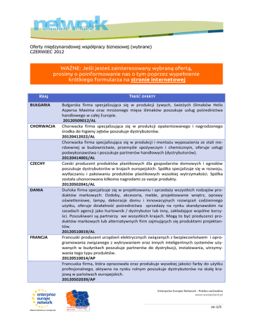 Oferty międzynarodowej współpracy biznesowej (wybrane) CZERWIEC 2012 WAŻNE: Jeśli jesteś zainteresowany wybraną ofertą, prosimy o poinformowanie nas o tym poprzez wypełnienie krótkiego formularza na stronie internetowej KRAJ BUŁGARIA CHORWACJA CZECHY DANIA FRANCJA TREŚĆ OFERTY Bułgarska firma specjalizująca się w produkcji żywych, świeżych ślimaków Helix Aspersa Maxima oraz mrożonego mięsa ślimaków poszukuje usług pośrednictwa handlowego w całej Europie. 20120509012/AL Chorwacka firma specjalizująca się w produkcji opatentowanego i nagrodzonego środka do higieny zębów poszukuje dystrybutorów. 20120412022/AL Chorwacka firma specjalizująca się w produkcji i montażu wyposażenia ze stali nierdzewnej w budownictwie, przemyśle spożywczym i chemicznym, oferuje usługi podwykonawstwa i poszukuje partnerów handlowych (dystrybutorów). 20120414001/AL Czeski producent produktów plastikowych dla gospodarstw domowych i ogrodów poszukuje dystrybutorów w krajach europejskich. Spółka specjalizuje się w rozwoju, wytłaczaniu i pakowaniu produktów plastikowych wysokiej wytrzymałości. Spółka została uhonorowana kilkoma nagrodami za swoje produkty. 20120502041/AL Duńska firma specjalizuje się w projektowaniu i sprzedaży wszystkich rodzajów produktów markowych: Ozdoby, akcesoria, meble, projektowanie wnętrz, oprawy oświetleniowe, lampy, dekoracje domu i innowacyjnych rozwiązań codziennego użytku, oferuje działalność pośrednictwa sprzedaży na rynku skandynawskim na zasadach agencji jako hurtownik / dystrybutor lub inny, zakładające wspólne korzyści. Poszukiwani są partnerzy we wszystkich krajach. Mogą to być producenci produktów markowych lub alternatywnych firm zajmujących się produktami projektantów. 20120510019/AL Francuski producent urządzeń elektrycznych związanych z bezpieczeństwem i oprogramowania związanego z wykrywaniem oraz innych inteligentnych systemów używanych w budynkach poszukuje partnerów do dystrybucji, instalowania, utrzymywania tego typu produktów. 20120510014/AP Francuska firma, która opracowała oraz produkuje wysokiej jakości farby do użytku profesjonalnego, aktywna na rynku rolnym poszukuje dystrybutorów na skalę krajową w państwach europejskich. 20120502039/AP Enterprise Europe Network - Polska zachodnia www.westpoland.pl str.1/5 HISZPANIA HOLANDIA IRLANDIA KOREA ŁOTWA NIEMCY RUMUNIA Hiszpańska firma specjalizująca się w produkcji odlewów z aluminium i znalu oferuje usługi podwykonawcze. 20120507052/AL Hiszpańska firma specjalizująca się w obróbce termicznej w kontrolowanych atmosferach, hartowaniu, wyżarzaniu itp poszukuje współpracy jako podwykonawca. 20120507051/AL Hiszpański producent win poszukuje pośredników handlowych (agentów, dystrybutorów, przedstawicieli). Firma oferuje również dystrybucję producentom wysokiej jakości win zamierzających wejść na rynek hiszpański. Możliwa jest również współpraca na zasadzie joint venture. 20120503023/AL Holenderski dostawca produktów i usług do profesjonalnego tworzenia kompilatorów poszukuje producentów oprogramowania oraz systemów mobilnych do zawiązania współpracy na zasadach joint venture lub produkcji wzajemnej. 20120412035/AP Irlandzka firma, będąca agentem handlowym na Europę opatentowanej szczoteczki do zębów, poszukuje dystrybutorów w Europie, na Bliskim Wschodzie oraz w Afryce. 20120503032/AL Koreański producent robotów do czyszczenia okien poszukuje dystrybutorów na wyłączność. 20120419001/AP Koreański producent zaworów motylkowych poszukuje dystrybutorów, agentów i oferuje swoje podwykonawstwo. Firma ma również nadzieję na zawiązanie jointventure w celu wspólnej produkcji zaworów. 20120418001/AP Koreański producent symulatorów do golfa poszukuje pośredników handlowych (lokalnych agentów i dystrybutorów). 20120424003/AL Koreański producent systemu kontroli płytek półprzewodnikowych oraz podzespołów z włókien optycznych poszukuje agentów i dystrybutorów. Firma oferuje również swoje usługi dystrybucyjne na rzecz europejskich producentów półprzewodników. Firma zainteresowana jest również dostarczaniem swoich produktów w formie OEM/ODM. 20120423005/AL Koreański producent oświetlenia LEDowego poszukuje dystrybutorów. 20120423003/AL Łotewska firma produkująca naturalny nawóz i wysokiej jakości wodę mineralną poszukuje dystrybutorów, pośredników handlowych i partnerów z sektora ogrodownictwa, hodowli organicznych i kreowania krajobrazu. 20120418018/AL Niemiecka firma specjalizująca się w produkcji mebli do zastosowań w domu, biurze i sklepach poszukuje podwykonawców, którzy mogą dostarczyć miękkie drewno z Europy Wschodniej do produkcji trumien do kremacji. 20120502014/AL Rumuńska firma specjalizująca się w produkcji zbóż oraz usługach rolniczych poszukuje współpracy w dziedzinie handlu zbożami i innymi produktami rolniczymi. 20120503003/AP Rumuńska firma specjalizująca się w produkcji i handlu produktami rybołówstwa zainteresowana jest współpracą z partnerami zagranicznymi (odbiorcami, dystrybutorami, dostawcami). Firma otwarta jest także na współpracę typu joint venture. 20120504027/AP str.2/5 SŁOWACJA SZWECJA TURCJA Rumuńska firma specjalizująca się w imporcie i dystrybucji mrożonego mięsa i ryb poszukuje producentów lub hurtowników tego rodzaju produktów z Ukrainy, Turcji, Europy Południowo-Wschodniej, Holandii, Belgii, Niemiec i Wielkiej Brytanii. Firma oferuje również pośrednictwo handlowe. 20120521034/AP Rumuńska firma specjalizująca się w produkcji drewna iglastego poszukuje pośredników handlowych oraz oferuje swoje usługi jako podwykonawca dla firm produkcyjnych, które potrzebują tarcicy. 20120507013/AL Rumuński producent metalowych wież dla telefonii komórkowej oraz masztów sieci elektrycznej wysokiego napięcia poszukuje potencjalnych partnerów do współpracy zarówno jako pośre