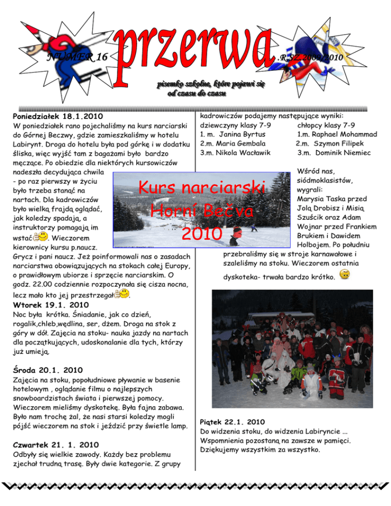 NUMER 16 .R.SZ.2009/2010 ppiisseemmkkoo sszzkkoollnnee,, kkttóórree ppoojjaaw wii ssiięę oodd cczzaassuu ddoo cczzaassuu Poniedziałek 18.1.2010 W poniedziałek rano pojechaliśmy na kurs narciarski do Górnej Beczwy, gdzie zamieszkaliśmy w hotelu Labirynt. Droga do hotelu była pod górkę i w dodatku śliska, więc wyjść tam z bagażami było bardzo męczące. Po obiedzie dla niektórych kursowiczów nadeszła decydująca chwila - po raz pierwszy w życiu było trzeba stanąć na nartach. Dla kadrowiczów było wielką frajdą oglądać, jak koledzy spadają, a instruktorzy pomagają im kadrowiczów podajemy następujące wyniki: dziewczyny klasy 7-9 chłopcy klasy 7-9 1. m. Janina Byrtus 1.m. Raphael Mohammad 2.m. Maria Gembala 2.m. Szymon Filipek 3.m. Nikola Wacławik 3.m. Dominik Niemiec Wśród nas, siódmoklasistów, wygrali: Marysia Taska przed Jolą Drobisz i Misią Szuścik oraz Adam Wojnar przed Frankiem Brukiem i Dawidem Holbojem. Po południu przebraliśmy się w stroje karnawałowe i szaleliśmy na stoku. Wieczorem ostatnia Kurs narciarski Horní Bečva 2010 wstać . Wieczorem kierownicy kursu p.naucz. Grycz i pani naucz. Jeż poinformowali nas o zasadach narciarstwa obowiązujących na stokach całej Europy, o prawidłowym ubiorze i sprzęcie narciarskim. O godz. 22.00 codziennie rozpoczynała się cisza nocna, lecz mało kto jej przestrzegał Wtorek 19.1. 2010 dyskoteka- trwała bardzo krótko. . Noc była krótka. Śniadanie, jak co dzień, rogalik,chleb,wędlina, ser, dżem. Droga na stok z góry w dół. Zajęcia na stoku- nauka jazdy na nartach dla początkujących, udoskonalanie dla tych, którzy już umieją. Środa 20.1. 2010 Zajęcia na stoku, popołudniowe pływanie w basenie hotelowym , oglądanie filmu o najlepszych snowboardzistach świata i pierwszej pomocy. Wieczorem mieliśmy dyskotekę. Była fajna zabawa. Było nam trochę żal, że nasi starsi koledzy mogli pójść wieczorem na stok i jeździć przy świetle lamp. Czwartek 21. 1. 2010 Odbyły się wielkie zawody. Każdy bez problemu zjechał trudną trasę. Były dwie kategorie. Z grupy Piątek 22.1. 2010 Do widzenia stoku, do widzenia Labiryncie ... Wspomnienia pozostaną na zawsze w pamięci. Dziękujemy wszystkim za wszystko. -1- Od A do Z……… czyli spowiedź Ani Grycz A B C D E F G H I J K L M N O P R S T U W X Y Z auto, którym jeżdżę do szkoły – turbo fabia boję się – burzy i ciemności cieszę się, gdy otrzymam podarunek lub wygram zawody danie, które lubię – „knedle“ i gulasz energię czerpię z – słodyczy, zabawy z bratem film – Barbie i trzy muszkieterki gram na niczym, ale w przyszłości chciałabym na skrzypcach histerycznie krzyczę- ja nie krzyczę irytuje mnie – „dokuczliwość“ innych osób jestem osobą – wesołą optymistką książka – Królewna Śnieżka lubię – oglądać TV, tańczyć i śpiewać mama powtarza mi: Co było dzisiaj w szkole? nieciekawa lekcja w szkole – matematyka i nauka o środowisku osoby, które kocham najbardziej – oczywiście rodzinę – mnich najbliższych przyjaciel – Ania Mencner i Zuzka Cieślar rower mam- różowy sport- gimnastyka sportowa, pięciobój nowoczesny trocha humoru – cha cha cha ulubiona lekcja – wszystkie w telewizji lubię oglądać- bajki, wiadomości „X” faktor mam do – śpiewu i tańca yeti istnieje? – nie zwierzak, którego mam w domu – nie mam Ania Grycz, nasza pierwszoklasistka, najmłodsza medalistka Zjazdu Gwiaździstego, zdobywczyni złotego medalu w biegach na nartach O NAS …BEZ NAS… Sporty zimowe??? 25%łyżwy 31%narty 1 2 3 4 37% biegówki 7% snowboard Pomoc dla Haiti W zbiorze pieniędzy na pomoc ludziom z Haiti Szkoła i Przedszkole z Polskim Językiam Nauczania w Trzyńcu nazbierała 20 800 Kč. Z tego najwięcej pieniędzy nazbierała klasa piąta, a to 2 200 Kcz (brawo!). Nie jest ważne, kto ile podarował - 20 Kcz albo 1000 Kcz - najważniejsze, że ktoś ma dobre serce i zareaguje. Niestety są wśród nas i tacy, którym los potrzebujących jest obojętny. Pieniądze zostaną przesłane na Haiti przez organizację, której siedziba jest najbliżej nas, a to przez Arcydiecezjalną Organizację Charytatywną w Ołomuńcu. ale heca … Początkujący narciarz pyta bacę: - Czy ten zjazd jest niebezpieczny? - A gdzie tam, panocku, wszyscy zabijają się dopiero na dole! Redakcja w składzie: Jola, Janka, Aga, Michał, Tomasz -2- -3-