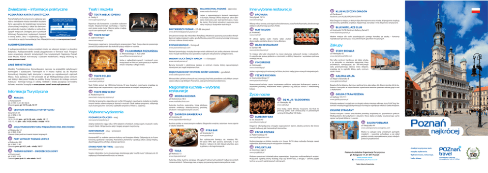 Zwiedzanie – informacje praktyczne Teatr i muzyka POZNAŃSKA KARTA TURYSTYCZNA 29 TEATR WIELKI (OPERA) Poznańska Karta Turystyczna to najlepszy sposób na zwiedzanie miasta niewielkim kosztem. Karta upoważnia do bezpłatnego korzystania z komunikacji miejskiej, a także do darmowego wejścia do muzeów i rabatów w wielu atrakcyjnych miejscach. Dostępna jest w punktach Informacji Turystycznej i wybranych hotelach w wersji jedno-, dwu- i trzydniowej, ulgowej i normalnej w opcji z komunikacją i bez. Więcej informacji na www.poznan.travel. AUDIOPRZEWODNIKI www.malta-festival.pl Jeden z najważniejszych festiwali teatralnych w Europie, którego oferta obejmuje takie dziedziny twórczości, jak: teatr/performance, muzykę, taniec, film/sztuki wizualne i wykracza poza ramy instytucji i budynków teatralnych. ul. Fredry 9 www.opera.poznan.pl Repertuar dla koneserów z szerokim wyborem klasyki. Eksperymentuje wychodząc z repertuarem poza swoje mury. Obecnie jedna z najlepszych scen operowych w kraju. 30 TEATR NOWY Nowoczesny repertuar z różnorodnymi propozycjami. Teatr Nowy obecnie prezentuje ponad 350 przedstawień dla około 80 tysięcy widzów w sezonie. 31 FILHARMONIA POZNAŃSKA ul. Wieniawskiego 1, Aula UAM www.filharmonia.poznan.pl Jedna z najbardziej znanych i cenionych scen muzycznych w Polsce. Często goszczą tu wybitni artyści i zespoły z całego świata. LINIE TURYSTYCZNE DNI TWIERDZY POZNAŃ – 27-28 sierpień www.dnitwierdzypoznan.poznan.pl Dwudniowe święto dla miłośników fortyfikacji. Możliwość poznania poznańskich fortyfikacji od najdawniejszych wałów grodu Mieszka, przez XIX-wieczną twierdzę fortową po schrony z okresu zimnej wojny. ul. Dąbrowskiego 5 www.teatrnowy.pl Z audioprzewodnikami można zwiedzać miasto we własnym tempie i w dowolnej kolejności. Audioprzewodniki zostały przygotowane w formacie mp3. Przygotowano propozycję czterech tematycznych tras turystycznych: Najstarszy Poznań, Stare Miasto, Poznań XIX-wieczny i Szlakiem Modernizmu. Więcej informacji na www.poznan.travel. Miejskie Przedsiębiorstwo Komunikacyjne zaprasza na przejażdżki zabytkowymi tramwajami i autobusami. Tramwajem nr 0 można wybrać się do Muzeum Komunikacji Miejskiej bądź skorzystać z objazdu po najciekawszych częściach Miasta. Trasa autobusu nr 100 prowadzi od pl. Wielkopolskiego przez centrum, nad Maltę i dalej przez Śródkę (w pobliżu Bramy Poznania) do ścisłego centrum. Autobusy i tramwaje kursują w soboty, niedziele i święta począwszy od kwietnia do końca września. Szczegóły na www.poznan.travel i www.mpk.poznan.pl. MALTAFESTIVAL POZNAŃ – czerwiec 32 TEATR POLSKI IMIENINY ULICY ŚWIĘTY MARCIN – 11 listopad www.zamek.poznan.pl 42 YEŻYCE KUCHNIA 24 ARKADIA 34 MODRA KUCHNIA ul. Głogowska 14 tel. 61 869 20 84 Otwarte tylko podczas trwania imprez targowych. 27 PORT LOTNICZY POZNAŃ-ŁAWICA ul. Bukowska 285 tel. 61 849 21 40 Otwarte: pon.-pt. 8-21, sob. - niedz. 10-17 28 POZNAŃ GŁÓWNY − DWORZEC KOLEJOWY ul. Dworcowa 2 tel. 61 633 10 16 Otwarte: pon.-pt 8-21, sob.-niedz. 10-17 Jedyny weekend w ciągu roku z 50% rabatem w hotelach, restauracjach, muzeach i wielu innych. Około 180 partnerów akcji i bogaty program turystyczny. Kuchnia polska w nowoczesnym wydaniu. Eleganckie wnętrze, sezonowe menu oparte o lokalne składniki. KONTENERART – maj - wrzesień 36 PYRA BAR www.kontenerart.pl ul. Strzelecka 13 www.pyrabar.pl KontenerART to mobilne centrum kultury nad brzegiem Warty. Odbywają się tu liczne koncerty, spotkania i warsztaty. Poznańskie „Kontenery” sąsiadują także z plażą miejską, dopełniającą letnią ofertę o atrakcje sportowe. Bar stylistycznie bawiący się estetyką PRL. W karcie 99% dań zawiera ziemniaki, w tym lokalne i lubiane do dziś klasyki: plyndze, pyra z gzikiem, a do tego kompocik. ETHNO PORT FESTIWAL – czerwiec www.ethnoport.pl Święto miłośników nurtu muzycznego określanego jako “world music”. Zaliczany do 25 najlepszych festiwali world music na świecie. 37 TOGA pl. Wolności 13 www.toga.poznan.pl Autorska, lekka kuchnia czerpiąca z bogatych kulinarnych polskich tradycji dworskich i mieszczańskich. Odtwarzają stare przepisy, przywracają zapomniane polskie smaki. ul. Półwiejska 42 www.starybrowar5050.com Nie tylko centrum handlowe, ale także sztuka, a to wszystko w otoczeniu najwyższej klasy architektury nawiązującej do XIX-wiecznego stylu przemysłowego. Oprócz wielu sklepów, znajdują się tu ogródki, kluby, park, centrum sztuki i hotel. 50 GALERIA MALTA Nowoczesna kuchnia, często inspirowana polskimi tradycjami kulinarnymi, oparta o sezonowe produkty. Niebanalne menu sprawdzi się podczas lunchu i nieformalnej kolacji. Bogata oferta sklepów, darmowy parking, kino, plac zabaw dla dzieci, szeroka oferta kulinarna. A wszystko w bezpośrednim sąsiedztwie terenów sportowo-rekreacyjnych nad J. Maltańskim. Życie nocne 51 GIEŁDA STARA RZEŹNIA ul. Półwiejska 42 www.sqklub.pl Autorska kuchnia regionalna, która zdobywa uznanie smakoszy autentycznością, prostotą, smakiem i niewygórowanymi cenami. ul. Kościelna 43 www.zagrodabamberska.pl Zakupy ul. Abpa A. Baraniaka 8 www.galeriamalta.pl 43 SQ KLUB / SŁODOWNIA www.poznanzapolceny.pl Idealne miejsce dla osób poszukujących żywego kontaktu ze sztuką – koncerty największych gwiazd jazzu oraz pokrewnych gatunków muzycznych. ul. Szamarzewskiego 17 www.yezycekuchnia.pl ul. Mickiewicza 18/2 www.modrakuchnia.com 35 ZAGRODA BAMBERSKA 48 BLUE NOTE JAZZ CLUB 49 STARY BROWAR To miejsce dla ludzi otwartych na nowe doznania, ciekawych świata i odważnych. A wszystko za sprawą jedzenia w ciemności, w której klasyczne i wyszukane potrawy smakują inaczej. Jedna z najmniejszych restauracji w Polsce, kuchnia tradycyjna w nowych interpretacjach. 33 TEATR MUZYCZNY 26 MIĘDZYNARODOWE TARGI POZNAŃSKIE (HOL WSCHODNI) W ofercie oprócz sushi można także znaleźć dania ciepłe, orientalne desery i menu dziecięce. MIĘ