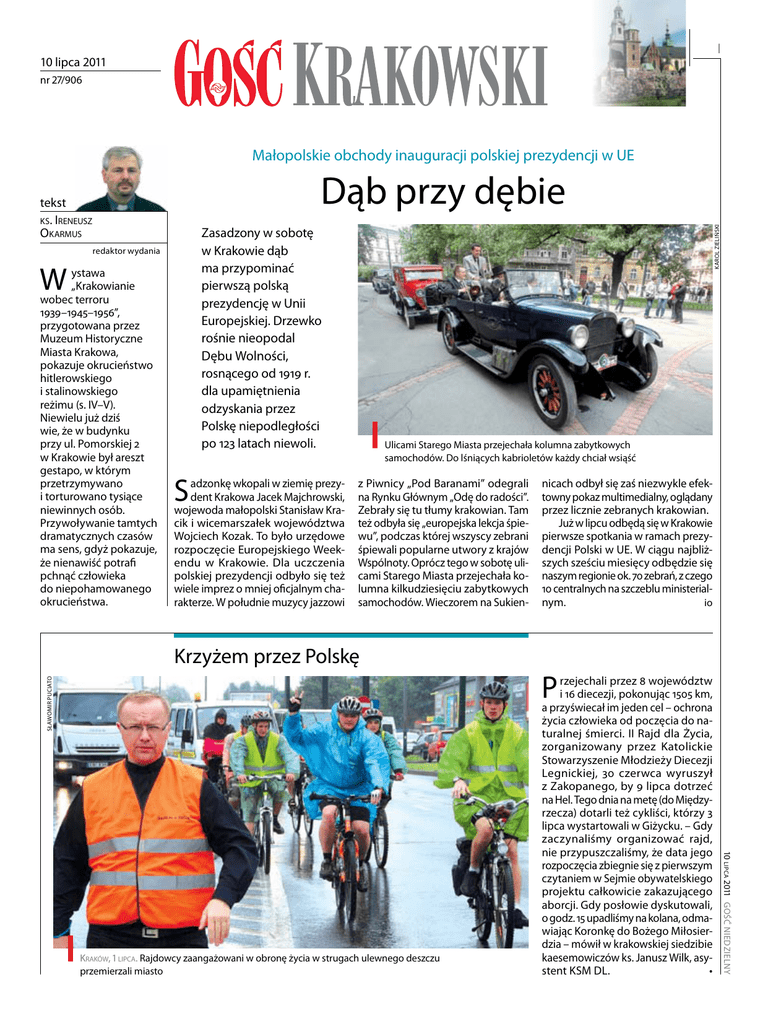 I 10 lipca 2011 nr 27/906 Małopolskie obchody inauguracji polskiej prezydencji w UE Zasadzony w sobotę w Krakowie dąb ma przypominać pierwszą polską prezydencję w Unii Europejskiej. Drzewko rośnie nieopodal Dębu Wolności, rosnącego od 1919 r. dla upamiętnienia odzyskania przez Polskę niepodległości po 123 latach niewoli. redaktor wydania W ystawa „Krakowianie wobec terroru 1939–1945–1956”, przygotowana przez Muzeum Historyczne Miasta Krakowa, pokazuje okrucieństwo hitlerowskiego i stalinowskiego reżimu (s. IV–V). Niewielu już dziś wie, że w budynku przy ul. Pomorskiej 2 w Krakowie był areszt gestapo, w którym przetrzymywano i torturowano tysiące niewinnych osób. Przywoływanie tamtych dramatycznych czasów ma sens, gdyż pokazuje, że nienawiść potrafi pchnąć człowieka do niepohamowanego okrucieństwa. Karol Zieliński Dąb przy dębie tekst ks. Ireneusz Okarmus S adzonkę wkopali w ziemię prezydent Krakowa Jacek Majchrowski, wojewoda małopolski Stanisław Kracik i wicemarszałek województwa Wojciech Kozak. To było urzędowe rozpoczęcie Europejskiego Weekendu w Krakowie. Dla uczczenia polskiej prezydencji odbyło się też wiele imprez o mniej oficjalnym charakterze. W południe muzycy jazzowi Ulicami Starego Miasta przejechała kolumna zabytkowych samochodów. Do lśniących kabrioletów każdy chciał wsiąść z Piwnicy „Pod Baranami” odegrali na Rynku Głównym „Odę do radości”. Zebrały się tu tłumy krakowian. Tam też odbyła się „europejska lekcja śpiewu”, podczas której wszyscy zebrani śpiewali popularne utwory z krajów Wspólnoty. Oprócz tego w sobotę ulicami Starego Miasta przejechała kolumna kilkudziesięciu zabytkowych samochodów. Wieczorem na Sukien- Sławomir Puciato Krzyżem przez Polskę P rzejechali przez 8 województw i 16 diecezji, pokonując 1505 km, a przyświecał im jeden cel – ochrona życia człowieka od poczęcia do naturalnej śmierci. II Rajd dla Życia, zorganizowany przez Katolickie Stowarzyszenie Młodzieży Diecezji Legnickiej, 30 czerwca wyruszył z Zakopanego, by 9 lipca dotrzeć na Hel. Tego dnia na metę (do Międzyrzecza) dotarli też cykliści, którzy 3 lipca wystartowali w Giżycku. – Gdy zaczynaliśmy organizować rajd, nie przypuszczaliśmy, że data jego rozpoczęcia zbiegnie się z pierwszym czytaniem w Sejmie obywatelskiego projektu całkowicie zakazującego aborcji. Gdy posłowie dyskutowali, o godz. 15 upadliśmy na kolana, odmawiając Koronkę do Bożego Miłosierdzia – mówił w krakowskiej siedzibie kaesemowiczów ks. Janusz Wilk, asystent KSM DL. • 10 lipca 2011 Gość Niedzielny Kraków, 1 lipca. Rajdowcy zaangażowani w obronę życia w strugach ulewnego deszczu przemierzali miasto nicach odbył się zaś niezwykle efektowny pokaz multimedialny, oglądany przez licznie zebranych krakowian. Już w lipcu odbędą się w Krakowie pierwsze spotkania w ramach prezydencji Polski w UE. W ciągu najbliższych sześciu miesięcy odbędzie się naszym regionie ok. 70 zebrań, z czego 10 centralnych na szczeblu ministerialnym. io gość Krakowski gość Krakowski Odwiedziny bratanków Kolekcjoner i piłsudczyk W ęgry –K r aków . Ponad 700 pielgrzymów z Węgier przybyło do Krakowa, aby symbolicznie przekazać Polakom przewodnictwo w Unii Europejskiej. – Łączą nas wspólna historia, święci, wiara chrześcijańska i bliskość geograficzna. Węgry stały się przykładem dla Europy, przypominając jej, że ma chrześcijańskie korzenie i na nich ma budować przyszłość K raków. W wieku prawie 81 lat zmarł znany kolekcjoner pamiątek patriotycznych Zdzisław Ruszel. Mechanik samochodowy z zawodu, od kilkudziesięciu lat gromadził przedmioty związane z historią Polski: dokumenty, fotografie, pocztówki, odznaki, obrazy. Zbierał również obrazki święte, krucyfiksy i kropielnice. – Posiadał w swoich zbiorach wiele prawdziwych perełek kolekcjonerskich, m.in. insygnia Orderu Orła Białego, które prawdopodobnie należały kiedyś do Wincentego Witosa. Ja zaś wymieniłem kilka moich odznak pułkowych na bardzo rzadką srebrną odznakę okupacyjnej szkoły pożarnictwa, będącej przykrywką dla podchorążówki Armii Krajowej – mówi Zbigniew – mówił kard. Stanisław Dziwisz, witając ich w bazylice Mariackiej. Po Mszy św. pielgrzymi przeszli do katedry wawelskiej, gdzie złożyli wieńce na grobach św. Jadwigi Królowej i Stefana Batorego. Uczestnicy Narodowej Pielgrzymki Węgrów (prowadzonej przez węgierskich biskupów) oprócz Krakowa odwiedzili również Częstochowę i Stary Sącz. mł Gancarz, kolekcjoner pamiątek strażackich z Rzeszowa. Dzięki zbierackiej pasji Ruszela ocalało przed zniszczeniem wiele przedmiotów cennych dla badania historii Polski. Nie był typem kolekcjonera strzegącego zazdrośnie swoich zbiorów. Udostępniał je, organizując kilkaset wystaw. Był szczególnie przywiązany do marszałka Piłsudskiego. Co roku w sierpniu, przed Marszem Szlakiem I Kompanii Kadrowej, organizował wystawę pamiątek związanych z Marszałkiem, należał również do Komitetu Opieki nad Kopcem Piłsudskiego. Za swoją działalność został w 2006 r. uhonorowany przez prezydenta Krakowa odznaką „Honoris Gratia”. bg Studencki Nobel Tadeusz Warczak K raków. Paweł Matusik, student VI roku kierunku lekarskiego Collegium Medicum UJ, zdobył Studenckiego Nobla 2011, wygrywając 3. edycję konkursu, organizowanego przez Niezależne Zrzeszenie Studentów. Polega on na wyborze i promowaniu utalentowanych studentów, zarówno Węgrzy przyjechali do Polski z nadzieją, że nasz kraj podczas prezydencji w UE będzie kontynuować dzieło Budapesztu – pokazywanie Europie jej prawdziwego, duchowego fundamentu oraz wierności chrześcijańskim wartościom z uczelni państwowych, jak i z prywatnych szkół wyższych w całej Polsce. Paweł Matusik, będący stypendystą Fundacji na Rzecz Nauki Polskiej, w listopadzie 2010 r. otrzymał t