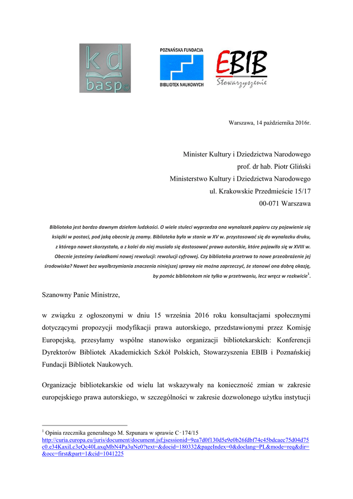 Warszawa, 14 października 2016r. Minister Kultury i Dziedzictwa Narodowego prof. dr hab. Piotr Gliński Ministerstwo Kultury i Dziedzictwa Narodowego ul. Krakowskie Przedmieście 15/17 00-071 Warszawa Biblioteka jest bardzo dawnym dziełem ludzkości. O wiele stuleci wyprzedza ona wynalazek papieru czy pojawienie się książki w postaci, pod jaką obecnie ją znamy. Biblioteka była w stanie w XV w. przystosować się do wynalazku druku, z którego nawet skorzystała, a z kolei do niej musiało się dostosować prawo autorskie, które pojawiło się w XVIII w. Obecnie jesteśmy świadkami nowej rewolucji: rewolucji cyfrowej. Czy biblioteka przetrwa to nowe przeobrażenie jej środowiska? Nawet bez wyolbrzymiania znaczenia niniejszej sprawy nie można zaprzeczyć, że stanowi ona dobrą okazję, 1 by pomóc bibliotekom nie tylko w przetrwaniu, lecz wręcz w rozkwicie . Szanowny Panie Ministrze, w związku z ogłoszonymi w dniu 15 września 2016 roku konsultacjami społecznymi dotyczącymi propozycji modyfikacji prawa autorskiego, przedstawionymi przez Komisję Europejską, przesyłamy wspólne stanowisko organizacji bibliotekarskich: Konferencji Dyrektorów Bibliotek Akademickich Szkół Polskich, Stowarzyszenia EBIB i Poznańskiej Fundacji Bibliotek Naukowych. Organizacje bibliotekarskie od wielu lat wskazywały na konieczność zmian w zakresie europejskiego prawa autorskiego, w szczególności w zakresie dozwolonego użytku instytucji 1 Opinia rzecznika generalnego M. Szpunara w sprawie C‑174/15 http://curia.europa.eu/juris/document/document.jsf;jsessionid=9ea7d0f130d5e9e0b26fdbf74c45bdcaec75d04d75 c0.e34KaxiLc3eQc40LaxqMbN4Pa3uNe0?text=&docid=180332&pageIndex=0&doclang=PL&mode=req&dir= &occ=first&part=1&cid=1041225 kultury a także dozwolonego użytku edukacyjnego2. Traktujemy nasze uwagi jako punkt wyjściowy do dalszej, pogłębionej dyskusji zarówno na poziomie krajowym, jak i europejskim. Ze względu na dość krótki czas konsultacji i złożoność problematyki, w stanowisku sygnalizujemy najważniejsze problemy, deklarując równocześnie gotowość udziału w dalszych pracach nad tą niezmiernie ważną materią. Mamy nadzieję, że zaprezentowane poniżej uwagi znajdą swój wyraz w przygotowywanym przez Ministerstwo stanowisku dla Komisji Europejskiej. Przedstawiony do konsultacji i opiniowania pakiet zmian przyjmujemy z dużą rezerwą. Propozycje Komisji służą przede wszystkim tylko jednej grupie interesariuszy – wydawcom3. Głównym instrumentem prawnym modernizacji prawa autorskiego ma być dyrektywa w sprawie praw autorskich na jednolitym rynku cyfrowym. Już sam tytuł projektowanej regulacji wskazuje, że jest ona nakierowana wyłącznie na treści cyfrowe, a zatem ma stosunkowo wąski zakres i tylko w części może odpowiadać na problemy zgłaszane przez środowiska bibliotekarzy, naukowców i instytucji kultury. We wstępie do projektu dyrektywy zwraca się uwagę, że w zakresie dozwolonego użytku Komisja zidentyfikowała trzy obszary interwencji: cyfrowe i transgraniczne sposoby korzystania w dziedzinie edukacji, eksploracja tekstów i danych w dziedzinie badań naukowych oraz zachowanie dziedzictwa kulturowego. Niestety, propozycje rozwiązania problemów w tych obszarach nie tylko są ograniczone, ale również niewystarczające, a w wielu przypadkach wsteczne w stosunku do już istniejących. Brakuje nam również odpowiedzi na problemy związane z użyczaniem kopii cyfrowych, międzynarodową usługa dostarczania dokumentów (document delivery), współpracy bibliotek w ramach zamkniętych sieci (shared preservation networks) a także redefinicji wyposażonych terminali (dedicated 2 Były to stanowiska kierowane zarówno do MKiDZN w trakcie licznych konsultacji nowelizacji ustawy o prawie autorskim oraz konsultacji europejskich, jak również bezpośrednio do Komisji Europejskiej, przede wszystkim stanowisko przesłane w odpowiedzi na konsultacje dotyczące dozwolonego użytku publicznego, ogłoszone 29 maja 2013r. - http://www.ebib.pl/wp-content/uploads/2013/07/Stanowisko-organizacjibibliotekarskich-w-sprawie-konsultacji-spo%C5%82ecznyc....pdf 3 Rzeczpospolita w tytułach artykułów komentujących pakiet wskazuje wprost na tę grupę beneficjentów: Bruksela w sojuszu z wydawcami (Rzeczpospolita, 15/09/2016 http://www.rp.pl/Opinie/309159885-Bruksela-wsojuszu-z-wydawcami.html ), Wydawcy za unijnym wsparciem (Rzeczpospolita, 23/09/2016 http://www.rp.pl/Prawo-autorskie/309239968-Prawo-autorskie-wydawcy-za-unijnym-wsparciem.html) terminals) z dyrektywy INFOSOC. Potrzebę zmian legislacyjnych w tych obszarach nasze instytucje zgłaszały w wielokrotnie w trakcie europejskich konsultacji4. W 2013 r. zakończył się dialog „Licencje dla Europy”, którego efektem miały być praktyczne rozwiązania, które zwiększą pewność właścicieli praw autorskich oraz pozytywnie wpłyną na różnorodność oferty kulturalnej w Internecie a uczestnicy dialogu zobowiązali się nadal współpracować nad rozwiązaniem problemów obywateli Europy m.in. w zakresie transgranicznego dostępu do usług, treści generowanych przez użytkowników oraz mikrolicencji. Wiele znaczącym faktem jest, iż w 2016 r. Komisja jest zmuszona, w miejsce owych dobrowolnych porozumień i praktycznych rozwiązań, do wprowadzania regulacji prawnych, niestety ponownie opartych przede wszystkim na umowach licencyjnych5. Wynika to ze sposobu ukształtowania dozwolonego użytku w cyfrowej i transgranicznej działalności dydaktycznej, rozwiązanie licencyjne jest wprost zaproponowane dla udostępniania utworów niedostępnych w obrocie handlowym. Dawno zapowiadana zmiana europejskiego prawa autorskiego miała ograniczyć różnice między krajowymi systemami prawa autorskiego i umożliwić szerszy dostęp online do utworów w całej Unii Europejskiej (w tym za pomocą środków harmonizacji). W projekcie dyrektywy zamiast obligatoryjnej harmonizacji mamy swobodę w wyborze instrume