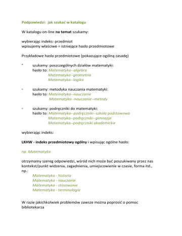 Podpowiedzi: jak szukać w katalogu W katalogu on-line na temat szukamy: wybierając indeks: przedmiot wpisujemy właściwe = istniejące hasło przedmiotowe Przykładowe hasła przedmiotowe (pokazujące ogólną zasadę) ° szukamy: poszczególnych działów matematyki: hasło to: Matematyka--algebra Matematyka--geometria Matematyka--logika ◦ szukamy: metodyka nauczania matematyki: hasło to: Matematyka--nauczanie Matematyka--nauczanie--metody ◦ szukamy: podręczniki do matematyki: hasło to: Matematyka--podręczniki--szkoła podstawowa Matematyka--podręczniki--gimnazja Matematyka--podręczniki akademickie wybierając indeks: LKHW - indeks przedmiotowy ogólny i wpisując ogólne hasło: np. Matematyka otrzymamy szereg odpowiedzi, wśród nich może być poszukiwany przez nas kontekst/punkt widzenia, zagadnienia, umiejscowienie w czasie, forma itd., np.: Matematyka - historia Matematyka - nauczanie Matematyka - stosowanie Matematyka - terminologia W razie jakichkolwiek problemów zawsze można poprosić o pomoc bibliotekarza