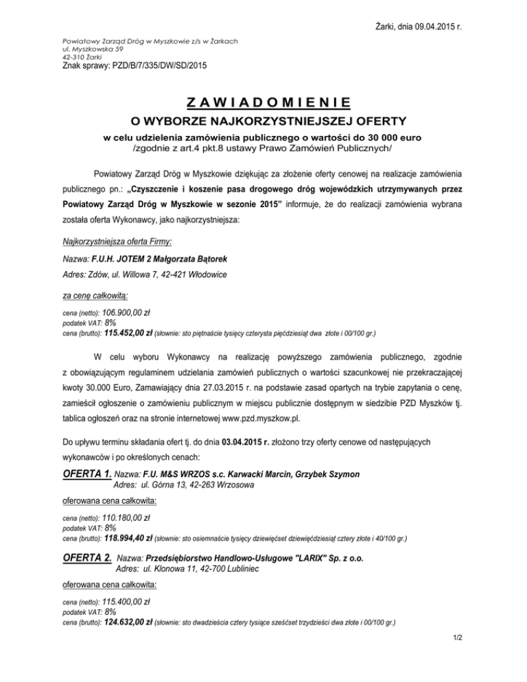Żarki, dnia 09.04.2015 r. Powiatowy Zarząd Dróg w Myszkowie z/s w Żarkach ul. Myszkowska 59 42-310 Żarki Znak sprawy: PZD/B/7/335/DW/SD/2015 ZAWIADOMIENIE O WYBORZE NAJKORZYSTNIEJSZEJ OFERTY w celu udzielenia zamówienia publicznego o wartości do 30 000 euro /zgodnie z art.4 pkt.8 ustawy Prawo Zamówień Publicznych/ Powiatowy Zarząd Dróg w Myszkowie dziękując za złożenie oferty cenowej na realizacje zamówienia publicznego pn.: „Czyszczenie i koszenie pasa drogowego dróg wojewódzkich utrzymywanych przez Powiatowy Zarząd Dróg w Myszkowie w sezonie 2015” informuje, że do realizacji zamówienia wybrana została oferta Wykonawcy, jako najkorzystniejsza: Najkorzystniejsza oferta Firmy: Nazwa: F.U.H. JOTEM 2 Małgorzata Bątorek Adres: Zdów, ul. Willowa 7, 42-421 Włodowice za cenę całkowitą: cena (netto): 106.900,00 zł podatek VAT: 8% cena (brutto): 115.452,00 zł (słownie: sto piętnaście tysięcy czterysta pięćdziesiąt dwa złote i 00/100 gr.) W celu wyboru Wykonawcy na realizację powyższego zamówienia publicznego, zgodnie z obowiązującym regulaminem udzielania zamówień publicznych o wartości szacunkowej nie przekraczającej kwoty 30.000 Euro, Zamawiający dnia 27.03.2015 r. na podstawie zasad opartych na trybie zapytania o cenę, zamieścił ogłoszenie o zamówieniu publicznym w miejscu publicznie dostępnym w siedzibie PZD Myszków tj. tablica ogłoszeń oraz na stronie internetowej www.pzd.myszkow.pl. Do upływu terminu składania ofert tj. do dnia 03.04.2015 r. złożono trzy oferty cenowe od następujących wykonawców i po określonych cenach: OFERTA 1. Nazwa: F.U. M&S WRZOS s.c. Karwacki Marcin, Grzybek Szymon Adres: ul. Górna 13, 42-263 Wrzosowa oferowana cena całkowita: cena (netto): 110.180,00 zł podatek VAT: 8% cena (brutto): 118.994,40 zł (słownie: sto osiemnaście tysięcy dziewięćset dziewięćdziesiąt cztery złote i 40/100 gr.) OFERTA 2. Nazwa: Przedsiębiorstwo Handlowo-Usługowe "LARIX" Sp. z o.o. Adres: ul. Klonowa 11, 42-700 Lubliniec oferowana cena całkowita: cena (netto): 115.400,00 zł podatek VAT: 8% cena (brutto): 124.632,00 zł (słownie: sto dwadzieścia cztery tysiące sześćset trzydzieści dwa złote i 00/100 gr.) 1/2 OFERTA 3. Nazwa: F.U.H. JOTEM 2 Małgorzata Bątorek Adres: Zdów, ul. Willowa 7, 42-421 Włodowice oferowana cena całkowita: cena (netto): 106.900,00 zł podatek VAT: 8% cena (brutto): 115.452,00 zł (słownie: sto piętnaście tysięcy czterysta pięćdziesiąt dwa złote i 00/100 gr.) W związku z powyższym Zamawiający na podstawie zasad opartych na trybie zapytania o cenę, gdzie jedynym kryterium przy wyborze najkorzystniejszej oferty jest najniższa cena ,wybrał do realizacji zadania Wykonawcę jak określono wyżej, tj: F.U.H. JOTEM 2 Małgorzata Bątorek, Zdów, ul. Willowa 7, 42-421 Włodowice. Zamawiający dnia 24.03.2015 r. na podstawie kalkulacji cenowej ustalił całkowitą szacunkową wartość zamówienia jaką zamierzał przeznaczyć na jego sfinansowanie na kwotę: 119.000,00 zł /Netto/ + 8%VAT = 128.520,00 zł /Brutto/. inż. Mariusz MUSIALIK Dyrektor Powiatowego Zarządu Dróg w Myszkowie Otrzymują: 1. Wykonawcy, którzy złożyli oferty 2. Strona internetowa Zamawiającego- www.pzd.myszkow.pl 3. Tablica ogłoszeń 2/2