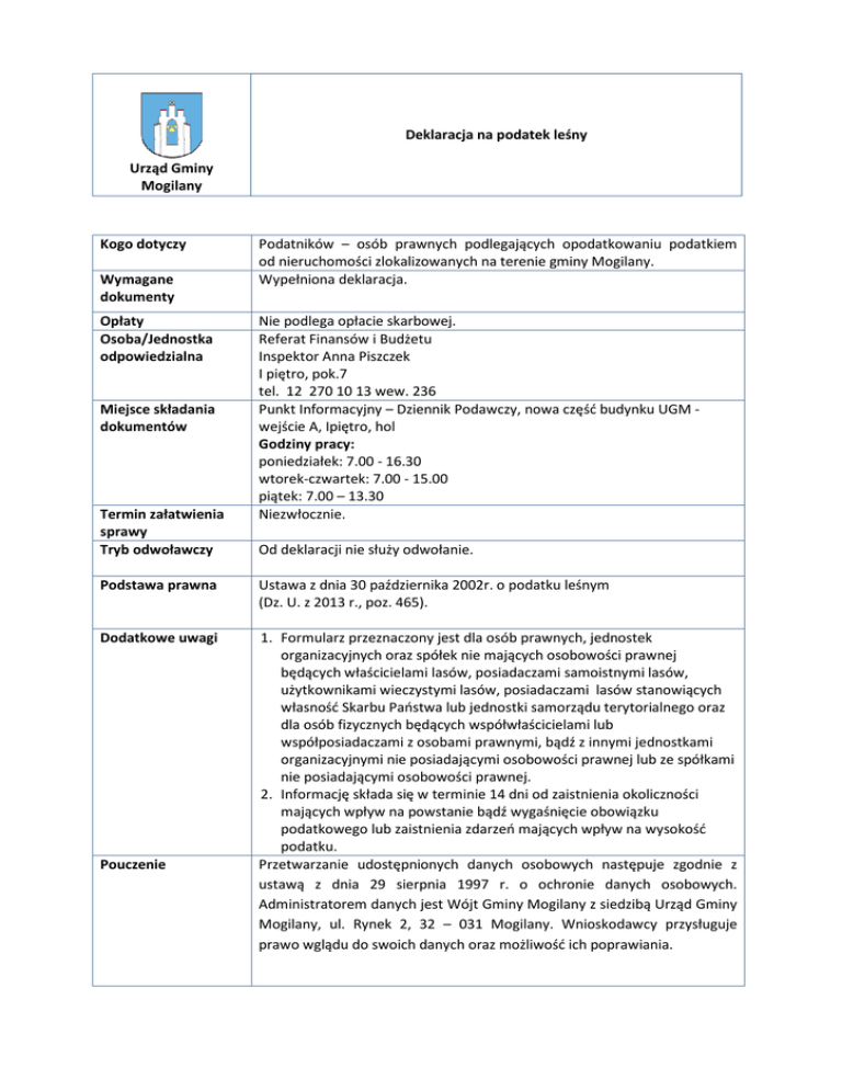 Deklaracja na podatek leśny Urząd Gminy Mogilany Kogo dotyczy Wymagane dokumenty Opłaty Osoba/Jednostka odpowiedzialna Miejsce składania dokumentów Termin załatwienia sprawy Tryb odwoławczy Podatników – osób prawnych podlegających opodatkowaniu podatkiem od nieruchomości zlokalizowanych na terenie gminy Mogilany. Wypełniona deklaracja. Nie podlega opłacie skarbowej. Referat Finansów i Budżetu Inspektor Anna Piszczek I piętro, pok.7 tel. 12 270 10 13 wew. 236 Punkt Informacyjny – Dziennik Podawczy, nowa część budynku UGM wejście A, Ipiętro, hol Godziny pracy: poniedziałek: 7.00 - 16.30 wtorek-czwartek: 7.00 - 15.00 piątek: 7.00 – 13.30 Niezwłocznie. Od deklaracji nie służy odwołanie. Podstawa prawna Ustawa z dnia 30 października 2002r. o podatku leśnym (Dz. U. z 2013 r., poz. 465). Dodatkowe uwagi 1. Formularz przeznaczony jest dla osób prawnych, jednostek organizacyjnych oraz spółek nie mających osobowości prawnej będących właścicielami lasów, posiadaczami samoistnymi lasów, użytkownikami wieczystymi lasów, posiadaczami lasów stanowiących własność Skarbu Państwa lub jednostki samorządu terytorialnego oraz dla osób fizycznych będących współwłaścicielami lub współposiadaczami z osobami prawnymi, bądź z innymi jednostkami organizacyjnymi nie posiadającymi osobowości prawnej lub ze spółkami nie posiadającymi osobowości prawnej. 2. Informację składa się w terminie 14 dni od zaistnienia okoliczności mających wpływ na powstanie bądź wygaśnięcie obowiązku podatkowego lub zaistnienia zdarzeń mających wpływ na wysokość podatku. Przetwarzanie udostępnionych danych osobowych następuje zgodnie z ustawą z dnia 29 sierpnia 1997 r. o ochronie danych osobowych. Administratorem danych jest Wójt Gminy Mogilany z siedzibą Urząd Gminy Mogilany, ul. Rynek 2, 32 – 031 Mogilany. Wnioskodawcy przysługuje prawo wglądu do swoich danych oraz możliwość ich poprawiania. Pouczenie